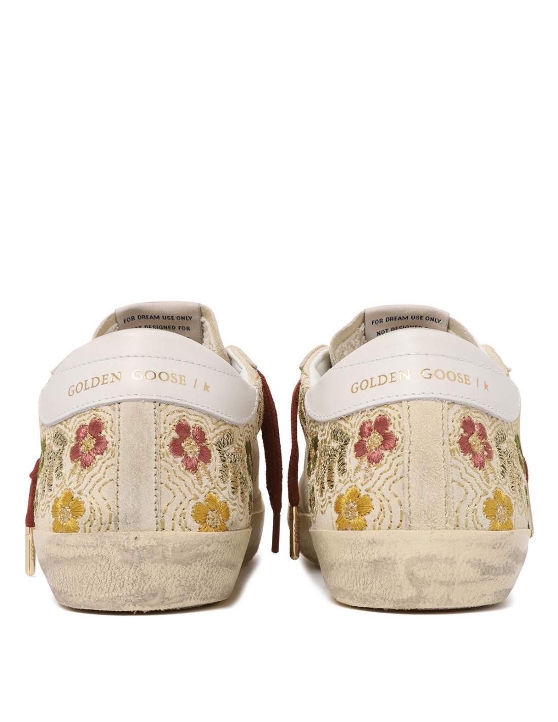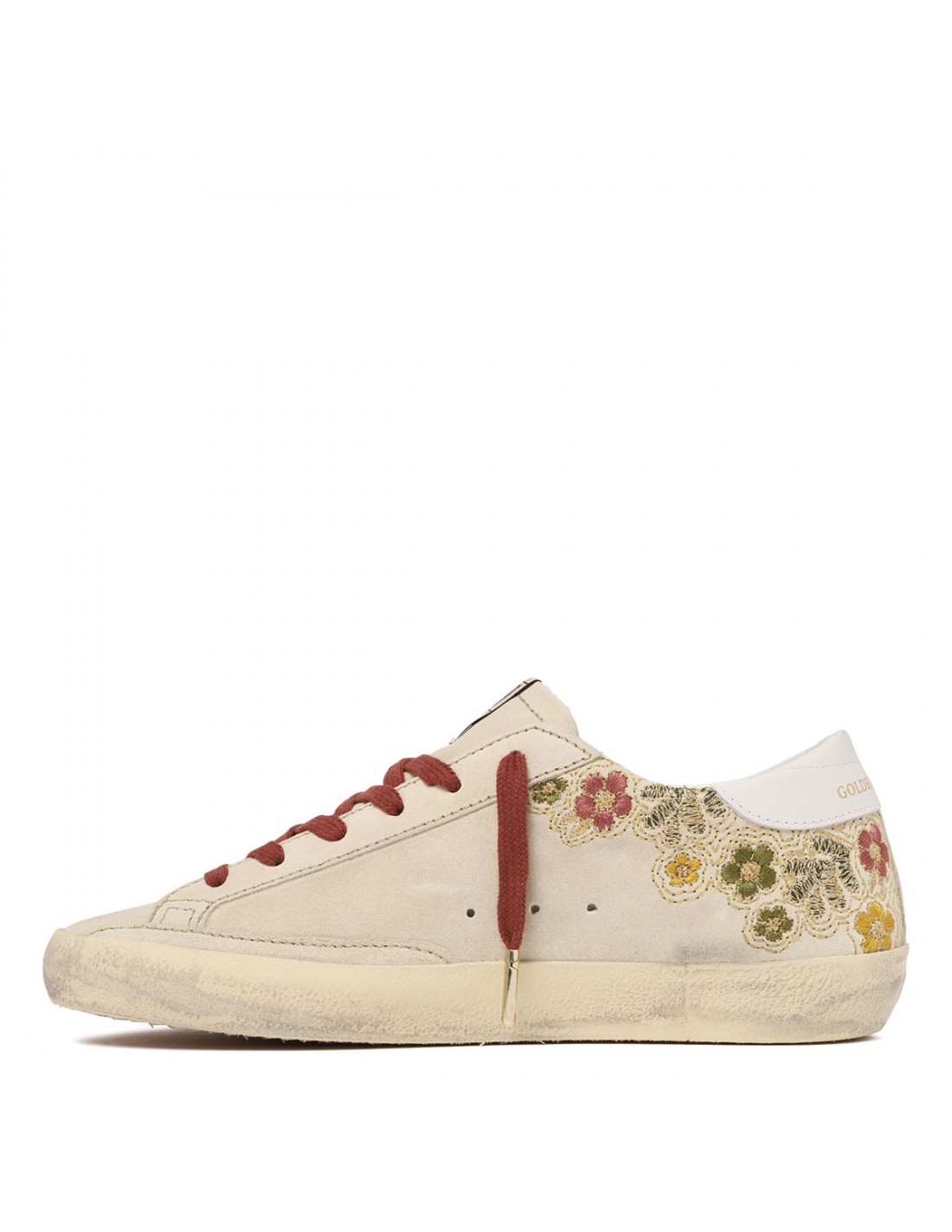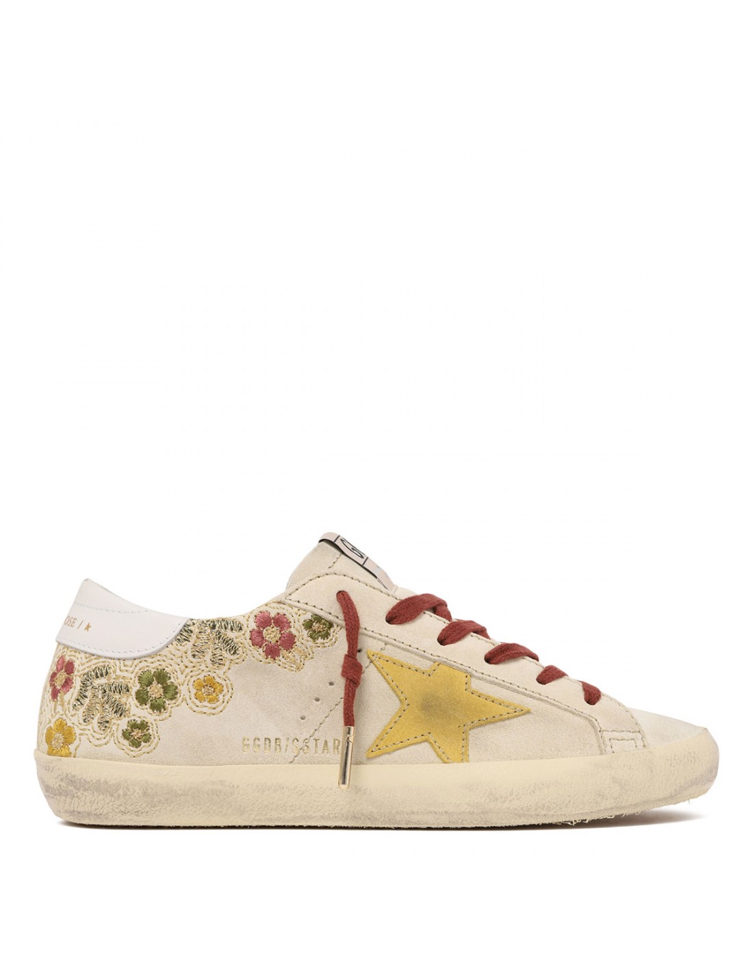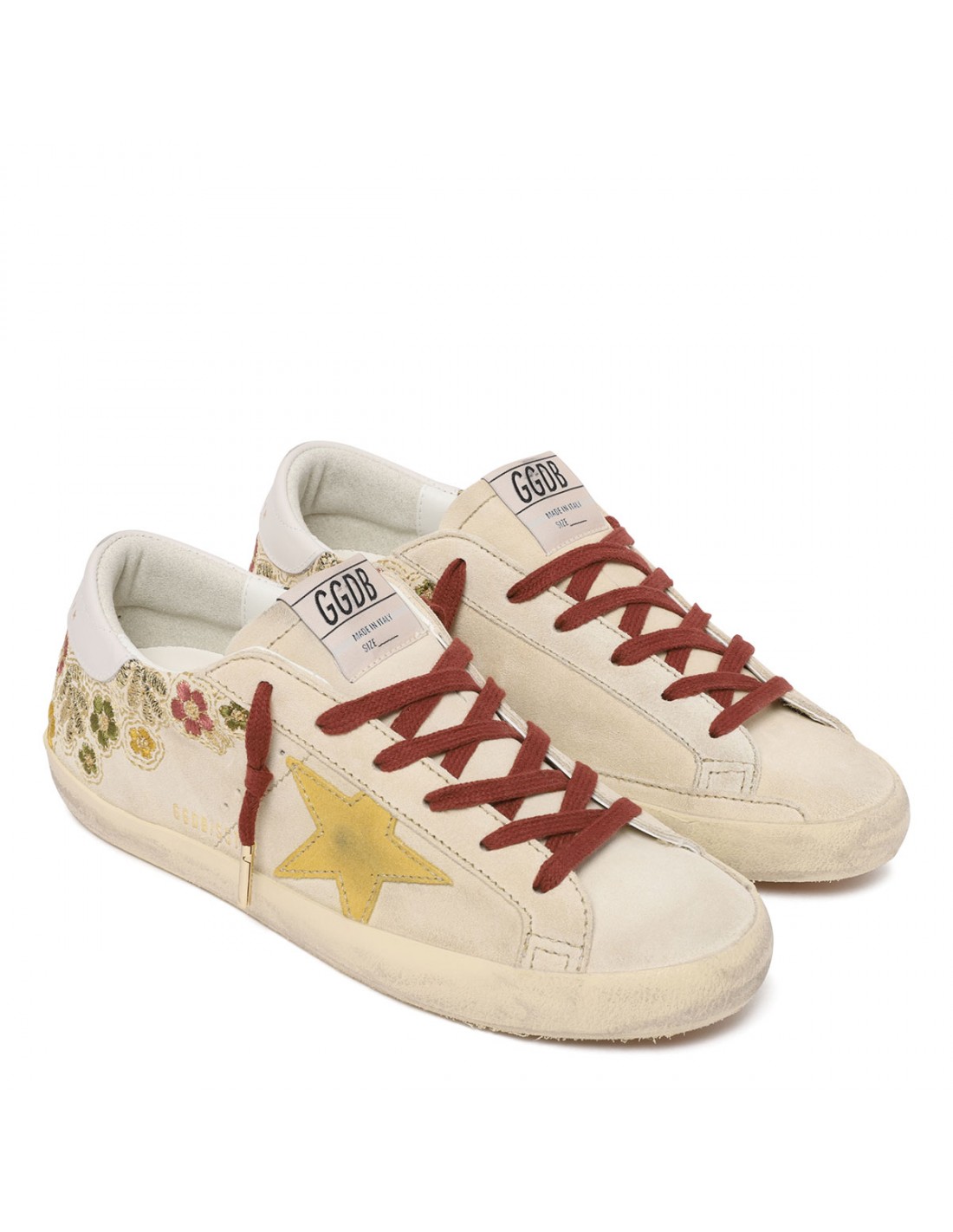 Beige suede leather SuperStar sneakers from Golden Goose featuring colored flowers embroideries, tongue with logo tag, honey hue suede star signature, bordeaux laces, round toe, contrasting heel tab with logo, vintage treatment, logo embossed on side, rubber sole.