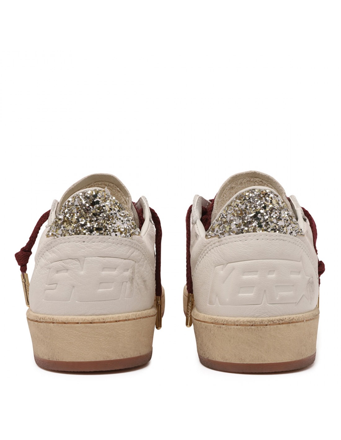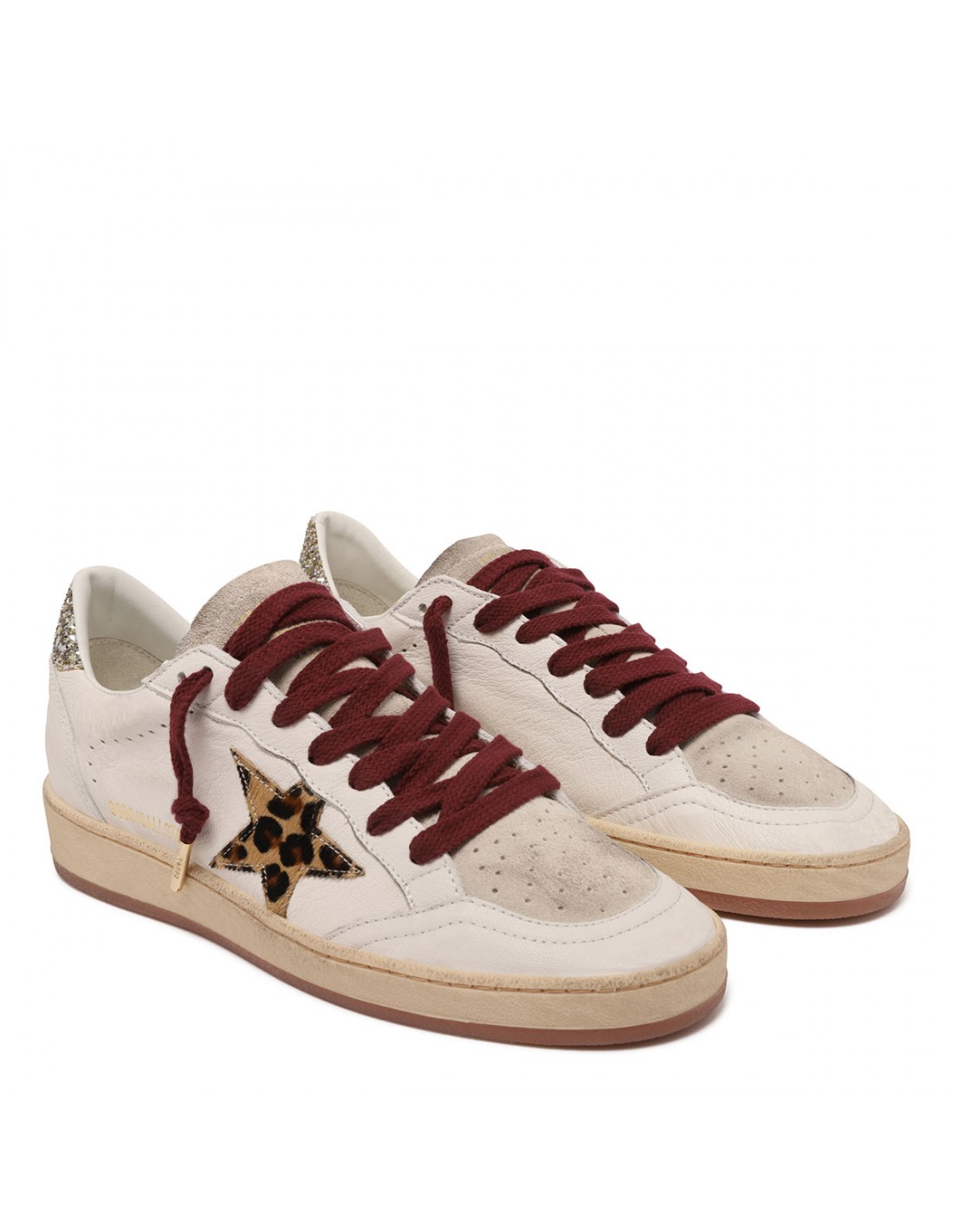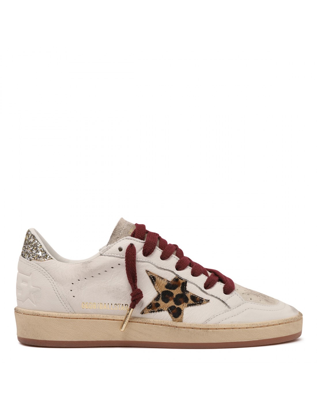 White leather Ballstar sneakers from Golden Goose featuring leopard calf-hairy star on side, gray suede tongue, platinum glittery heel tab, bordeaux laces closure, round toe, sneakers lettering on heel, logo on side, vintage effect, rubber sole.