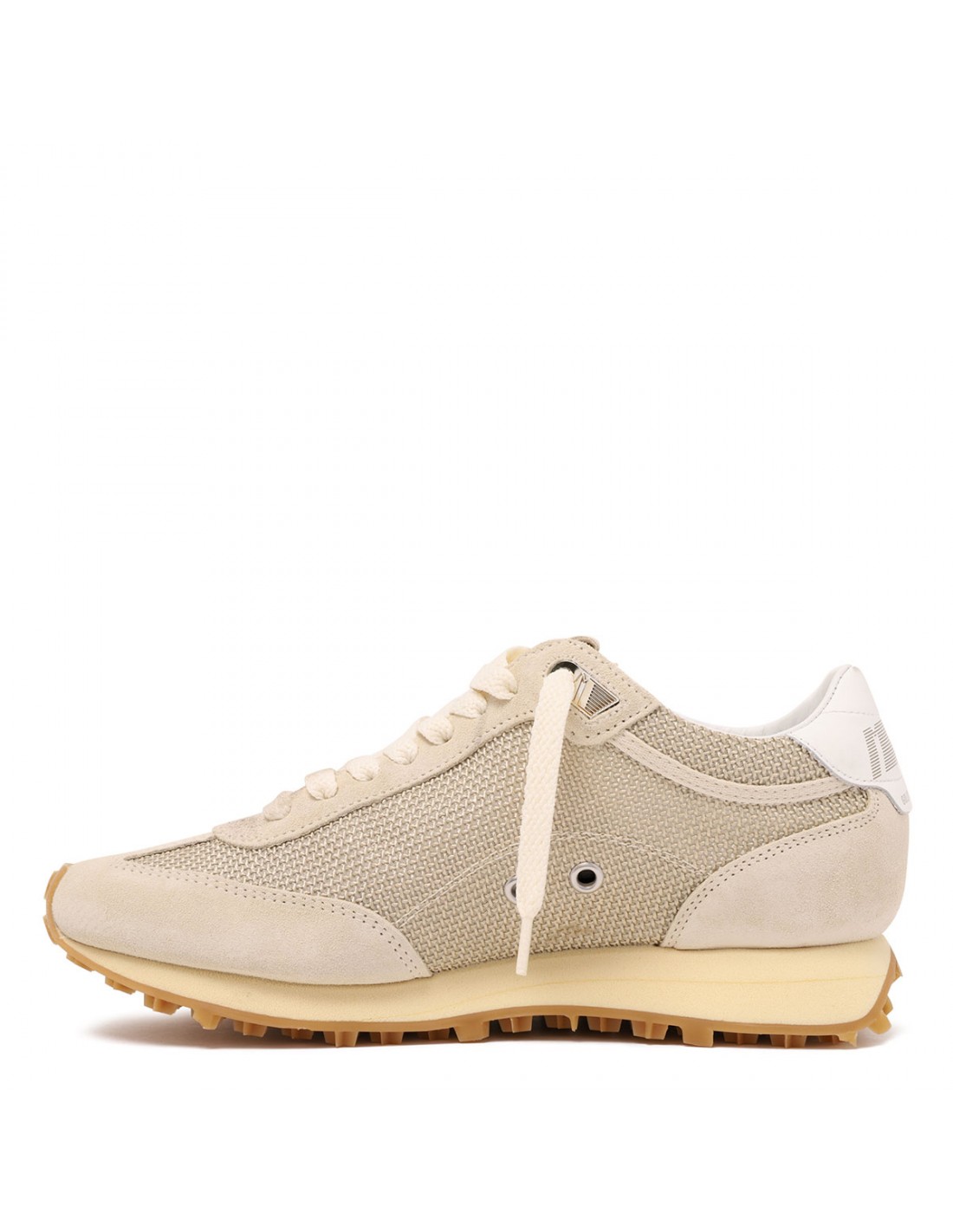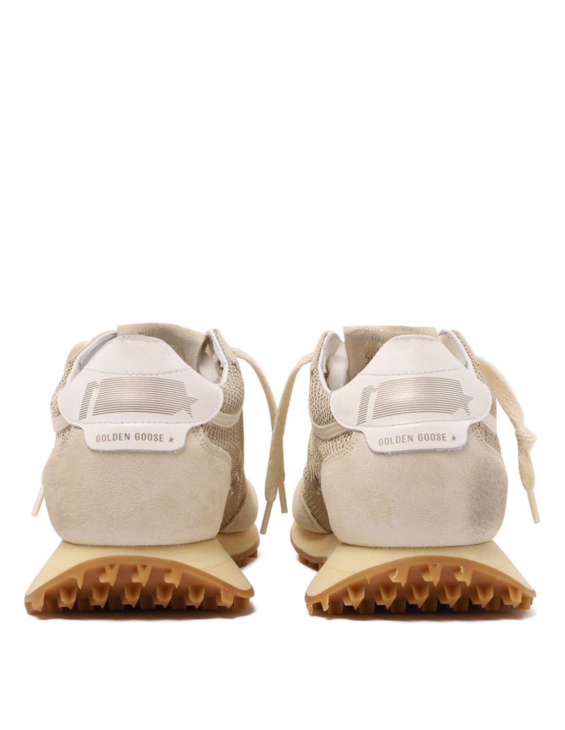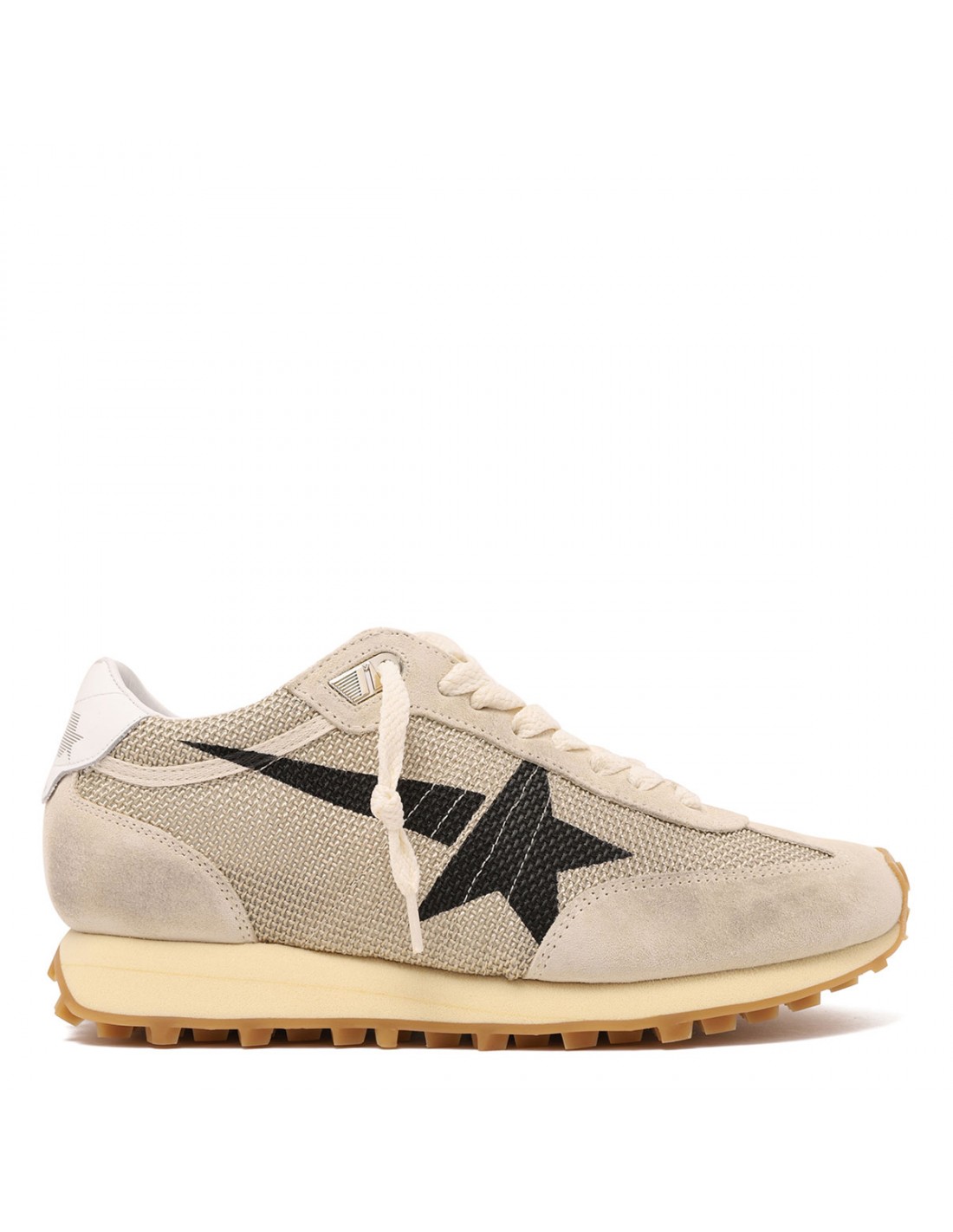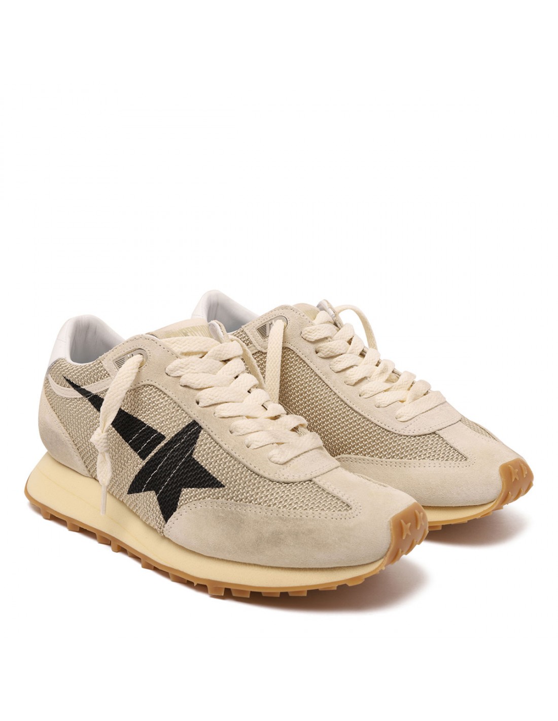 Beige Running Marathon sneakers from Golden Goose featuring suede and mesh upper, black star print on side, logo tag on tongue, contrasting leather heel with logo, vintage, padded ankle, rubber sole.