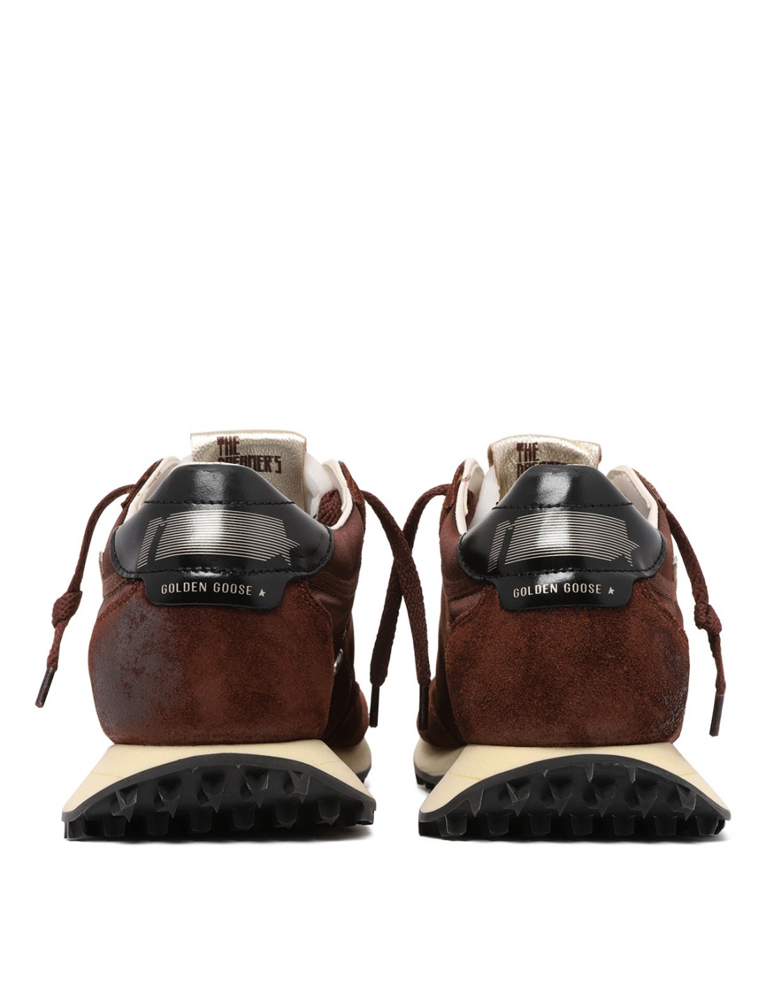 Brown Running Marathon sneakers from Golden Goose featuring suede and satin upper, white leather star signature on side, platinum accents, logo tag on tongue, contrasting leather heel tab with logo, vintage treatment, padded ankle, rubber sole.