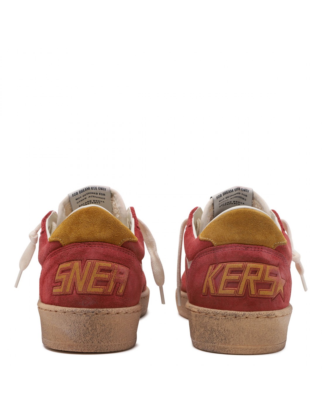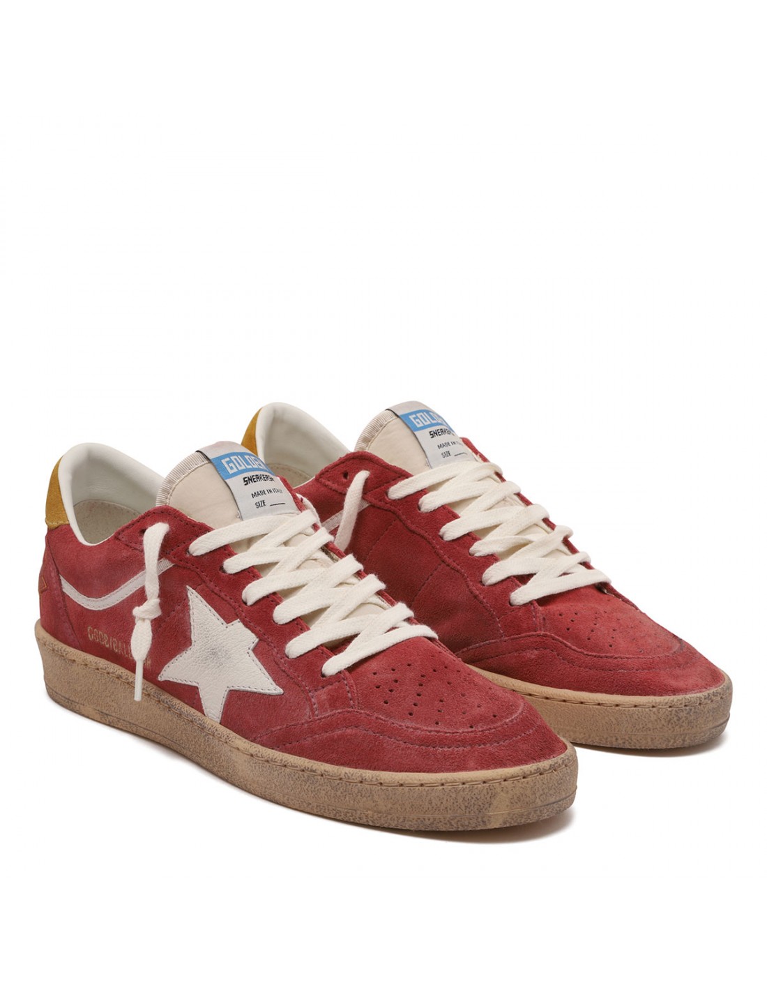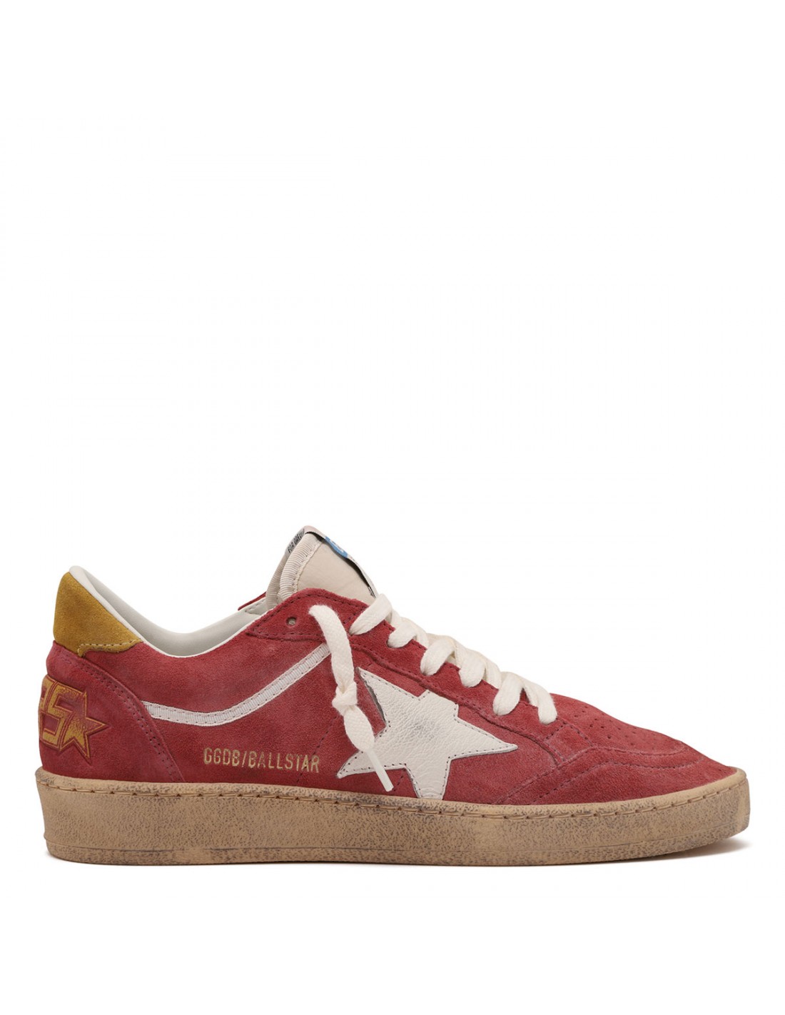 Brick red suede leather BallStar sneakers from Golden Goose featuring white leather star on side, vintage treatment, logo print on side, laces fastening, round toe, logo patch on tongue, "sneakers" lettering embossed on heel, ochre hue heel tab, rubber sole.