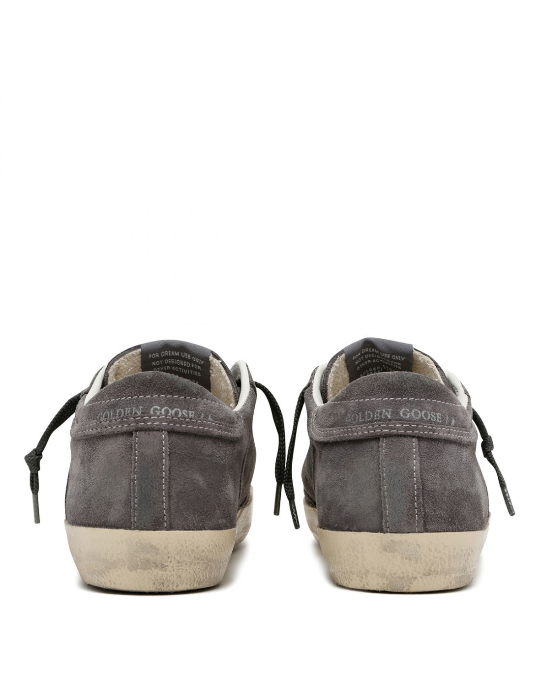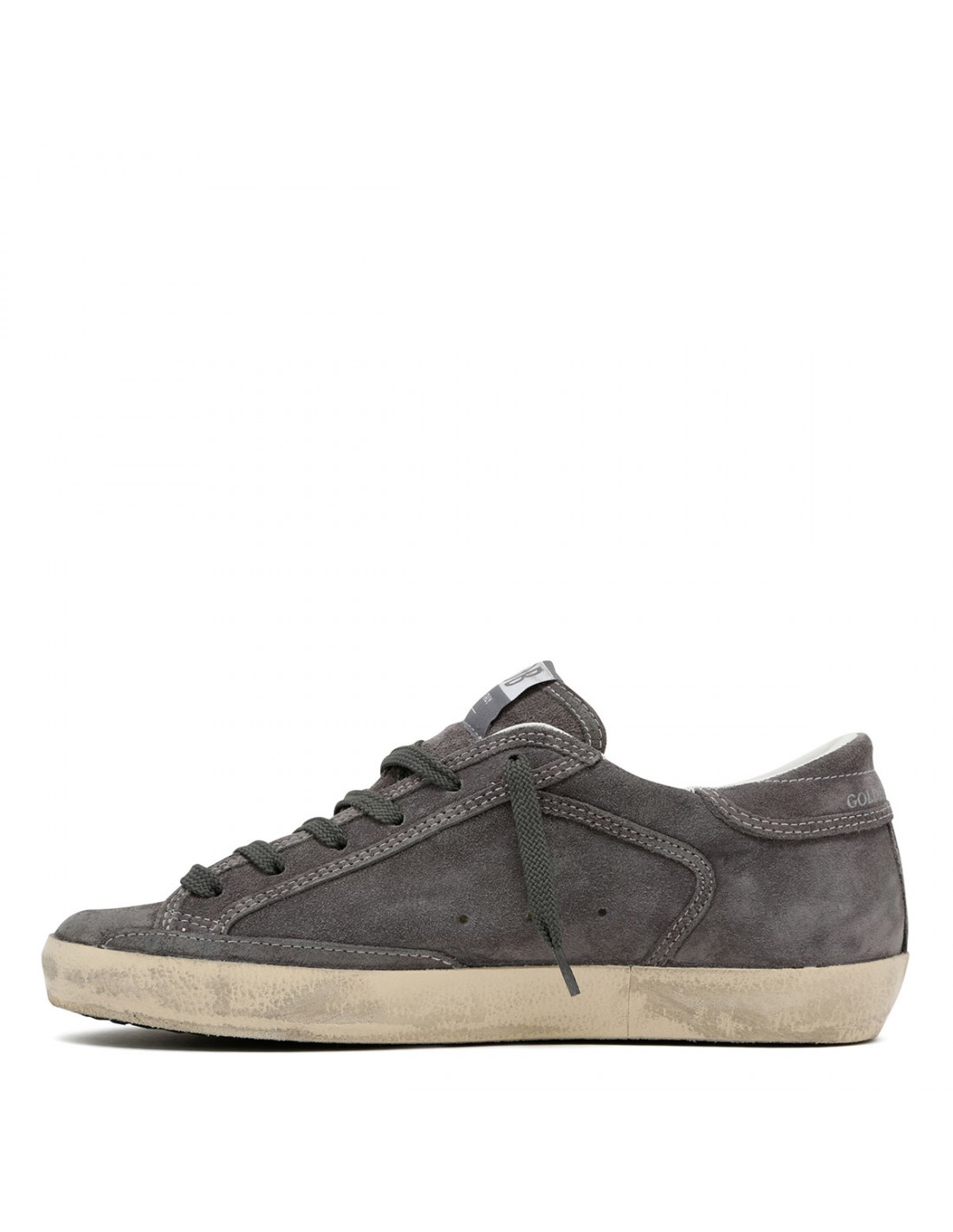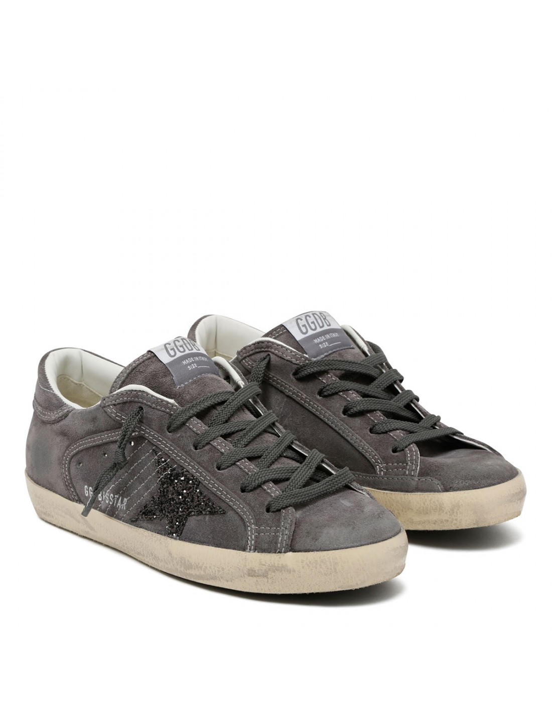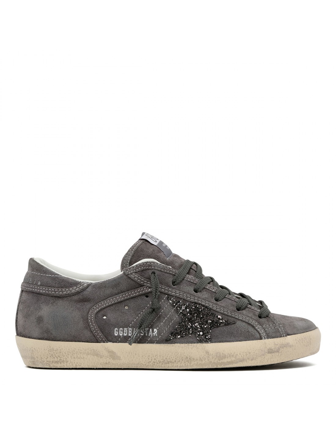 Gray suede leather SuperStar sneakers from Golden Goose featuring anthracite gray glittery star signature on side, tongue with logo label, lace-up fastening, round toe, heel tab with logo, vintage treatment, logo print on side, rubber sole.