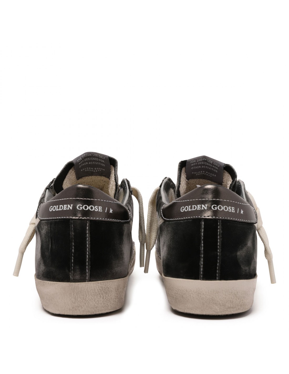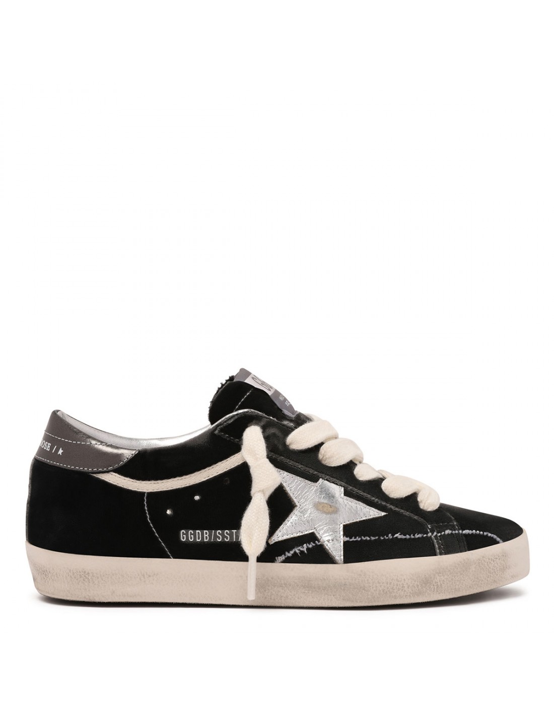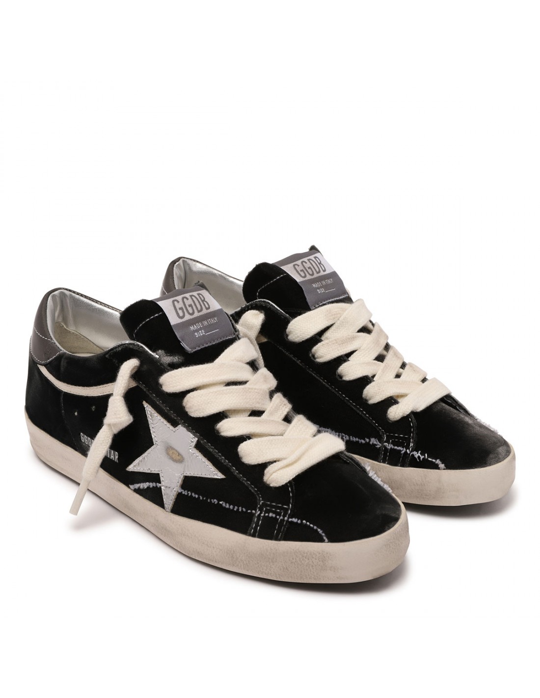 Dark gray velvet SuperStar sneakers from Golden Goose featuring laminated gunmetal hue heel tab with logo, leather star on side, vintage treatment, logo patch on tongue, contrasting topstitching, logo print on side, round toe, lace-up closure, rubber sole.