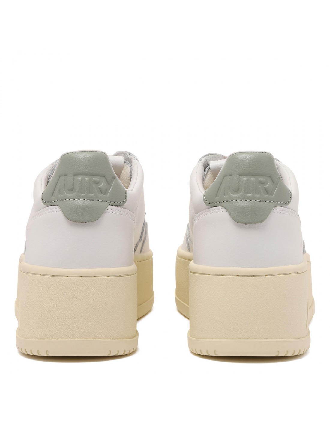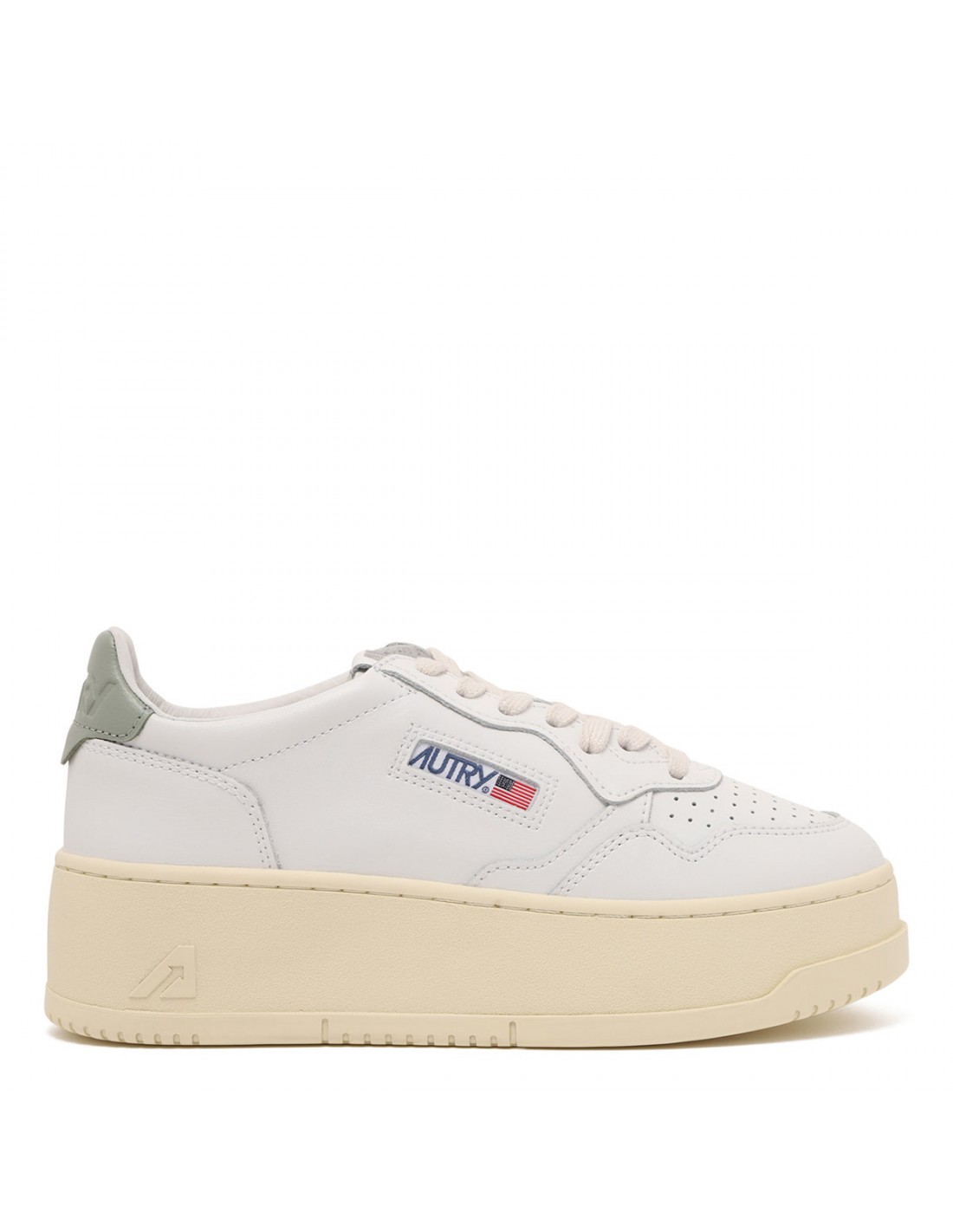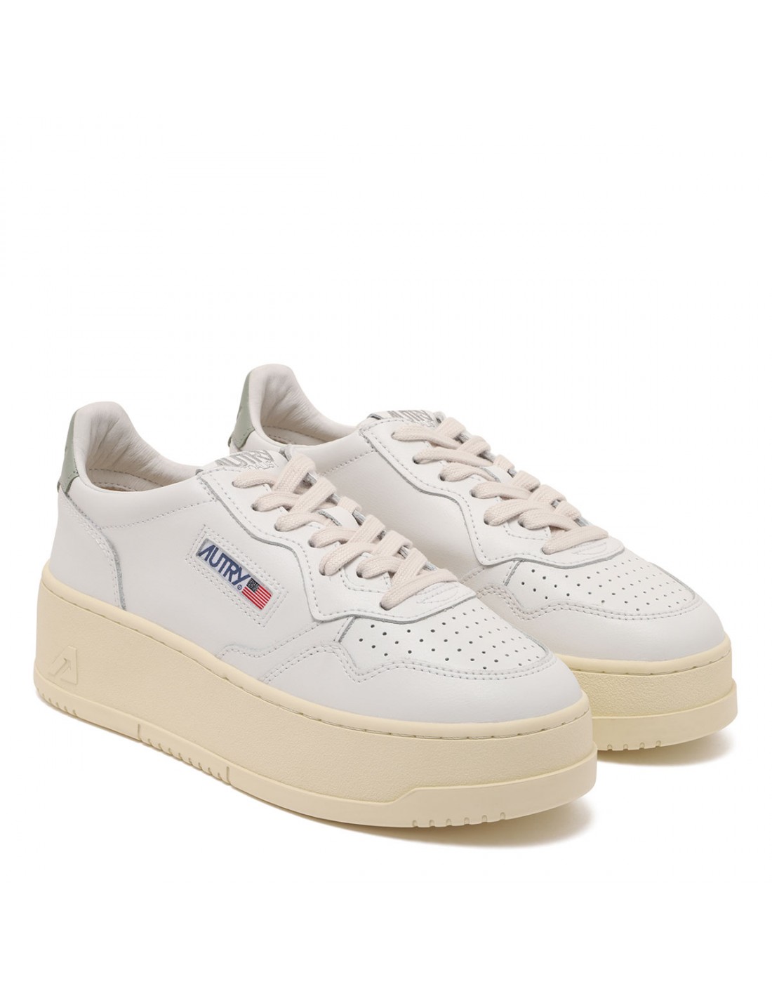 White leather Medalist paltform sneakers from Autry featuring seagrass hue leather heel tab with embossed logo, perforated toecap, round toe, lace-up closure, logo label on tongue, padded ankle collar, leather insole, platform rubber sole.