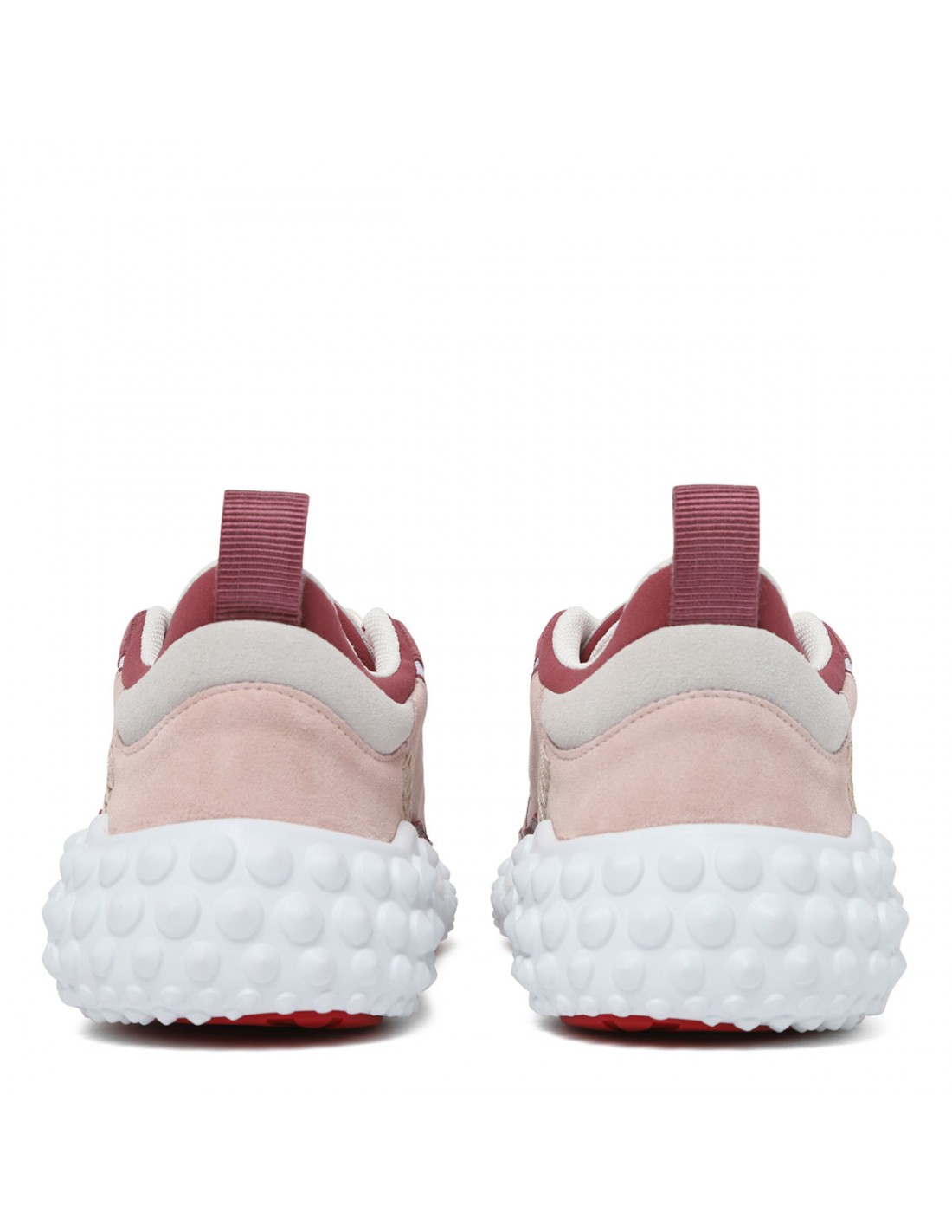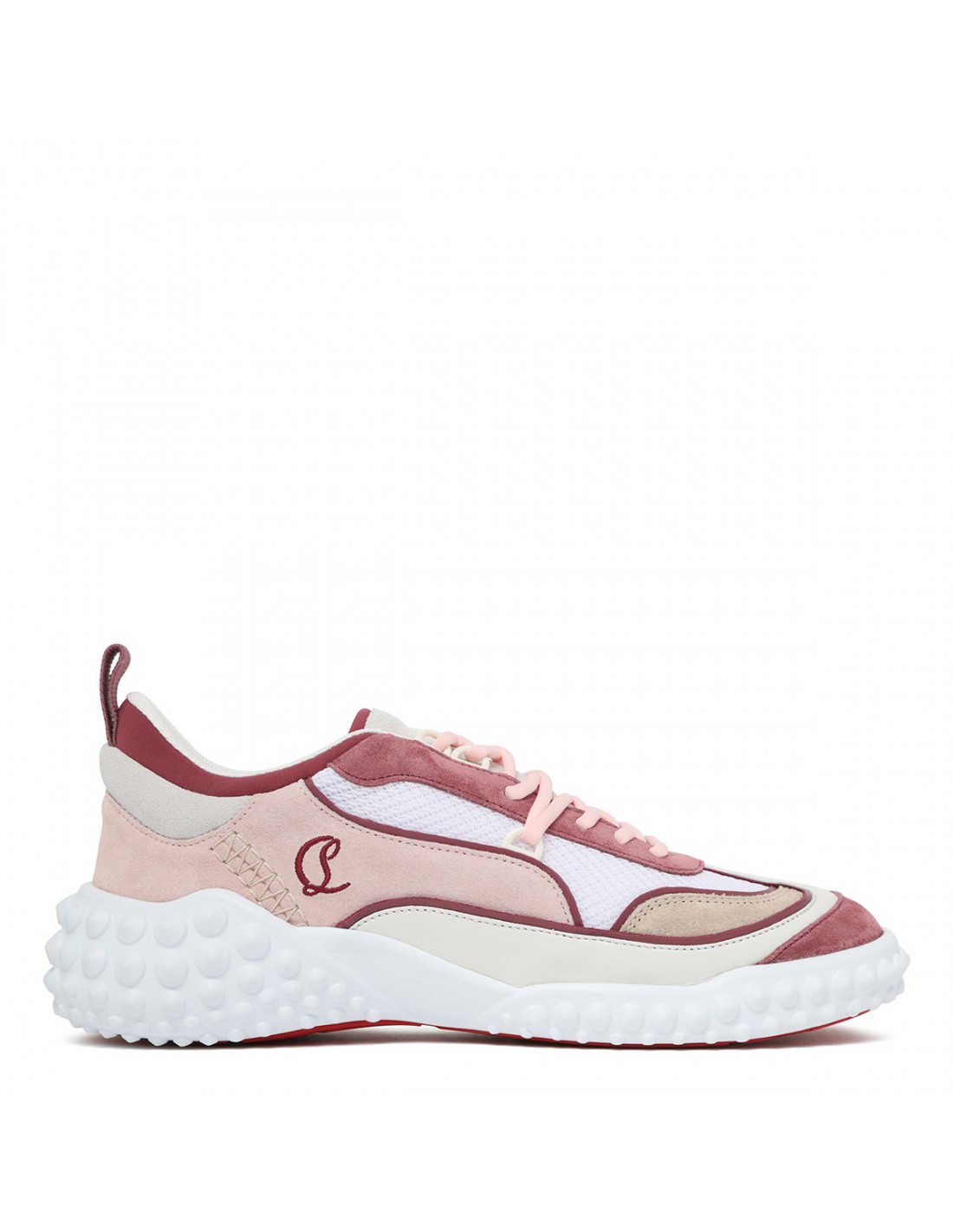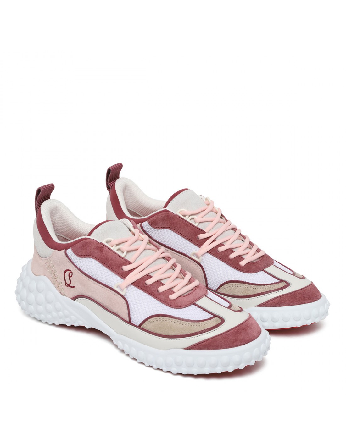 Pink and white Mara sneakers from Christian Louboutin featuring crepe satin, leather and mesh upper, signature white spikes, CL Mooncrest logo on side, deep pink accents, lace-up closure, round toe, gros-grain heel loop, rubber sole, signature red outsole.