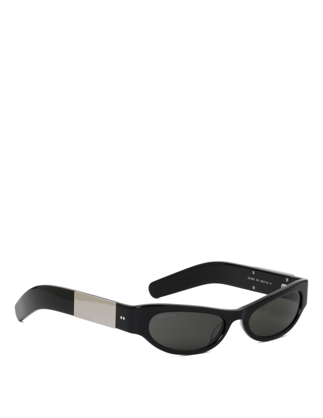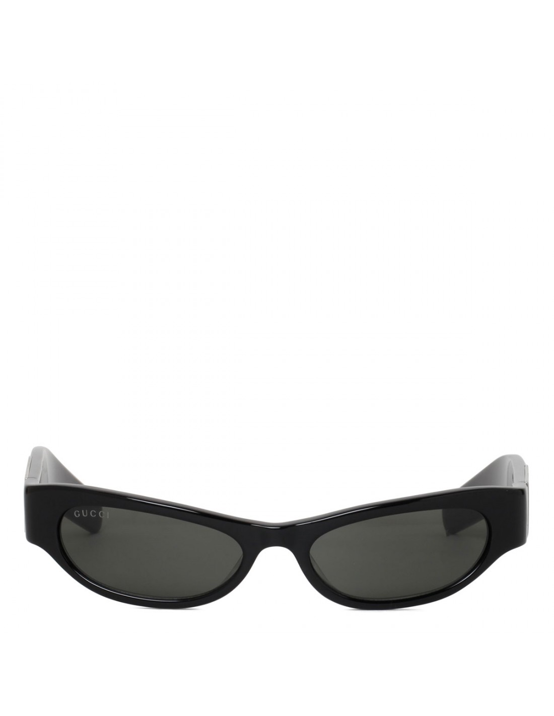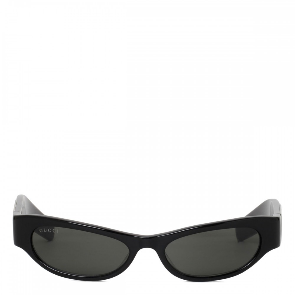 Shiny black acetate sunglasses from Gucci featuring cat-eye frame, shiny black temples, silver-toned metal plaque with Gucci logo engraved, dark gray lenses with 100% UVA/UVB protection.