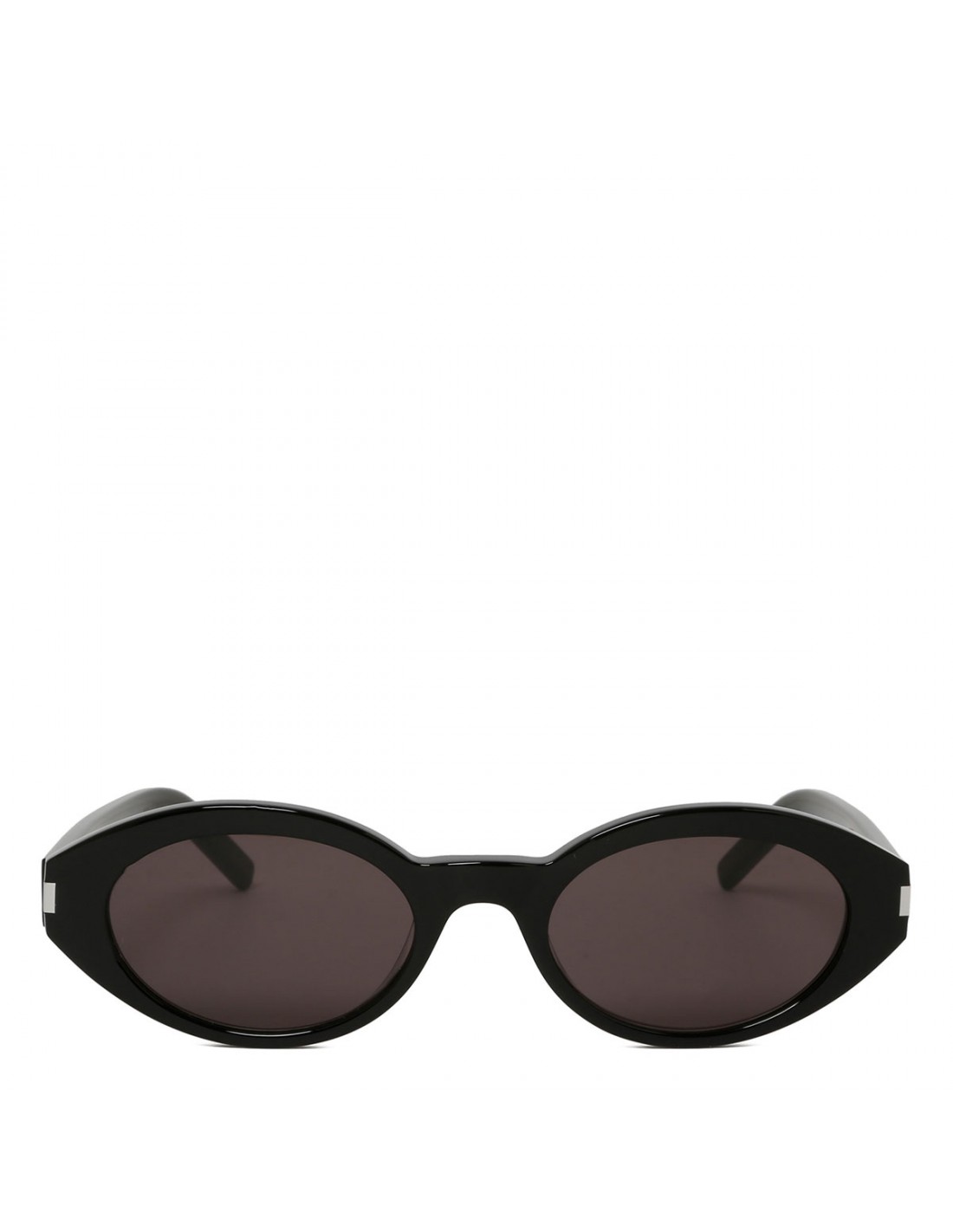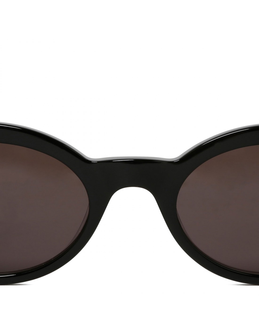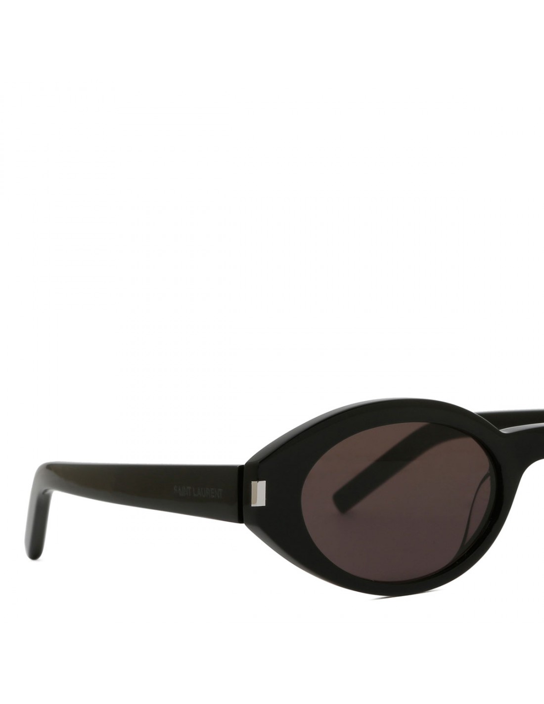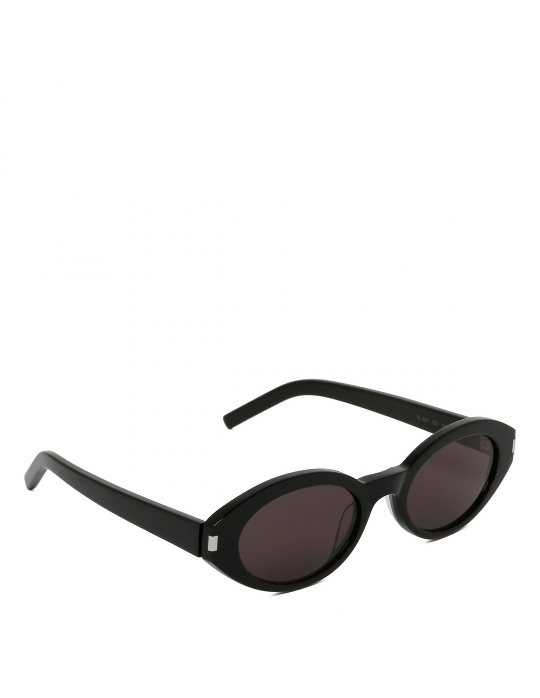Black acetate SL 567 sunglasses from Saint Laurent featuring rounded cat-eye frame, logo-engraved temples, metal hinge detail, black nylon lenses with 100% UVA/UVB protection.
