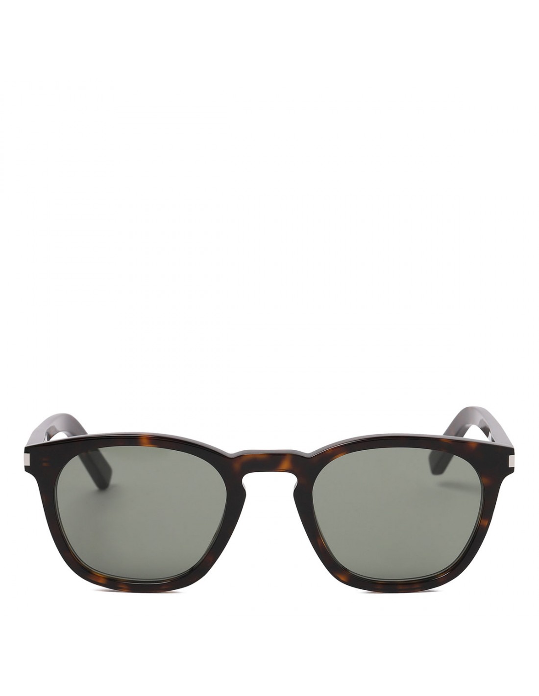 Dark havana tortoiseshell acetate Classic SL 28 sunglasses from Saint Laurent featuring keyhole bridge, metal corner angles, logo engraved temples, green mineral glass lenses with 100% UVA/UVB protection.