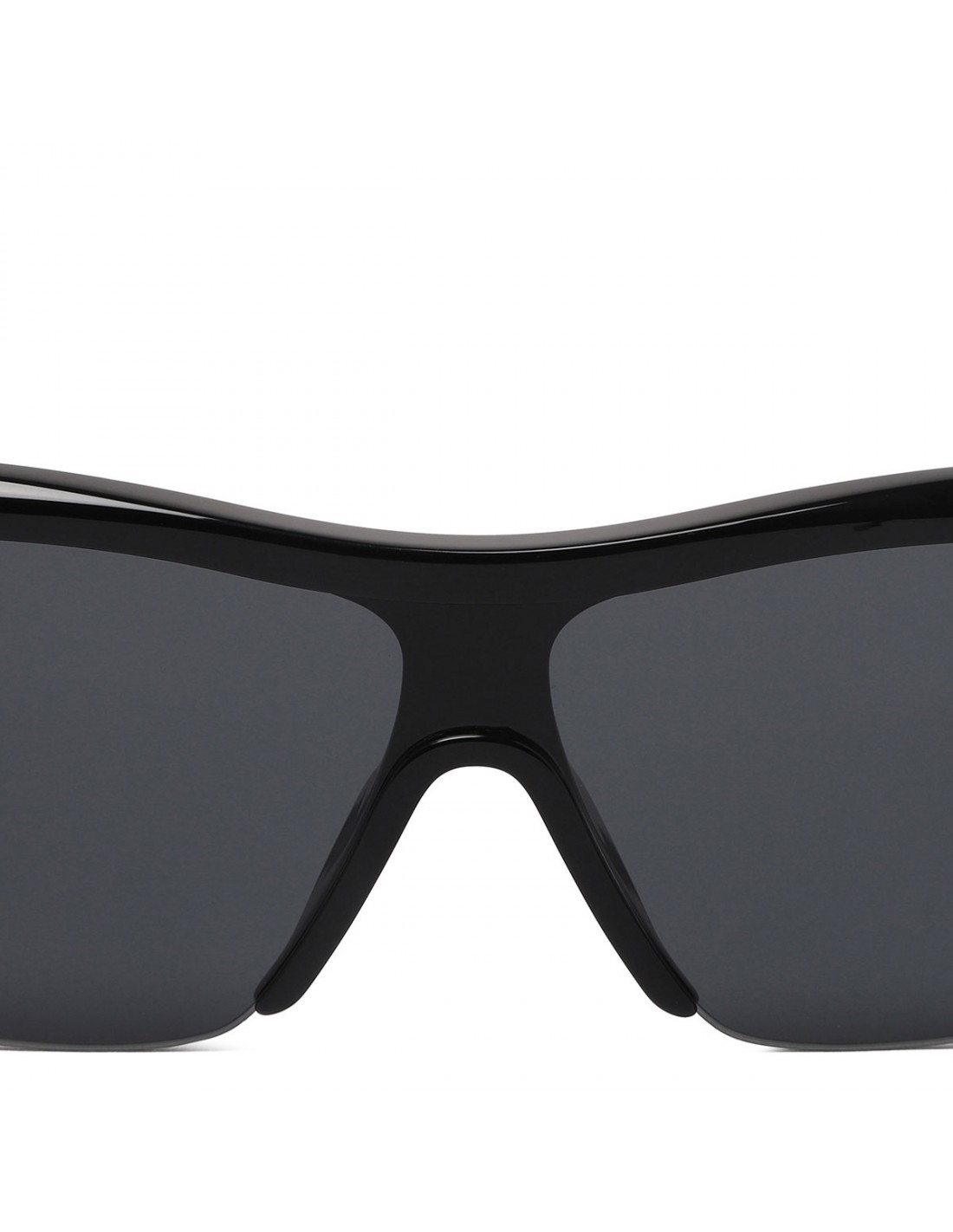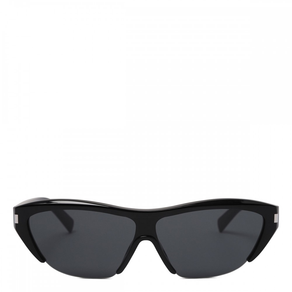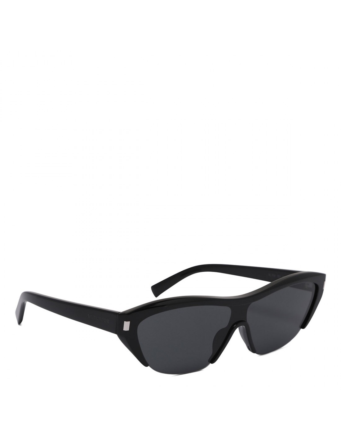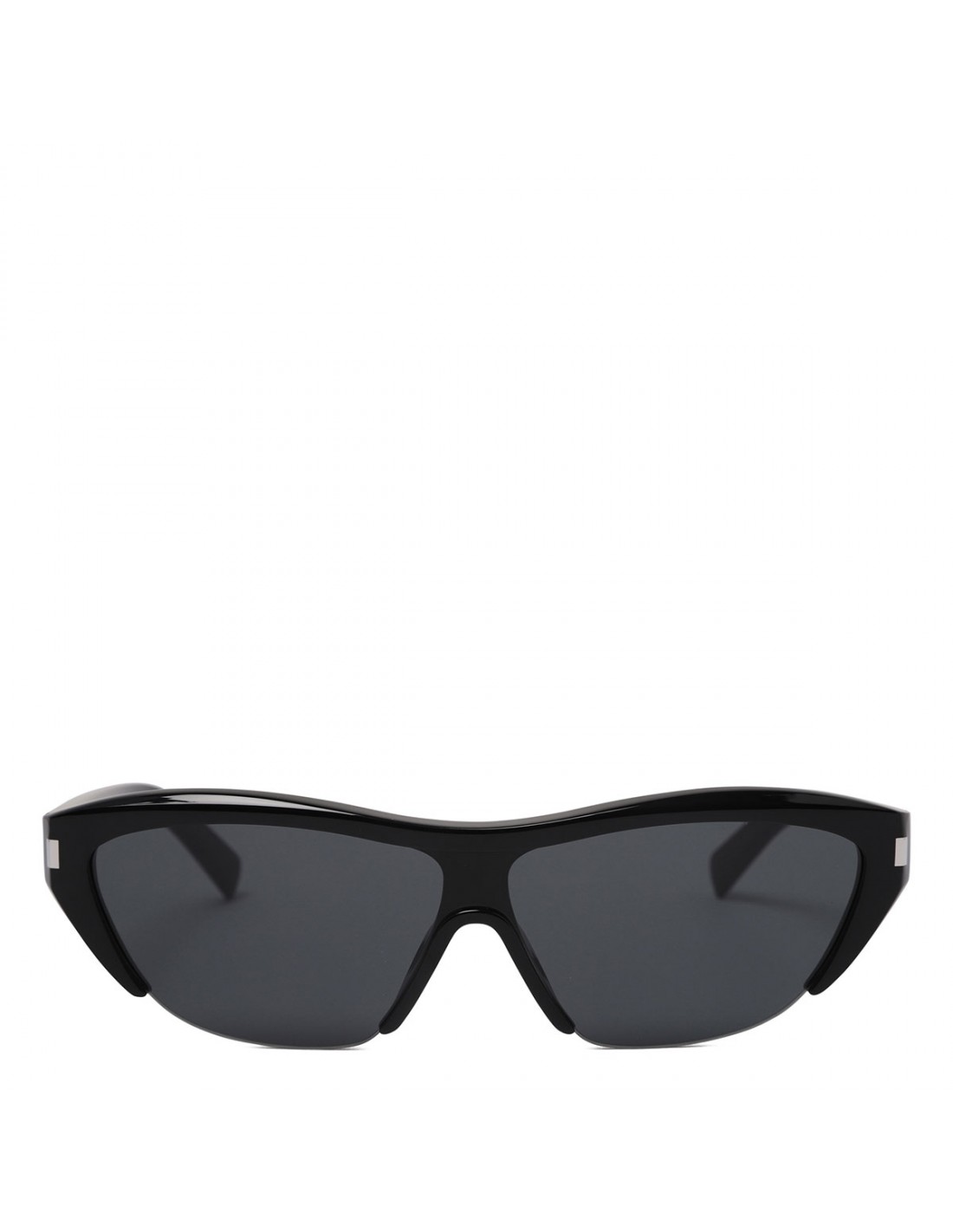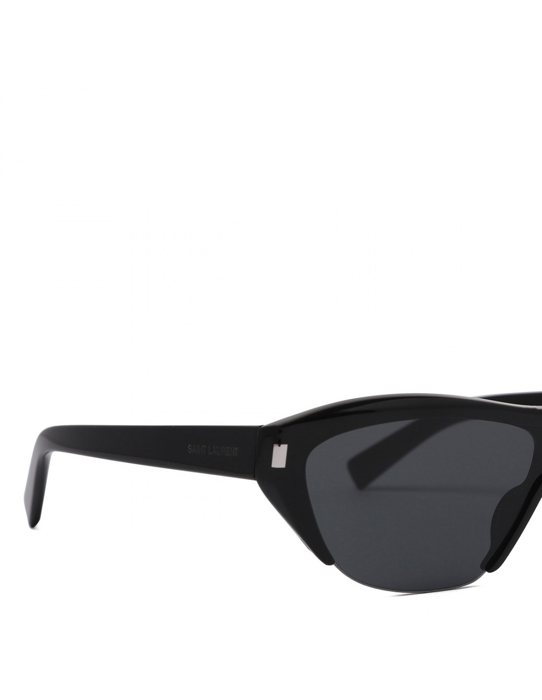 Black acetate SL 704 sunglasses from Saint Laurent featuring half-rim shield frame, logo engraved temples, metal hinge detail, black nylon lenses with 100% UVA/UVB protection.