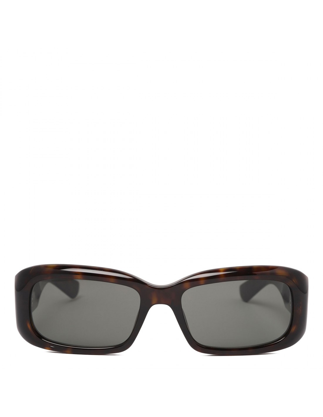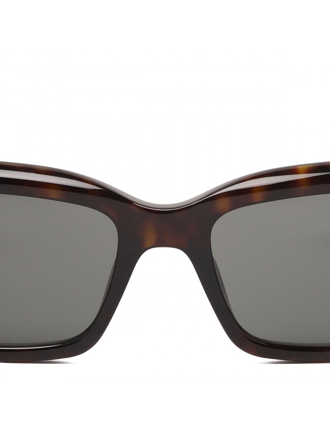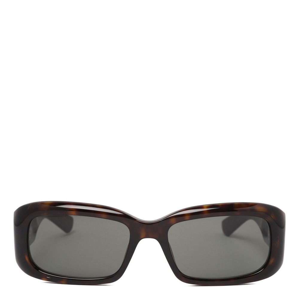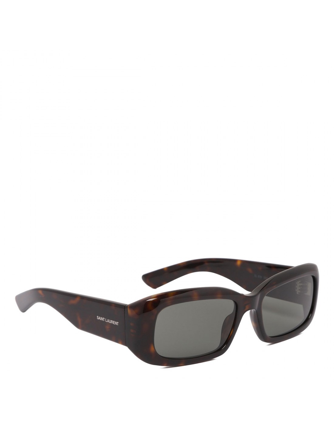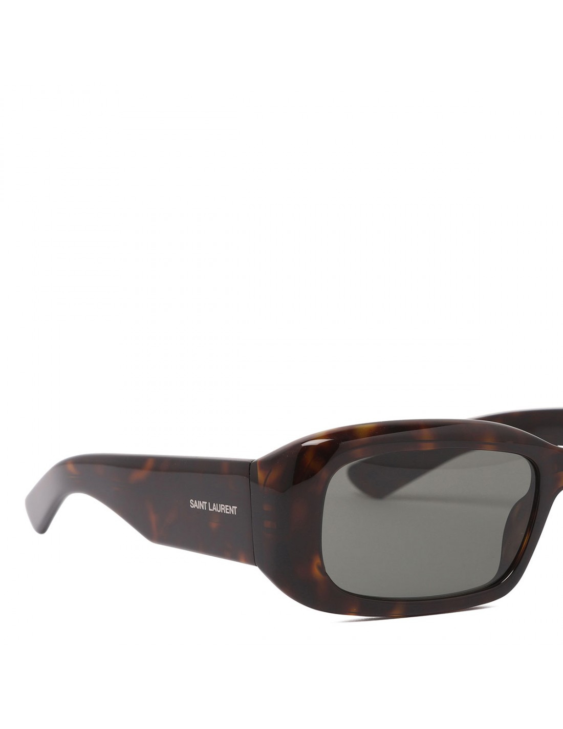 Dark havana tortoiseshell acetate SL 809 sunglasses from Saint Laurent featuring pillowed rectangular frame, wide temples with logo, gray nylon lenses with 100% UVA/UVB protection.