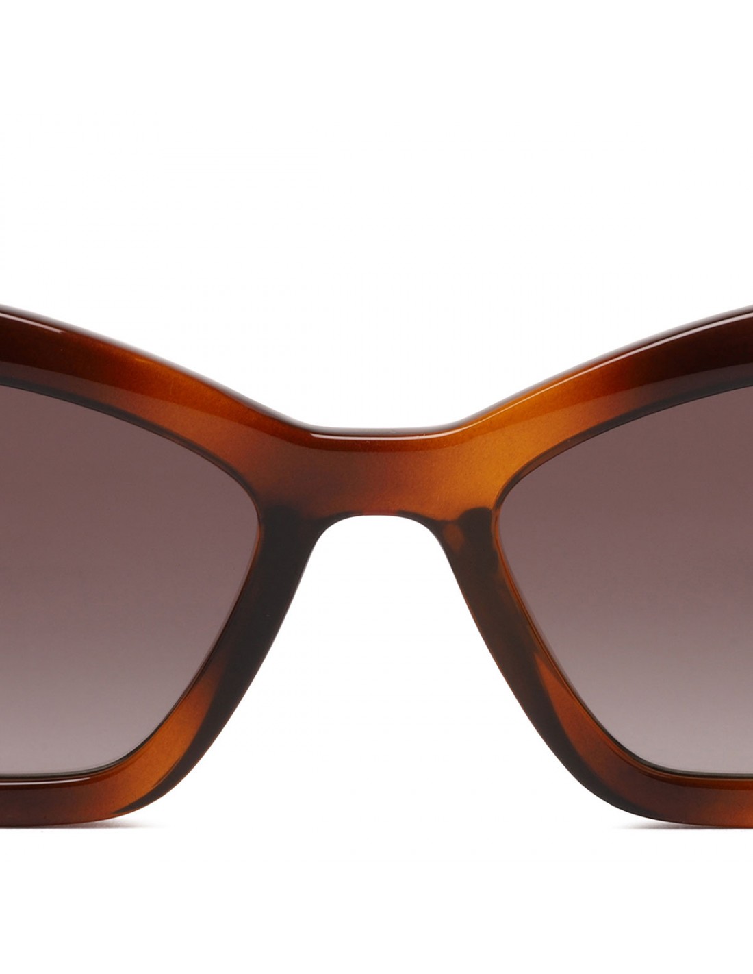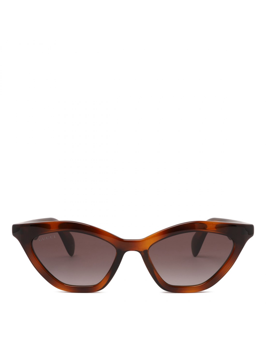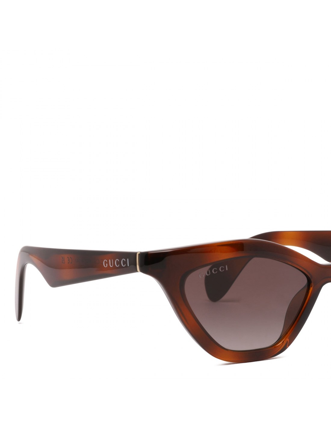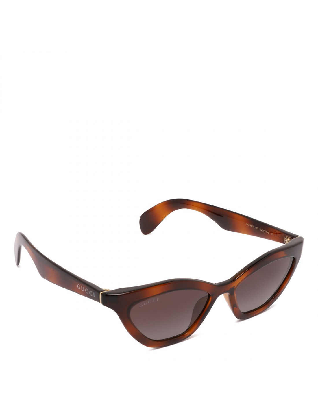 Shiny light brown tortoiseshell sunglasses from Gucci featuring cat-eye frame, temples with logo, gradient gray lenses with 100% UVA/UVB protection.