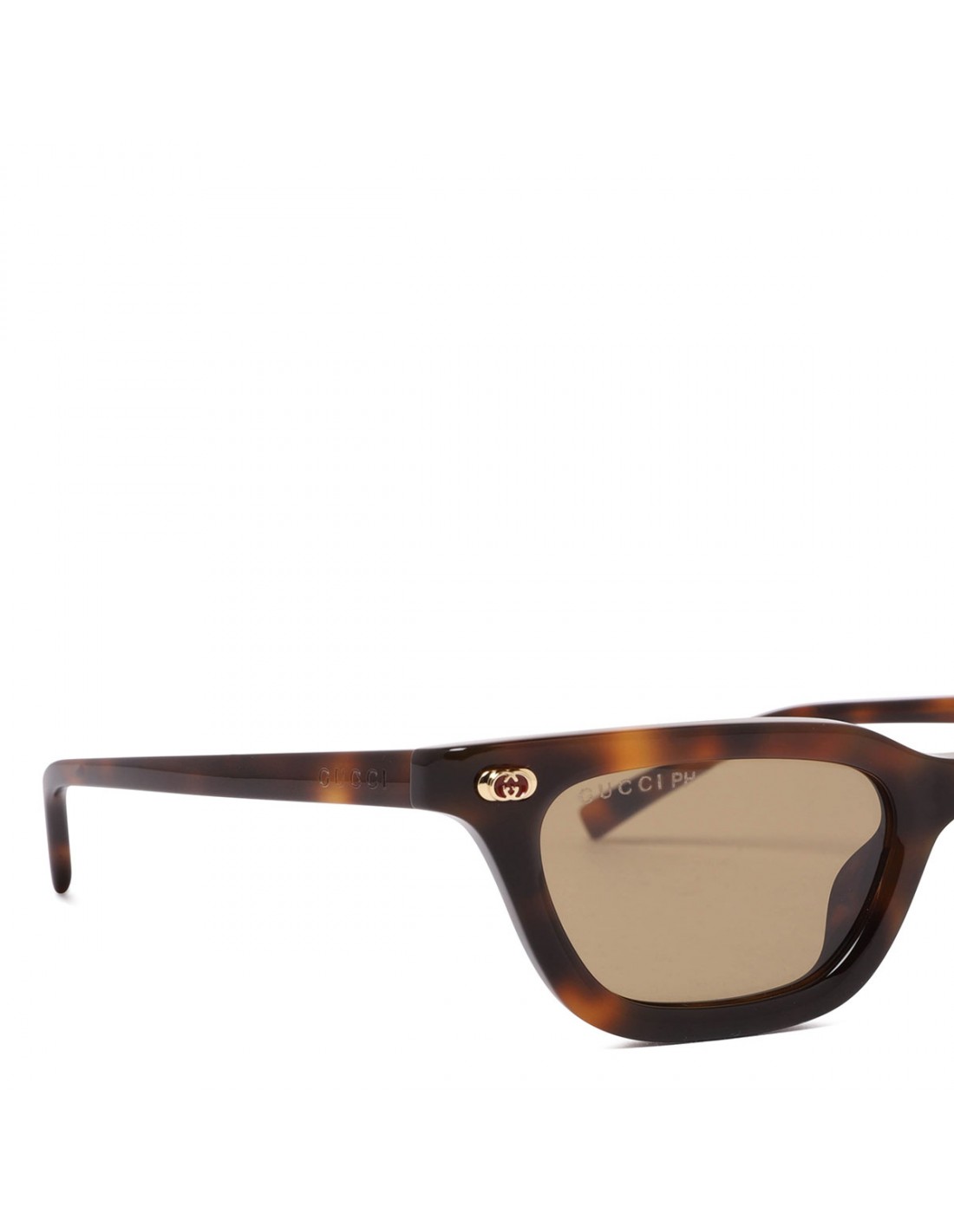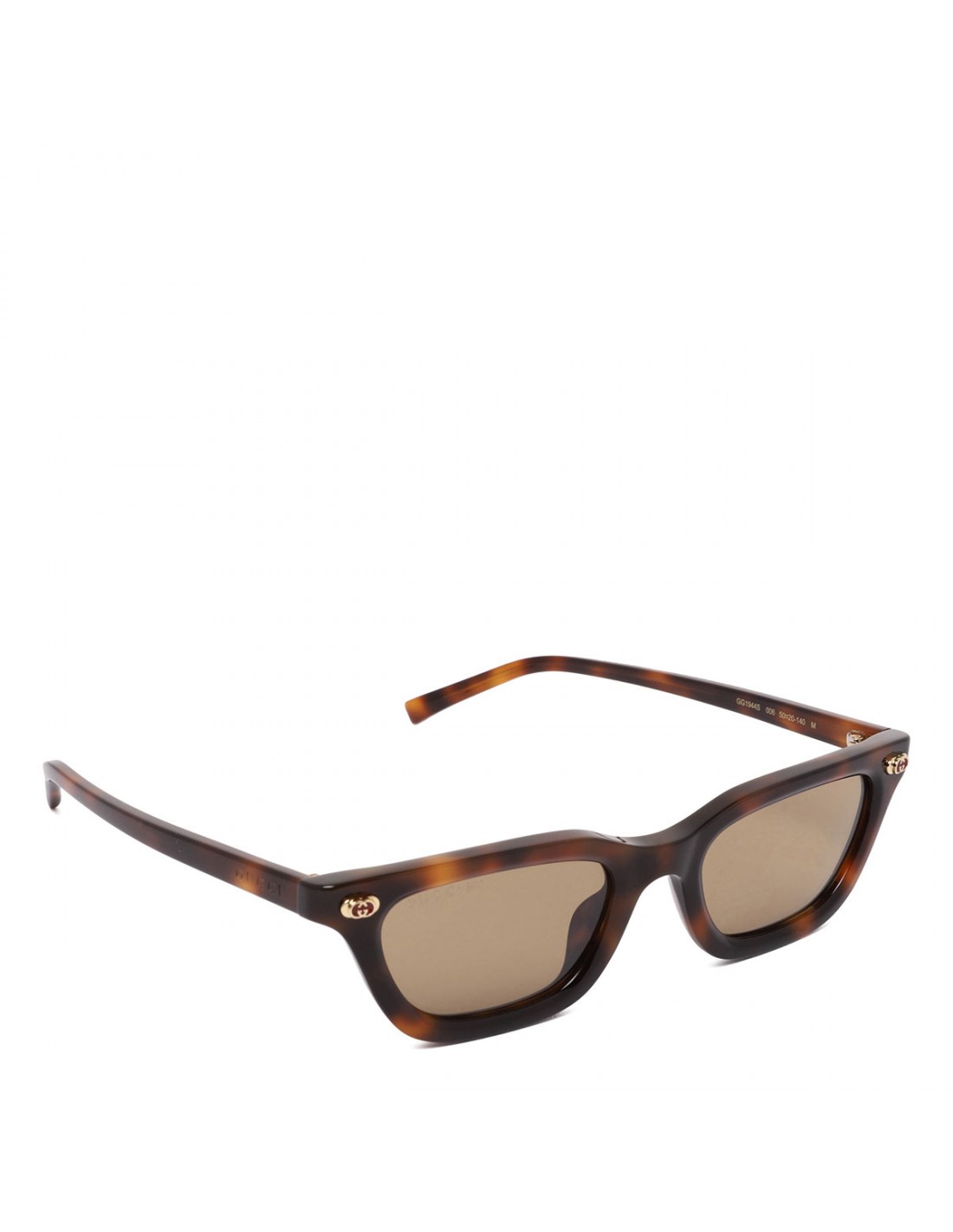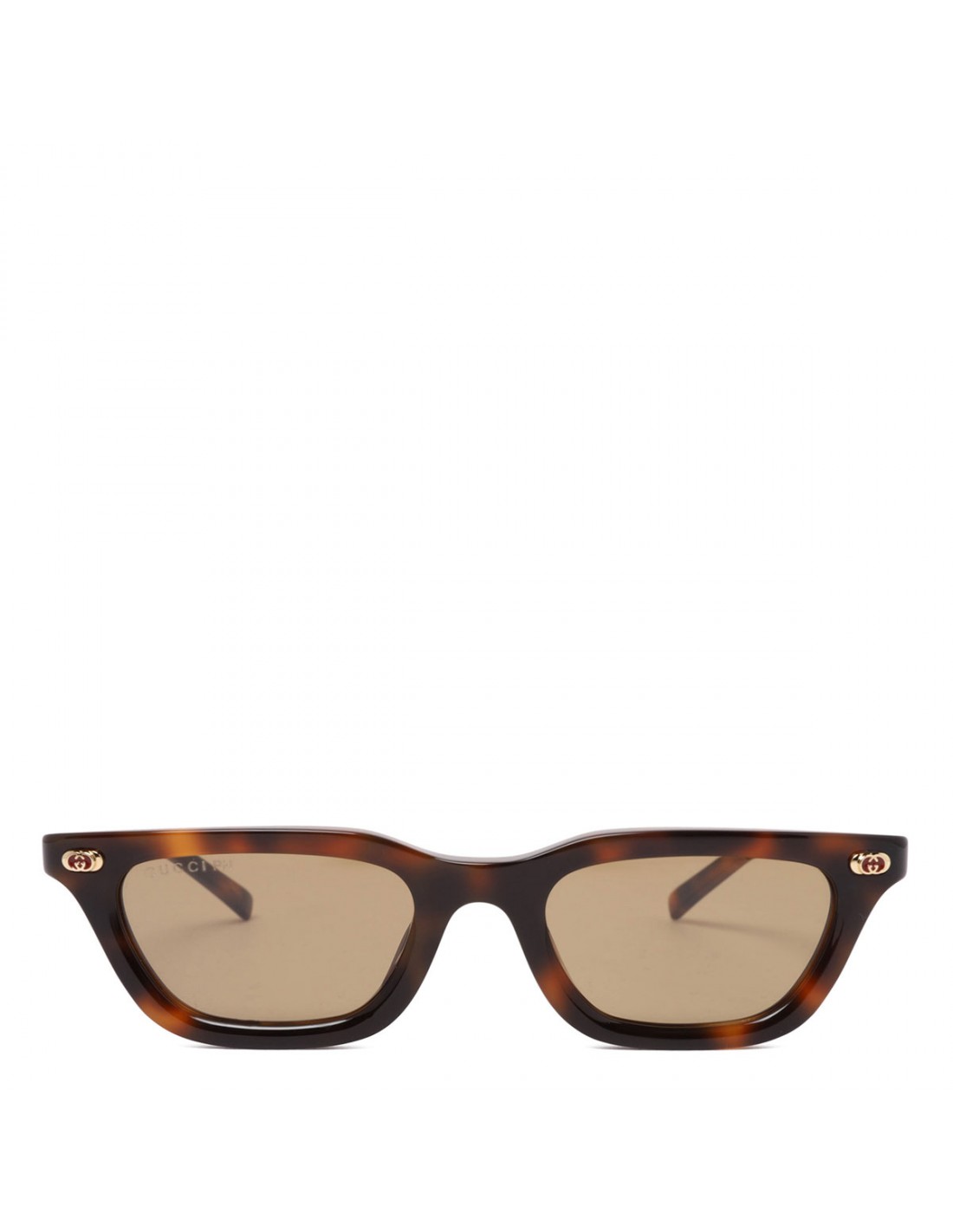 Havana brown tortoiseshell acetate sunglasses from Gucci featuring cat-eye frame, Interlocking G detail, acetate temples with engraved logo, light brown lenses with 100% UVA/UVB protection.