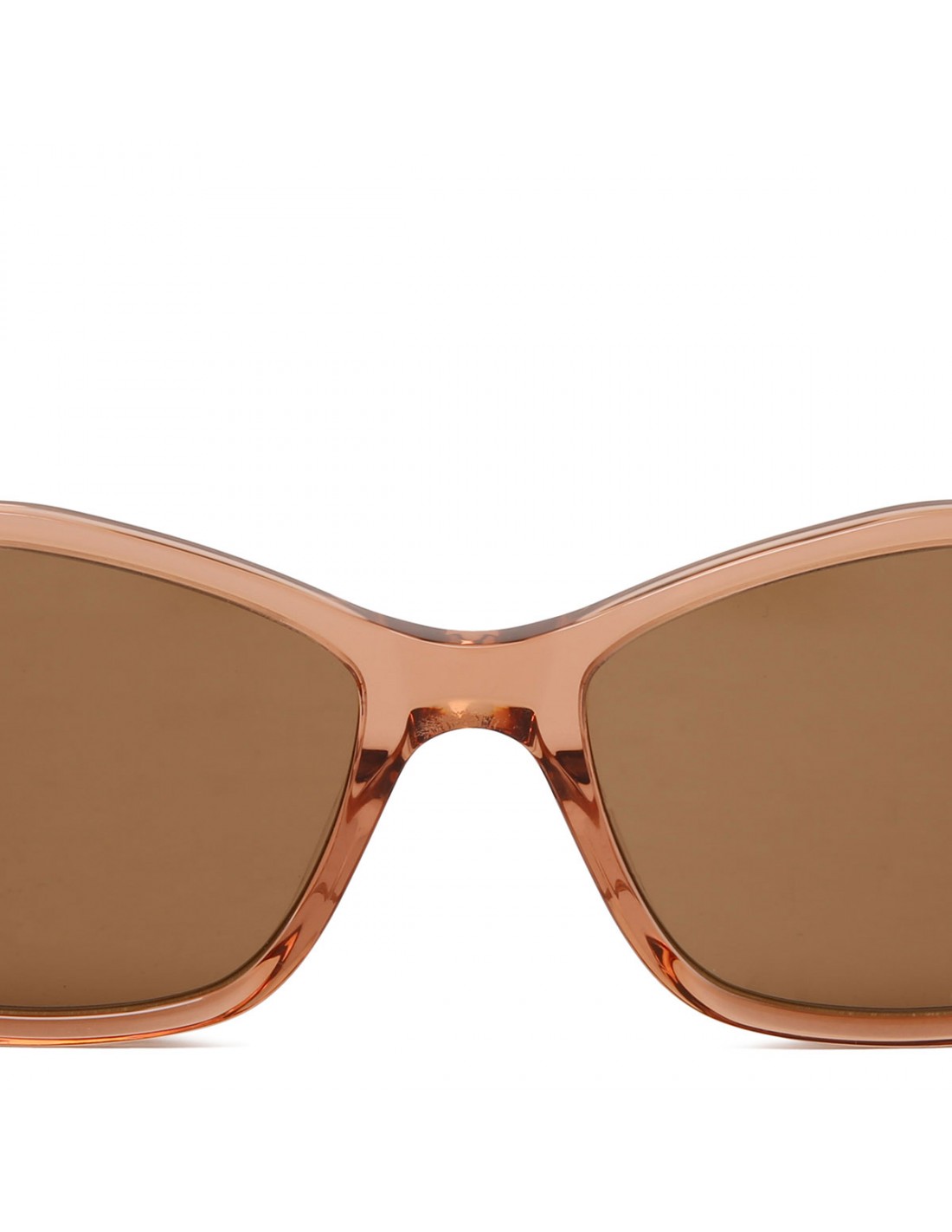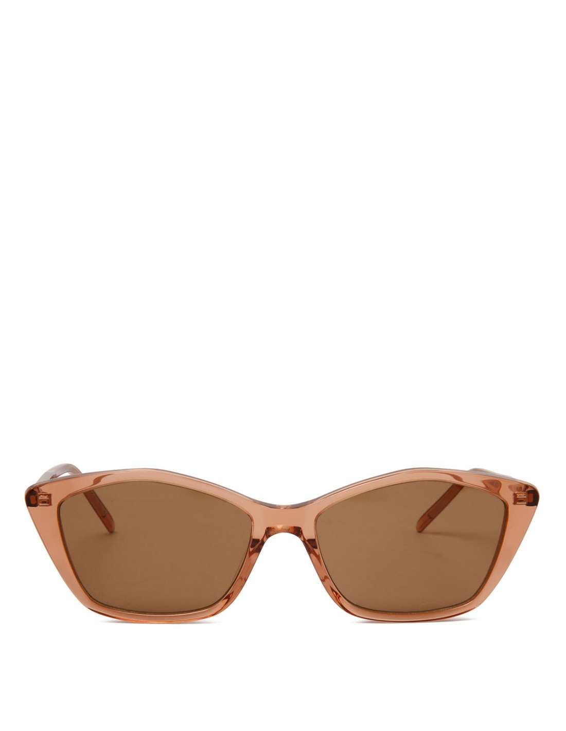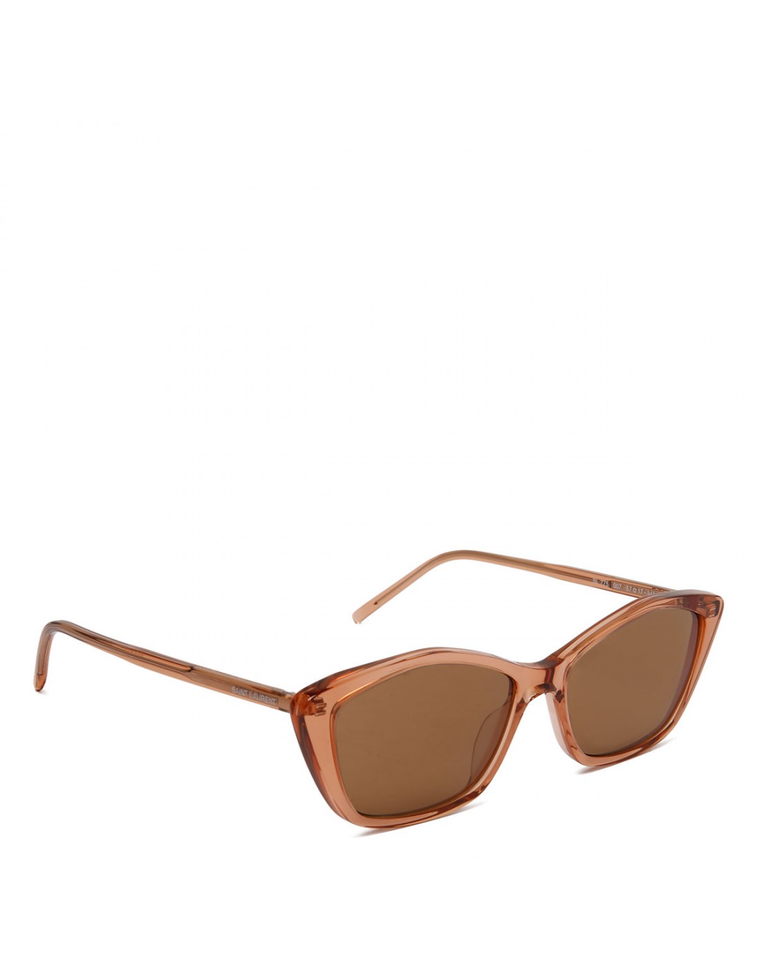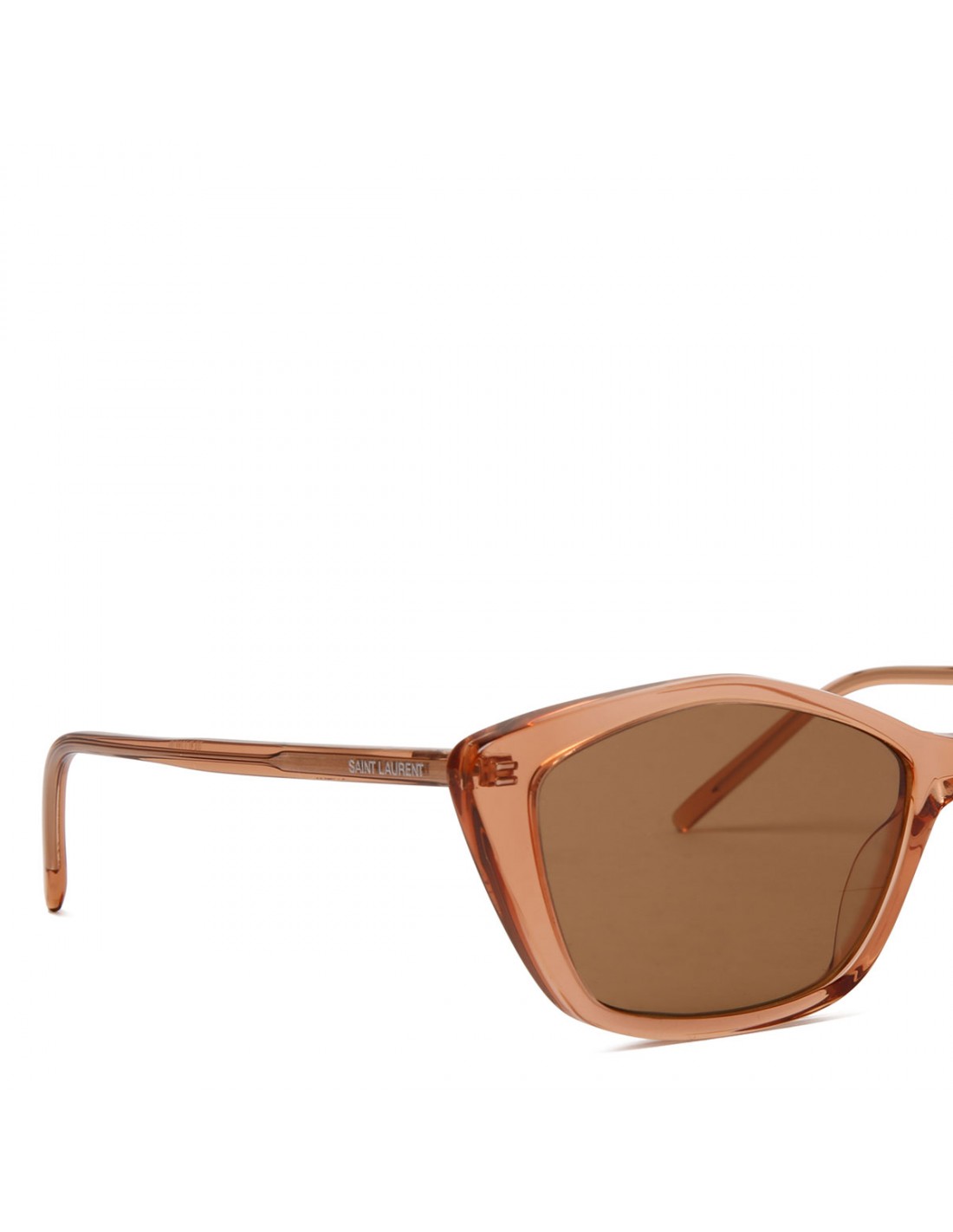 Brown clear acetate SL 775 sunglasses from Saint Laurent featuring cat-eye frame, curved arms with lettering logo, tonal lenses with 100% UVA and UVB protection.