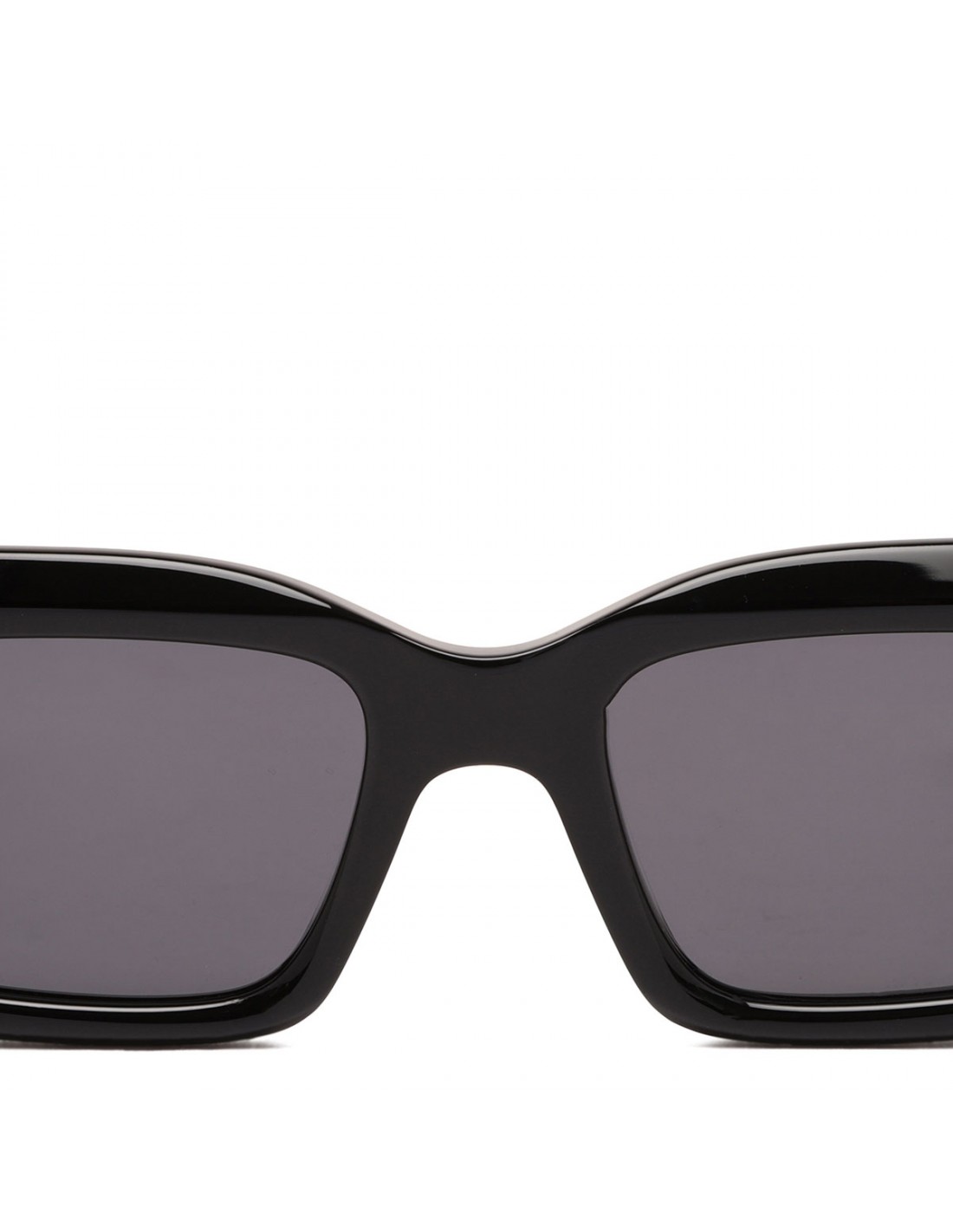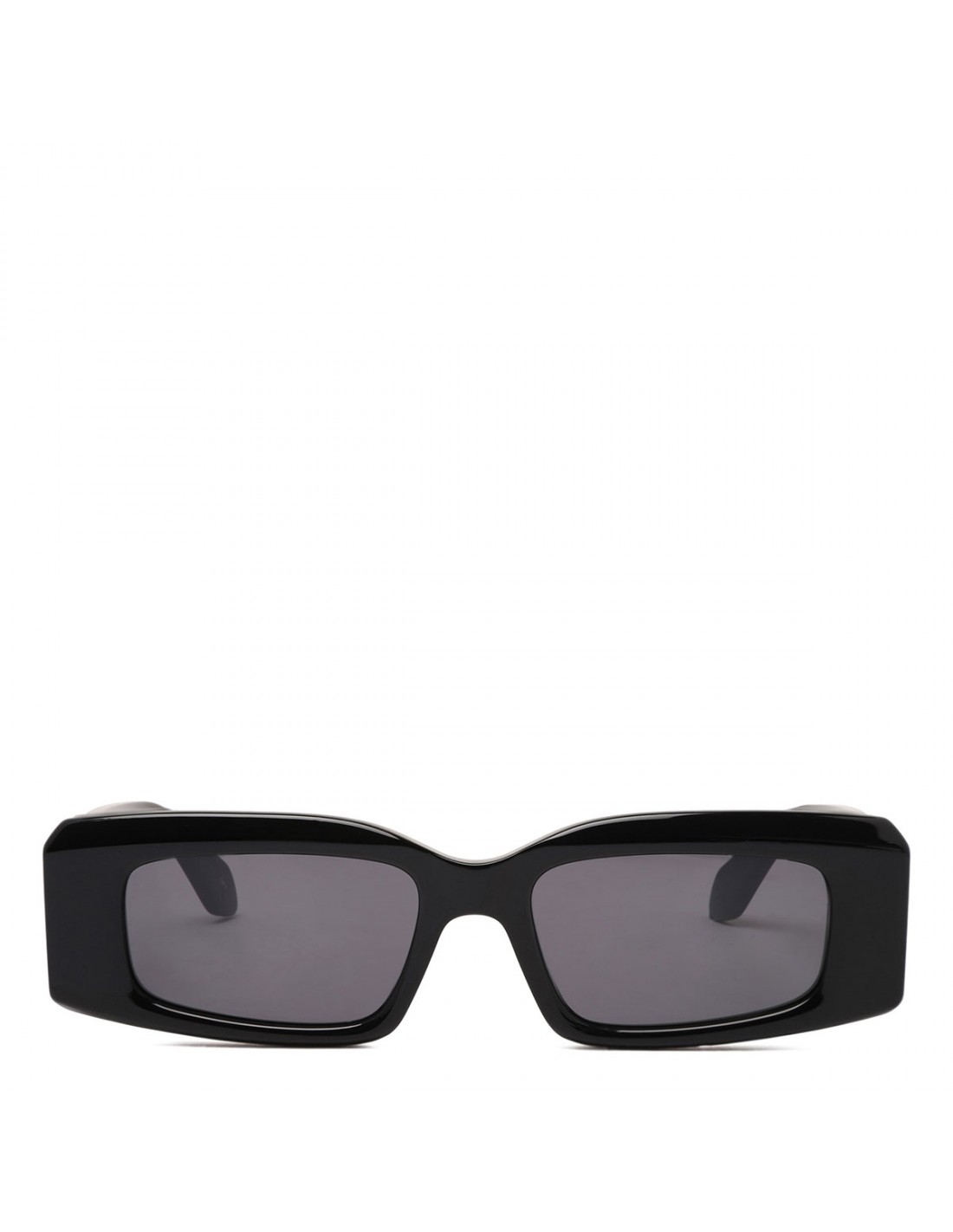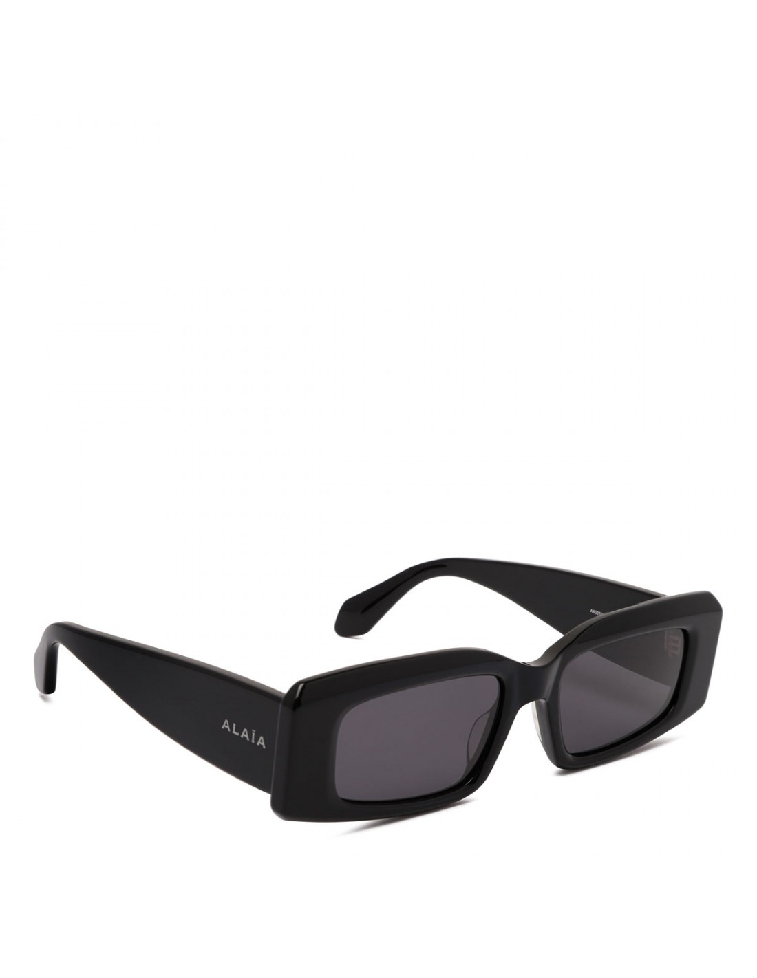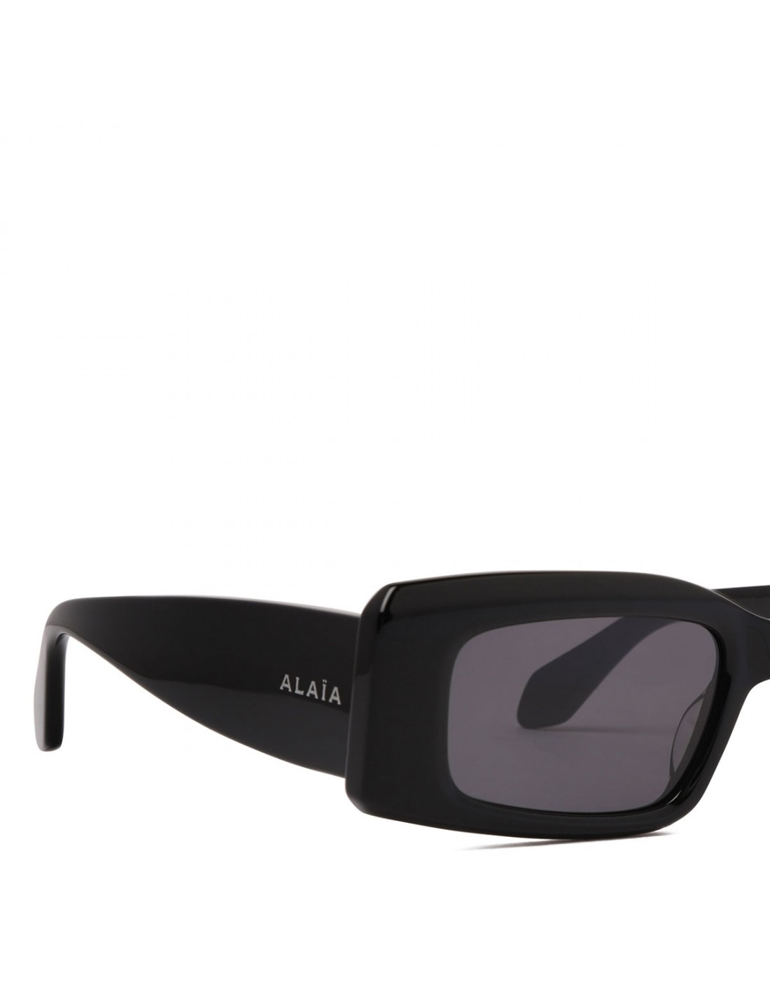 Black acetate sunglasses from Alaia featuring rectangular frame, Alaïa signature on the temples, black lenses with 100% UVA and UVB protection.