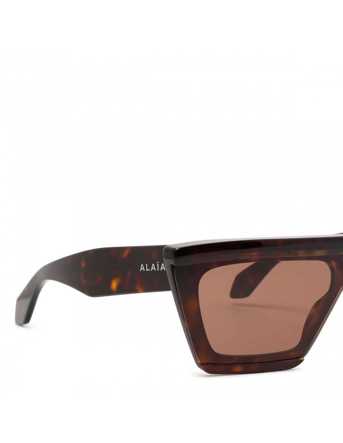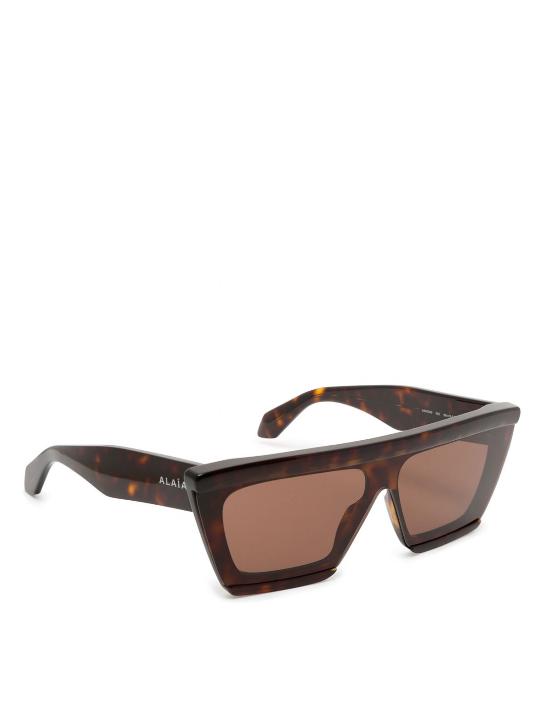 Havana tortoiseshell acetate mask sunglasses from Alaia featuring tapered rectangular frame, logo signature on temples, brown lenses with 100% UVA and UVB protection.