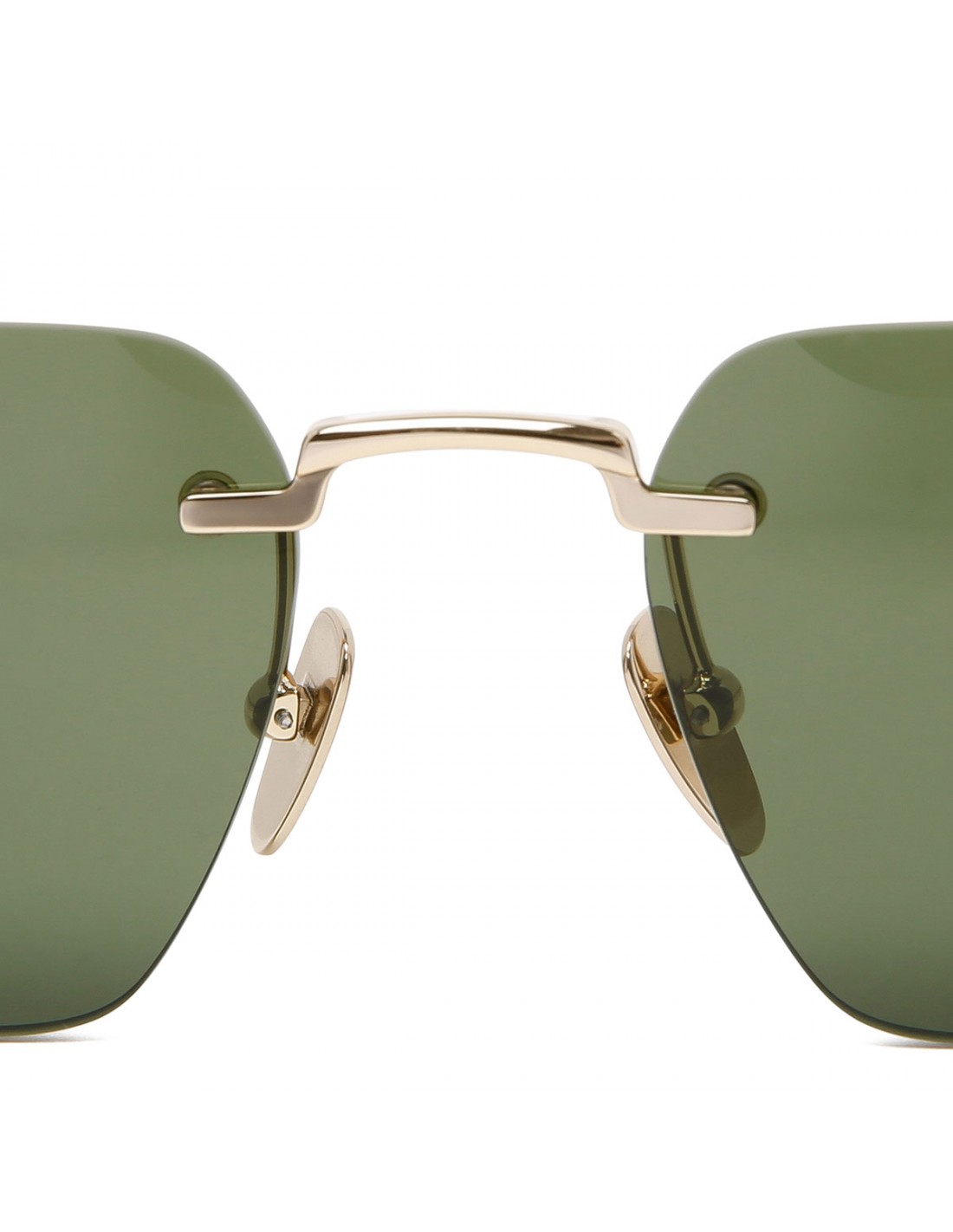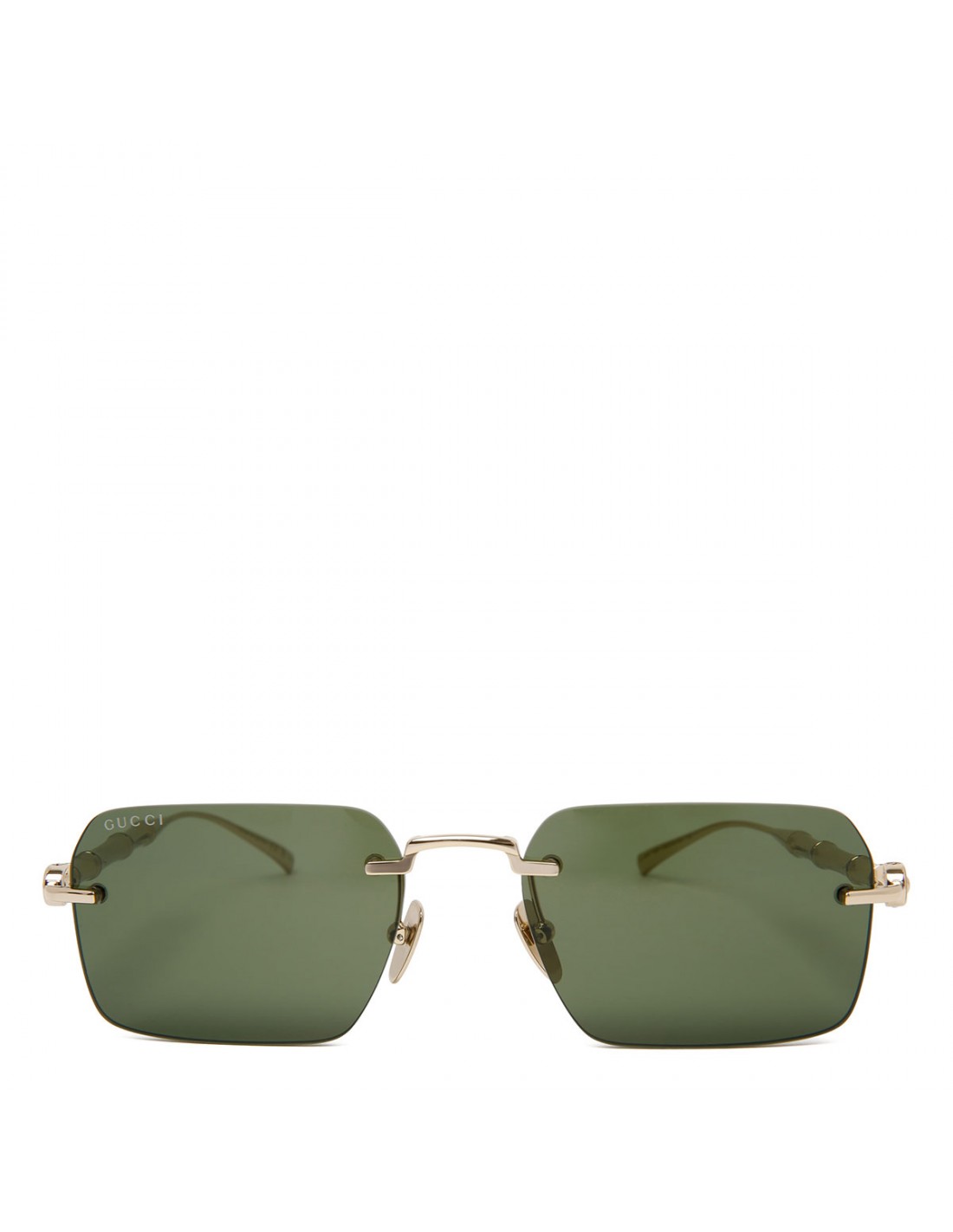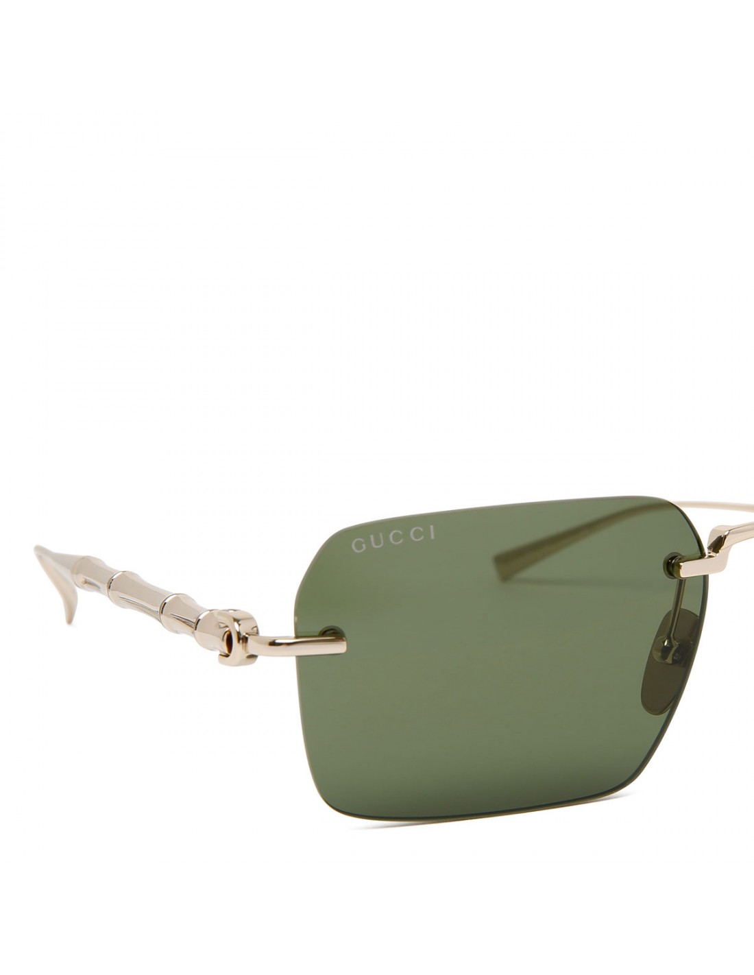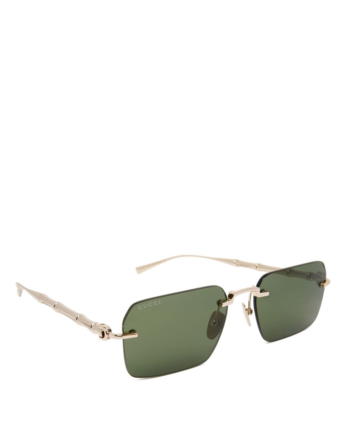 Frameless rectangular sunglasses from Gucci featuring gold-toned metal detail, adjustable nose pads, gold-toned metal bamboo-shaped temples with engraved logo on endtips, green lenses with 100% UVA/UVB protection.