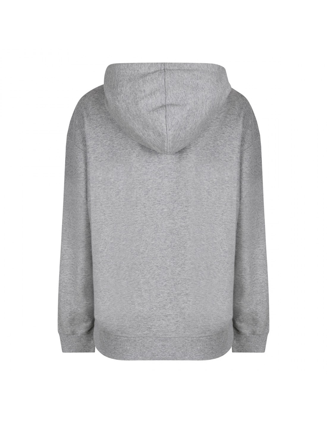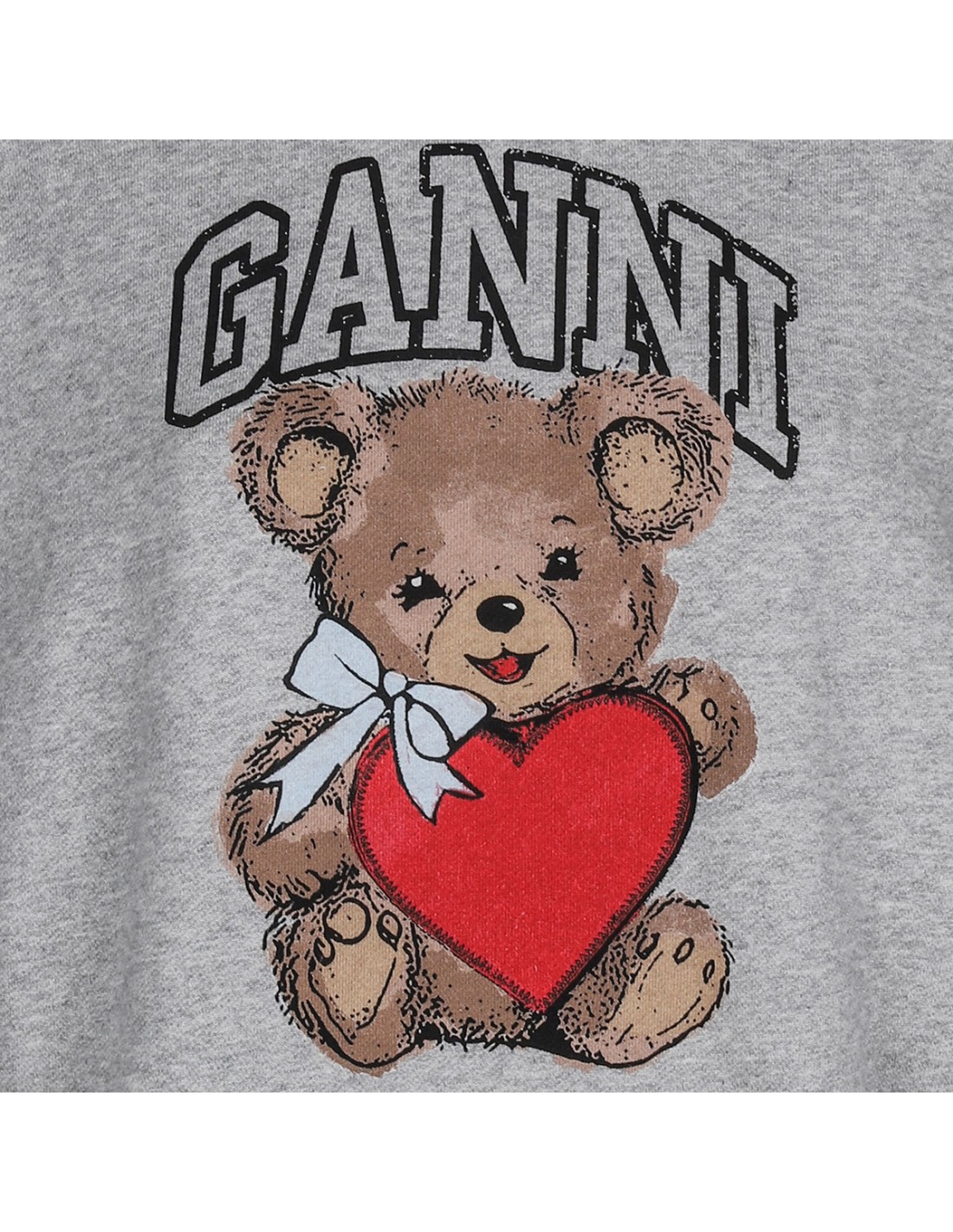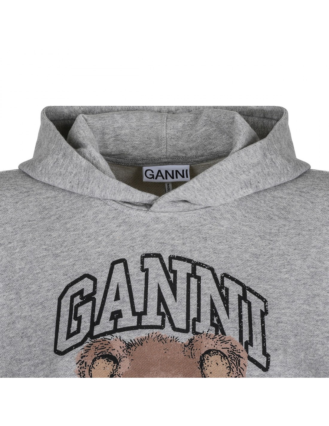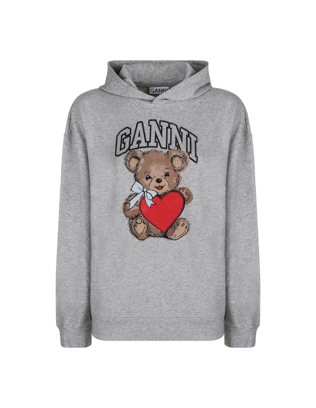 Gray melange organic cotton Isoli hoodie from Ganni featuring graphic bear and logo on front, fixed hood, long sleeves, dropped shoulders, oversized silhouette ribbed-knit edges.