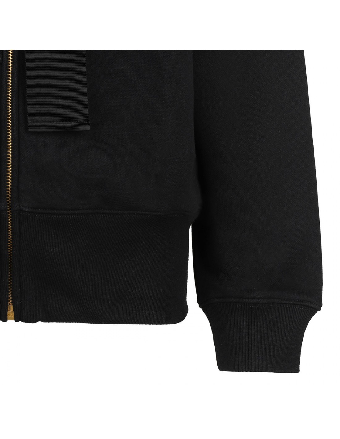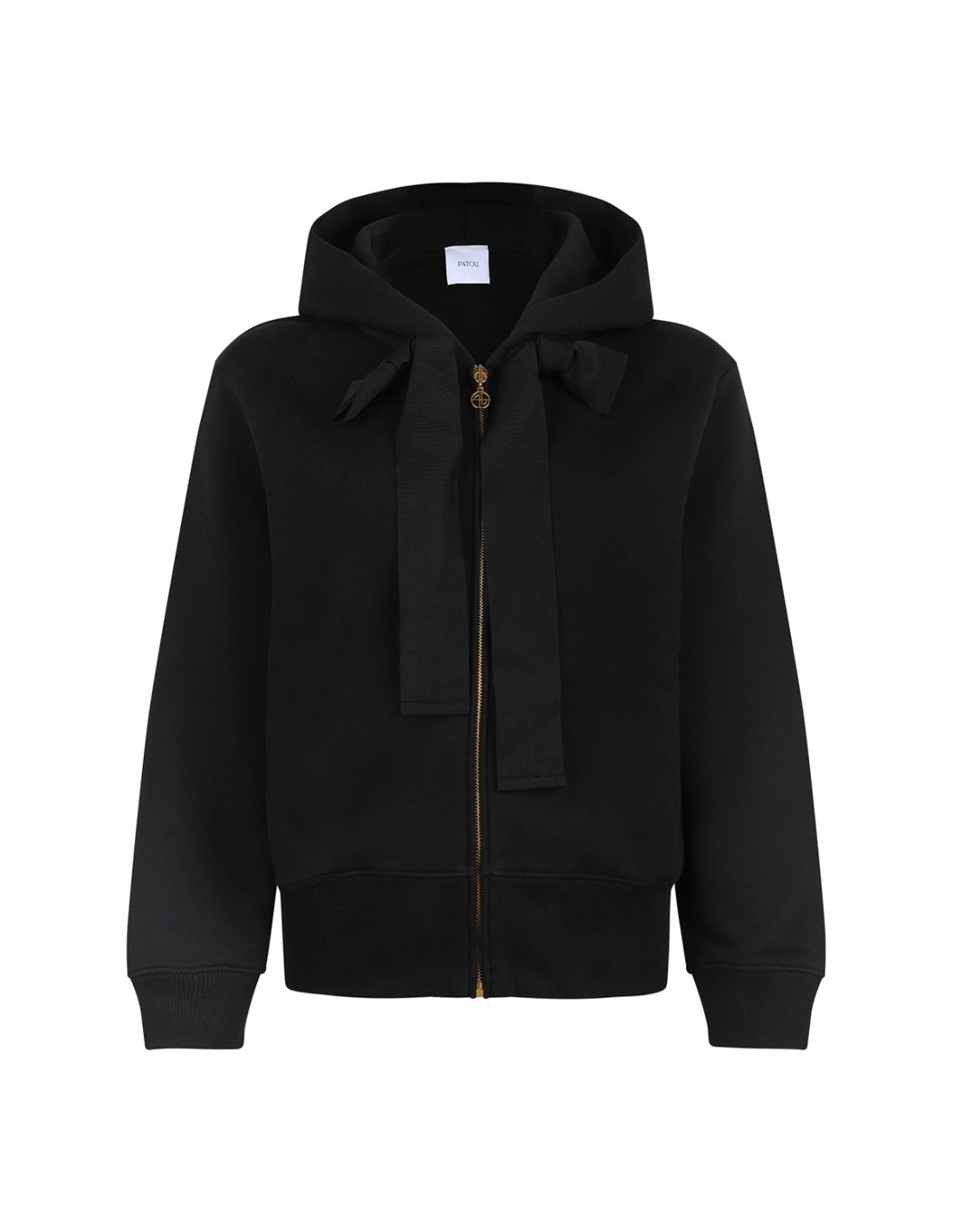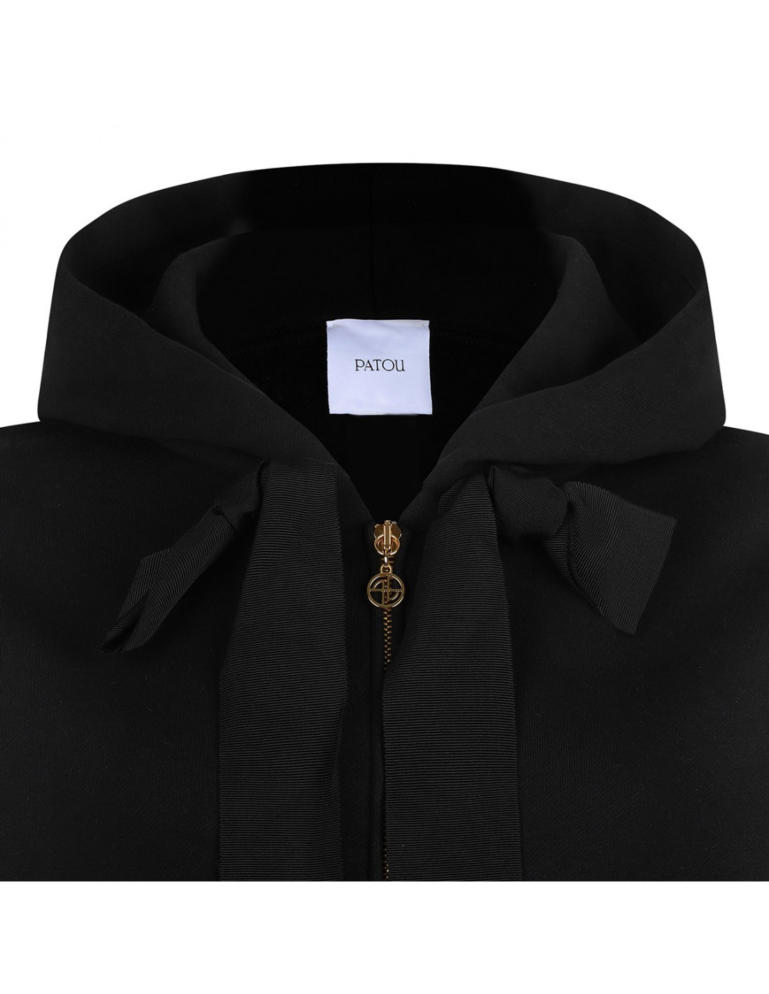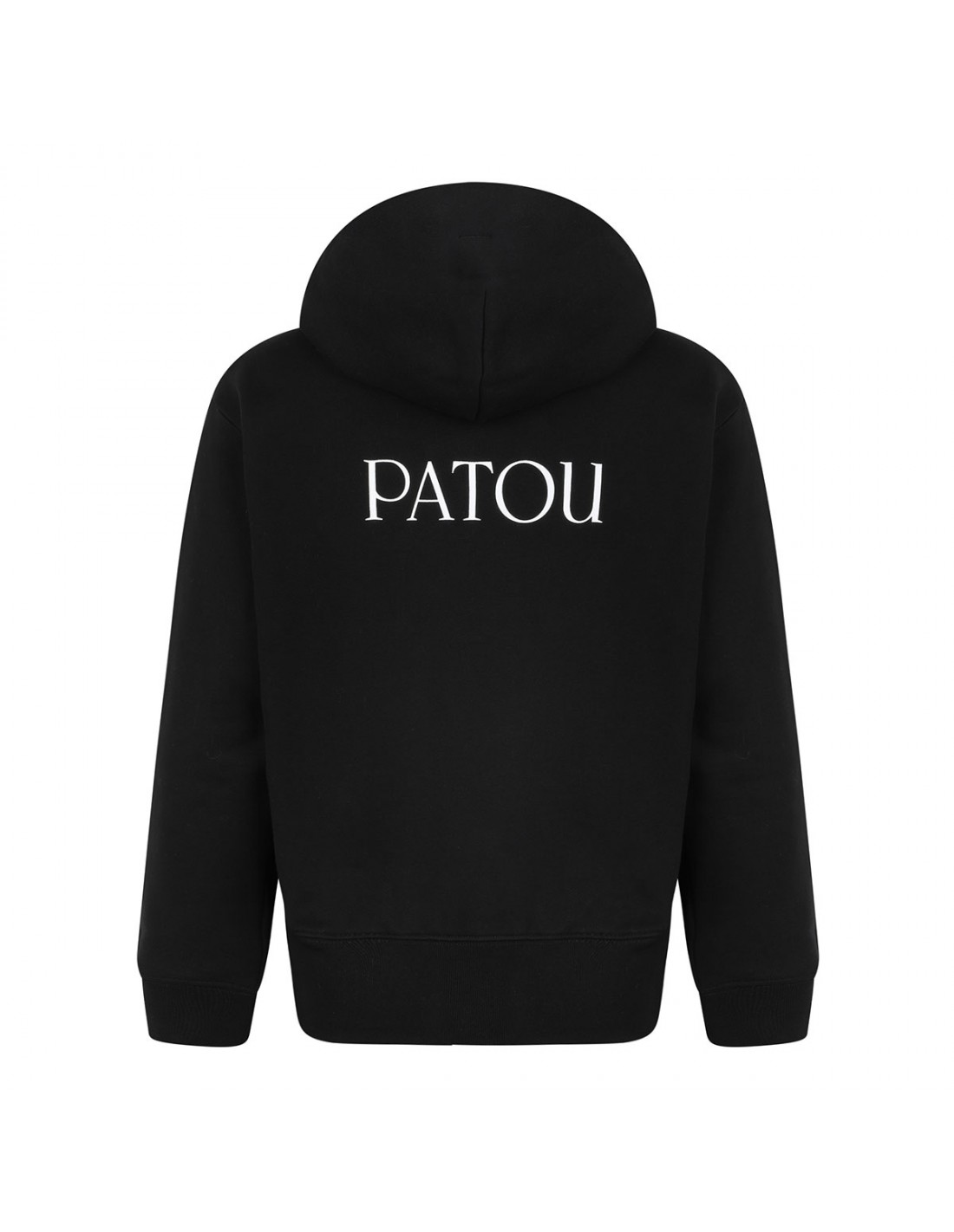 Black organic cotton hoodie from Patou featuring zip fastening along front, hood with exaggerated grosgrain drawstring, lettering logo in white at back, long sleeves, ribbed-knit cuffs and waistband.
