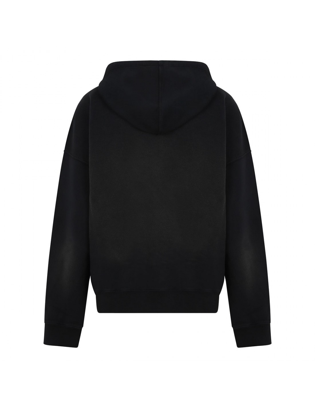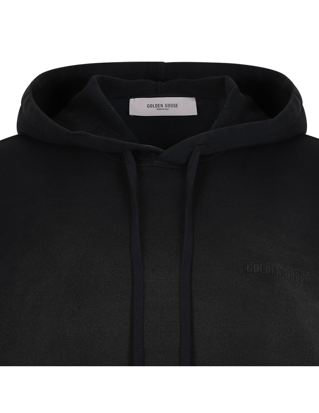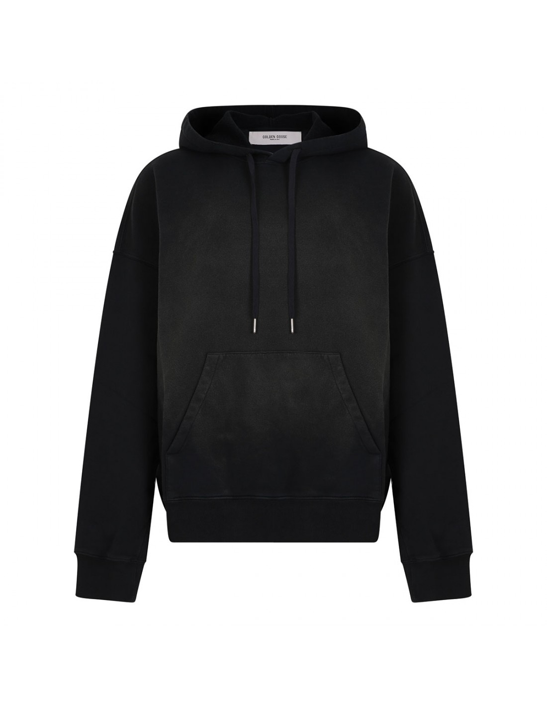 Black cotton sweatshirt from Golden Goose featuring bleached effect, black logo embroidery on chest, lived in treatment, hood with drawstring, kangaroo pocket, oversized fit, two little stars on back, long sleeves, ribbed-knit edges.
