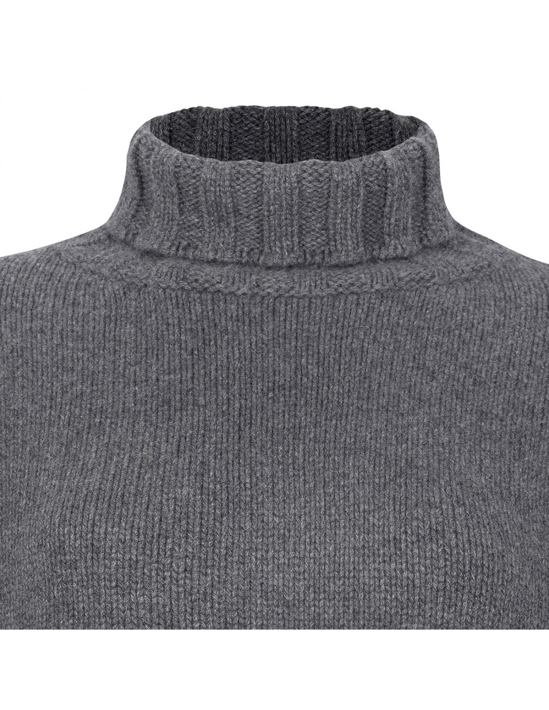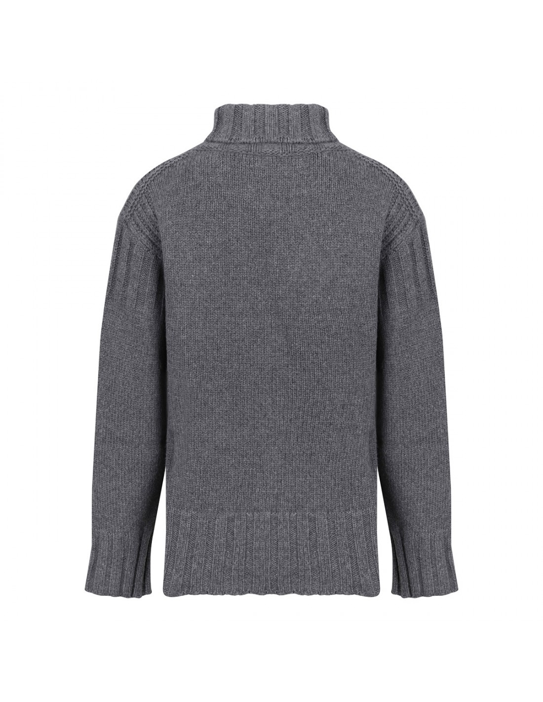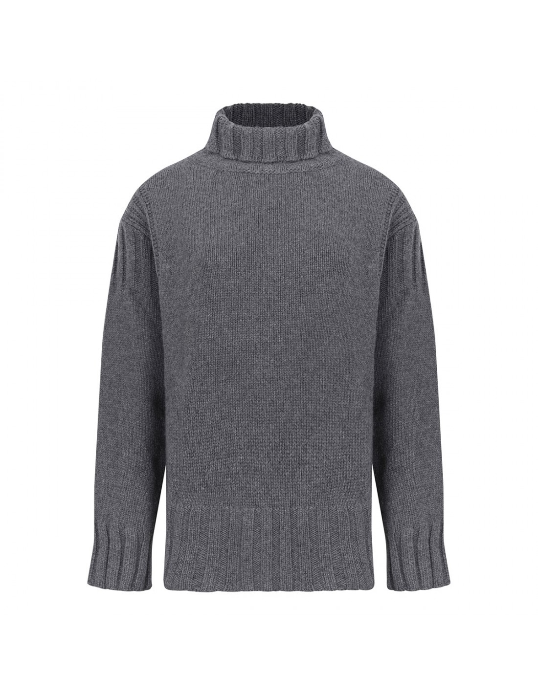Gray virgin wool sweater from Jil Sander featuring turtleneck, slightly dropped shoulders, long sleeves, wide ribbed knit edges.