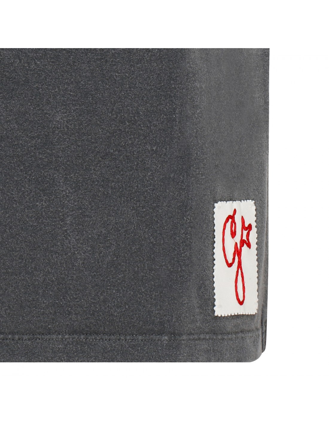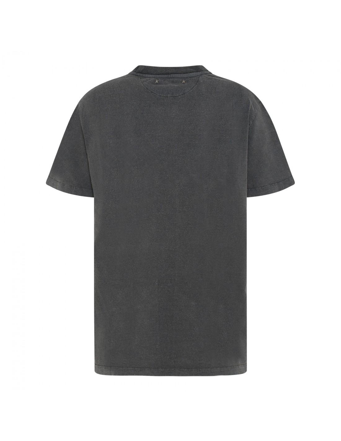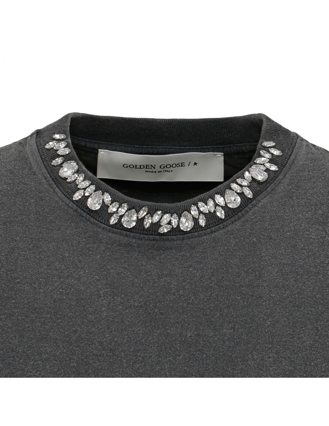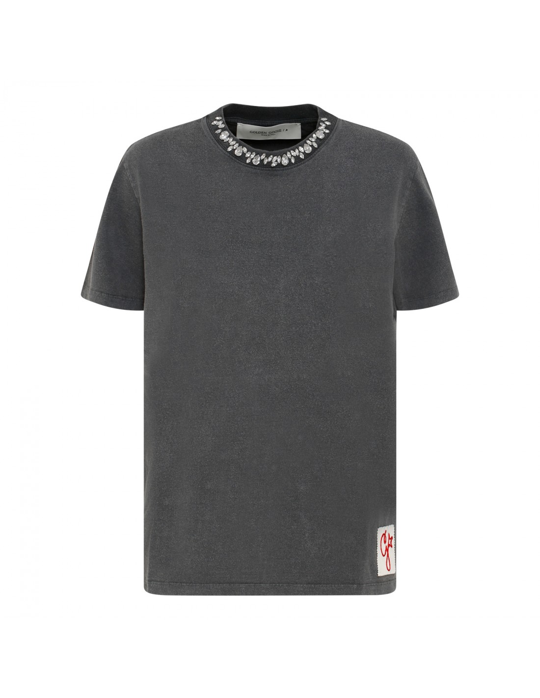 Gray cotton jersey T-shirt from Golden Goose featuring cabochon crystal embellishment on crew collar, distressed finishing, short sleeves, double gold star on back, detachable white patch with embroidered red letter G, regular fit.