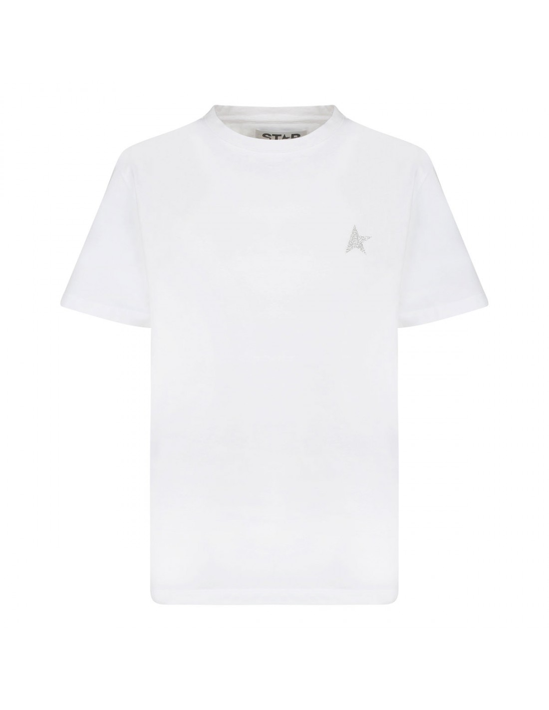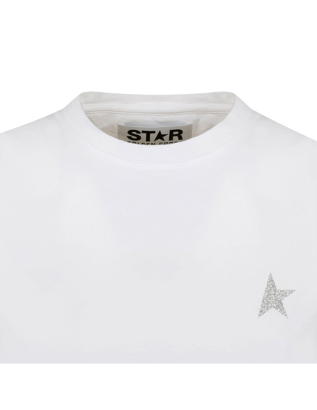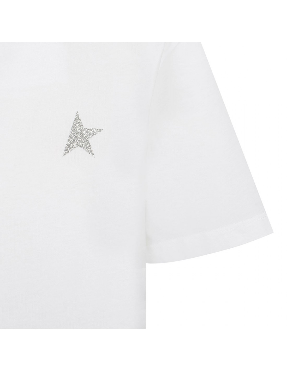 White cotton T-shirt from Golden Goose with silver star print on chest, short sleeves, ribbed crew collar, regular fit.