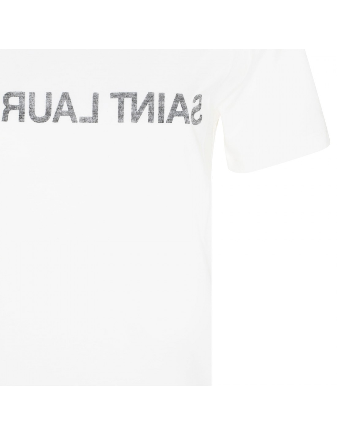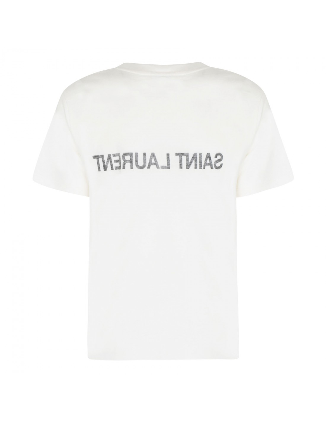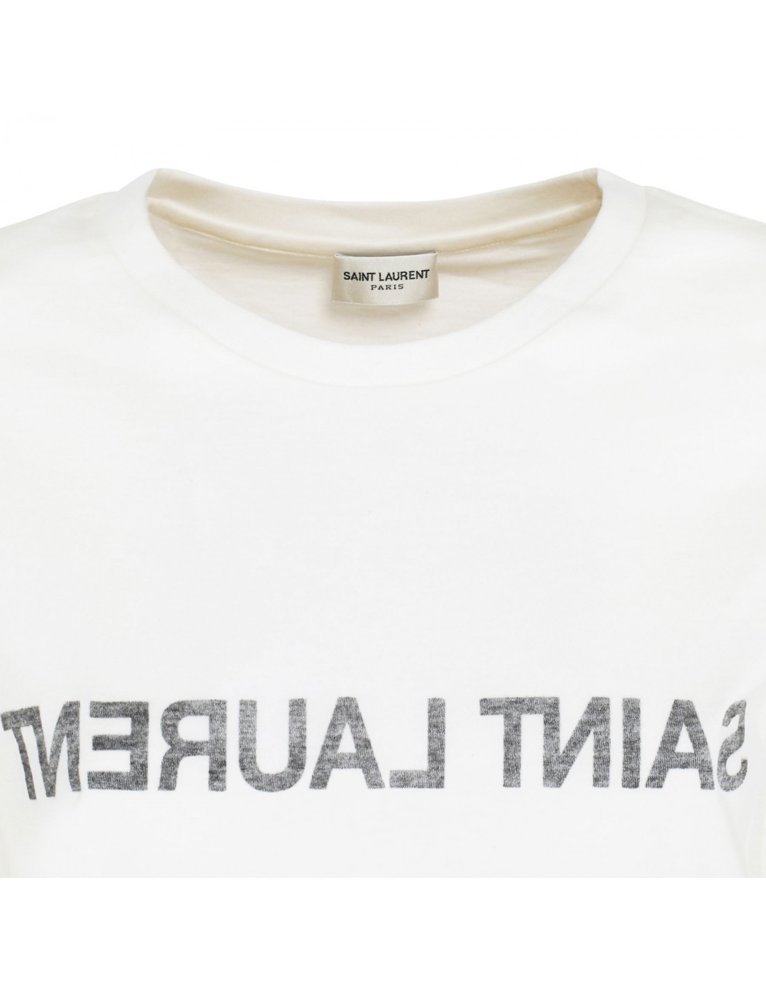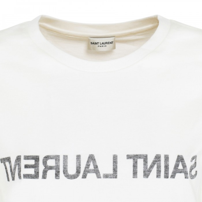 White cotton T-shirt from Saint Laurent featuring contrasting reverse logo printed on front and on back, ribbed crew collar, short sleeves and straight hem.