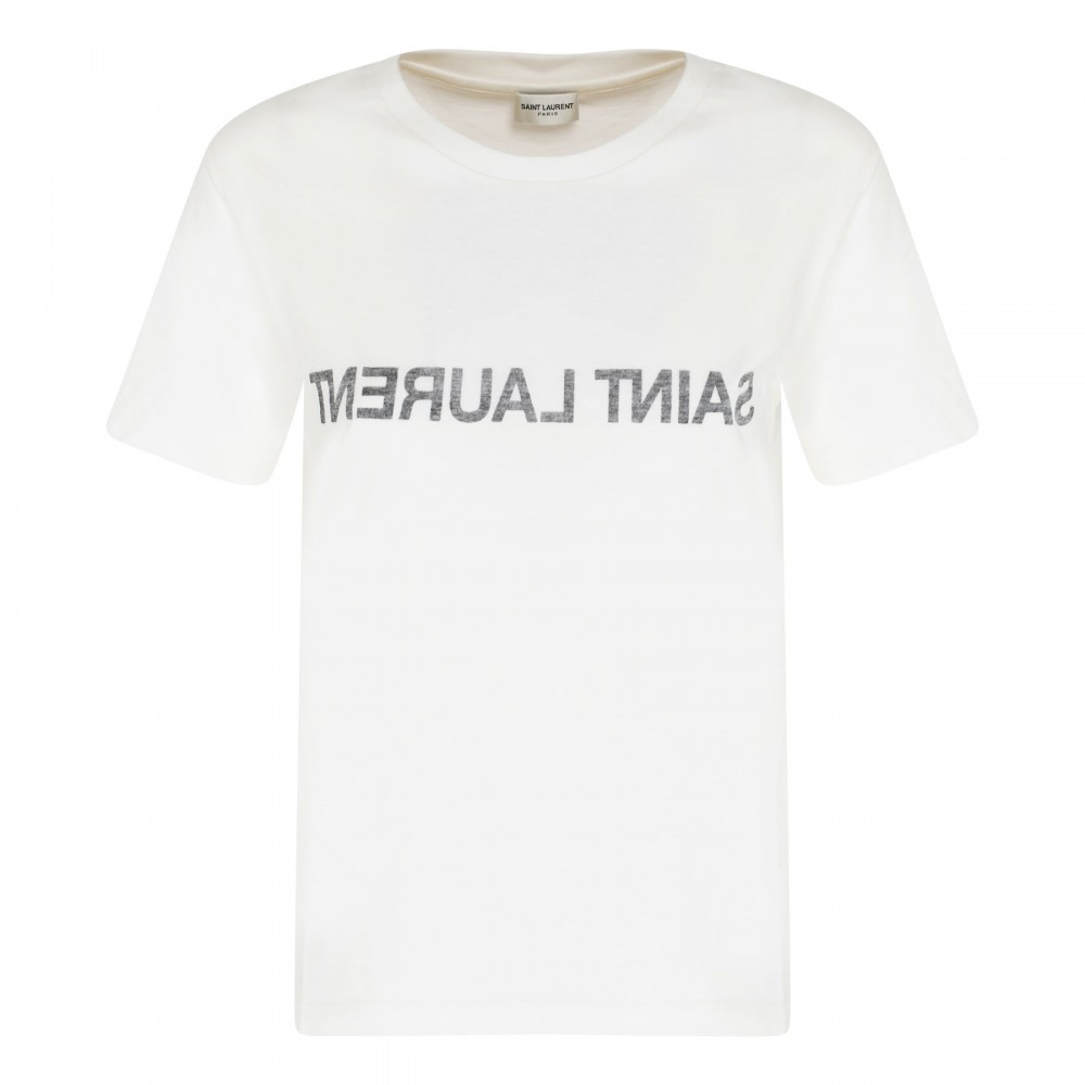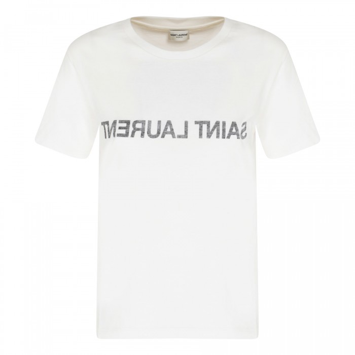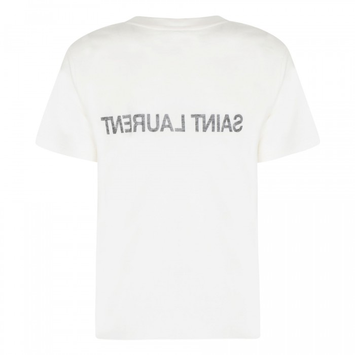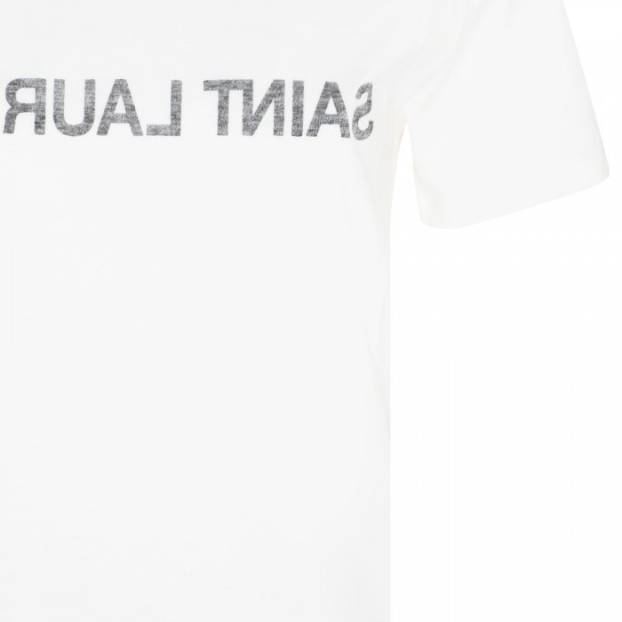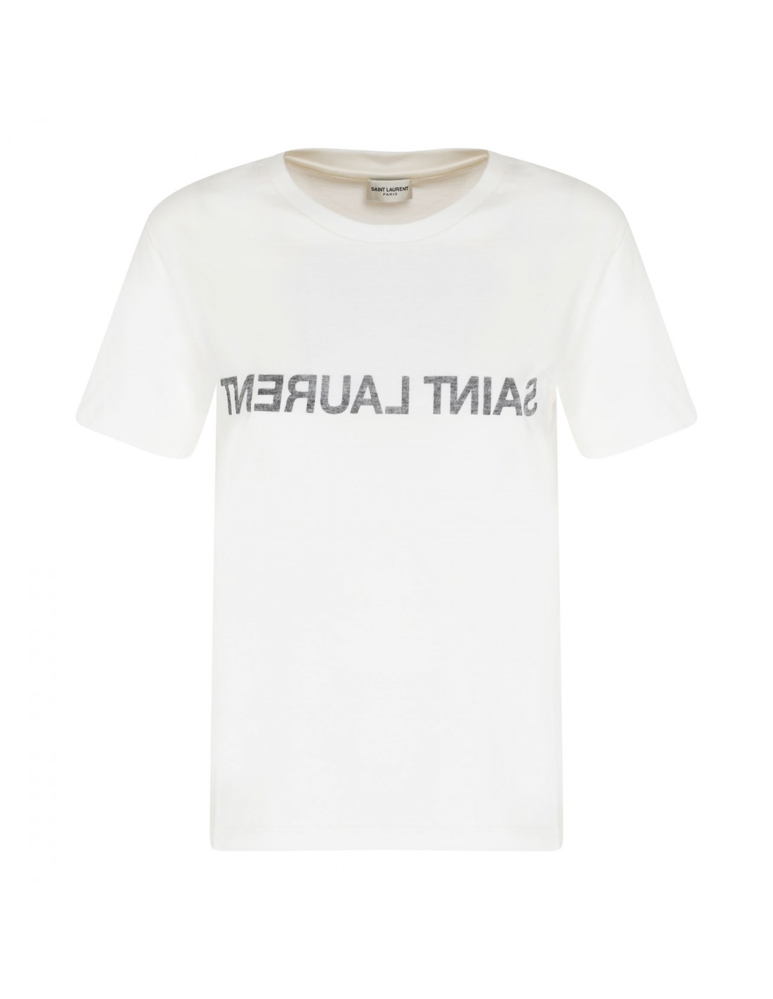 White cotton T-shirt from Saint Laurent featuring contrasting reverse logo printed on front and on back, ribbed crew collar, short sleeves and straight hem.