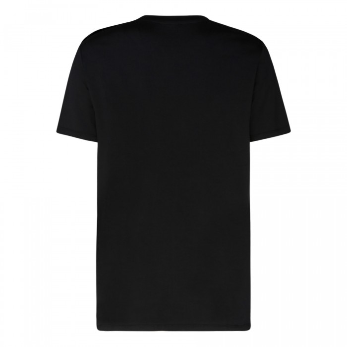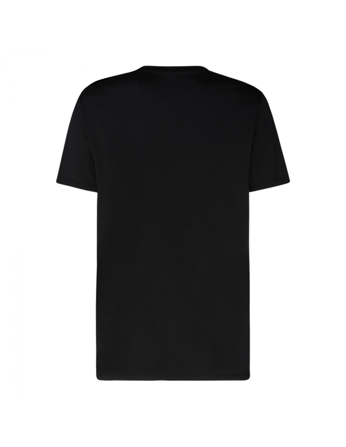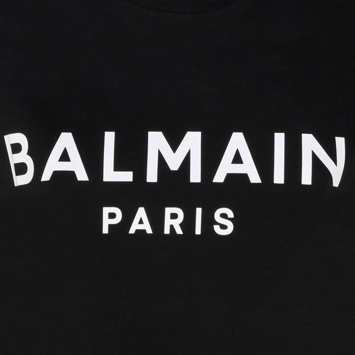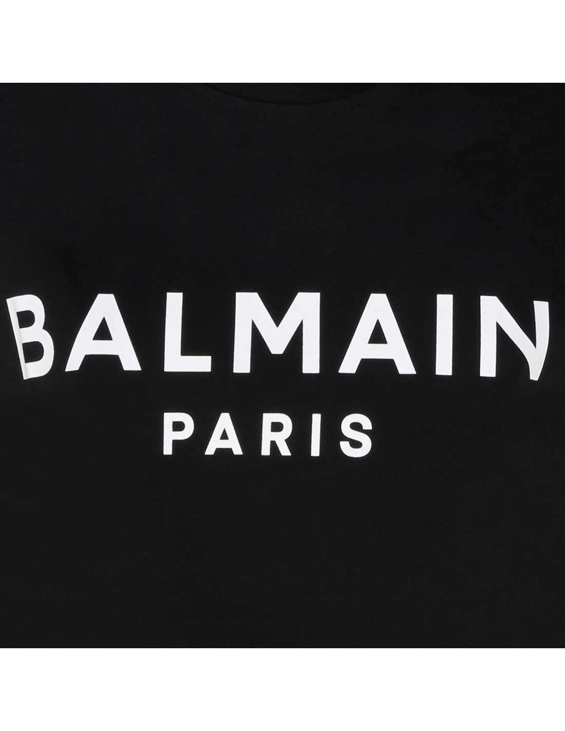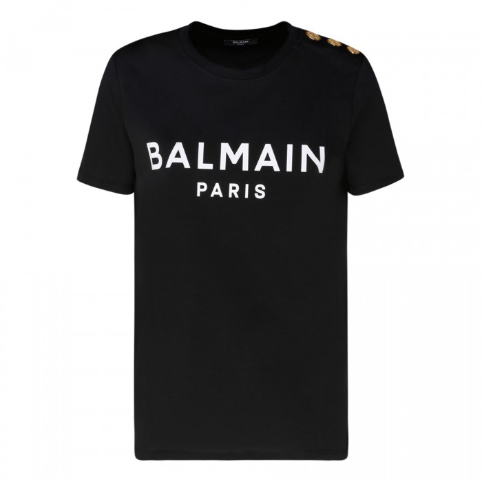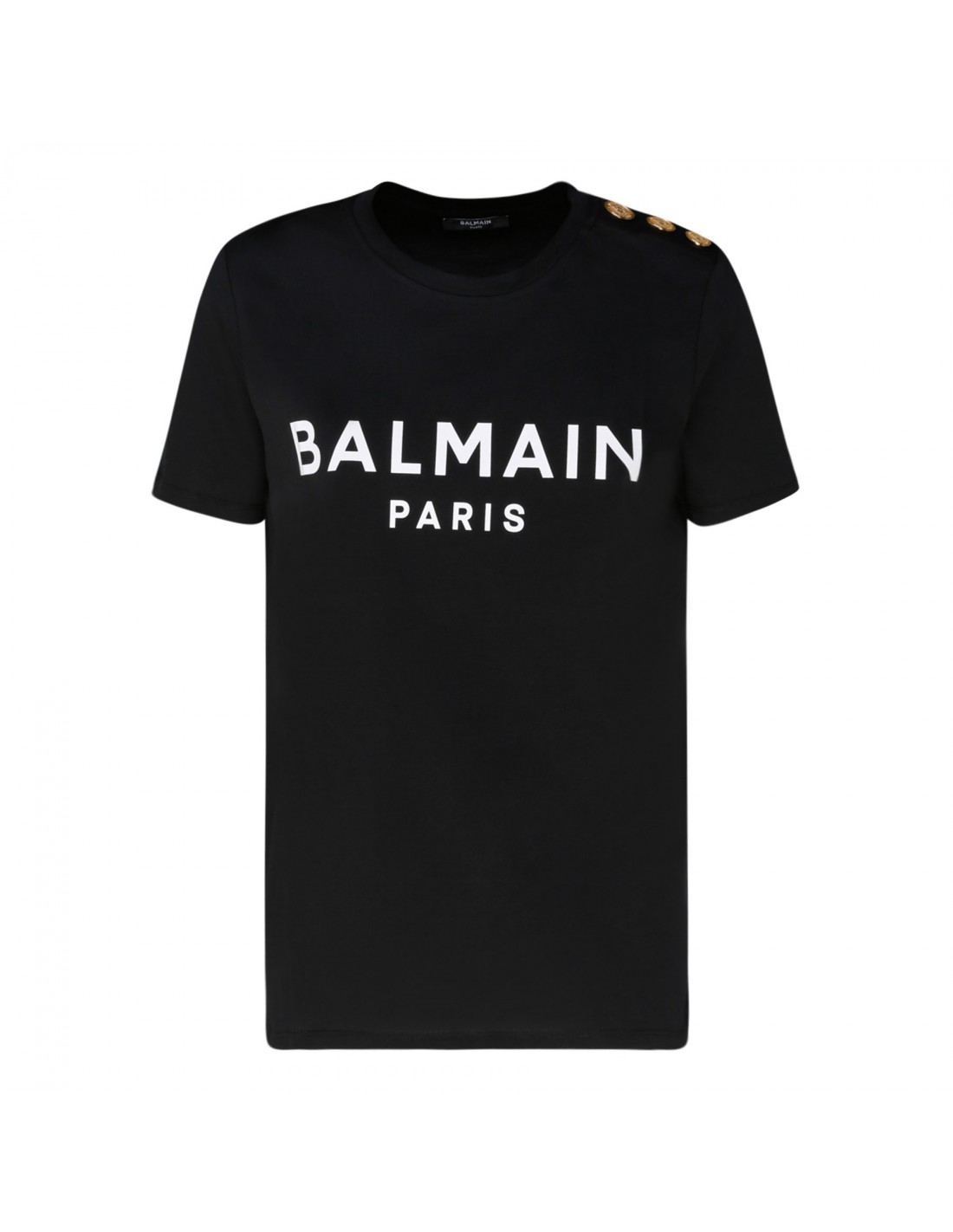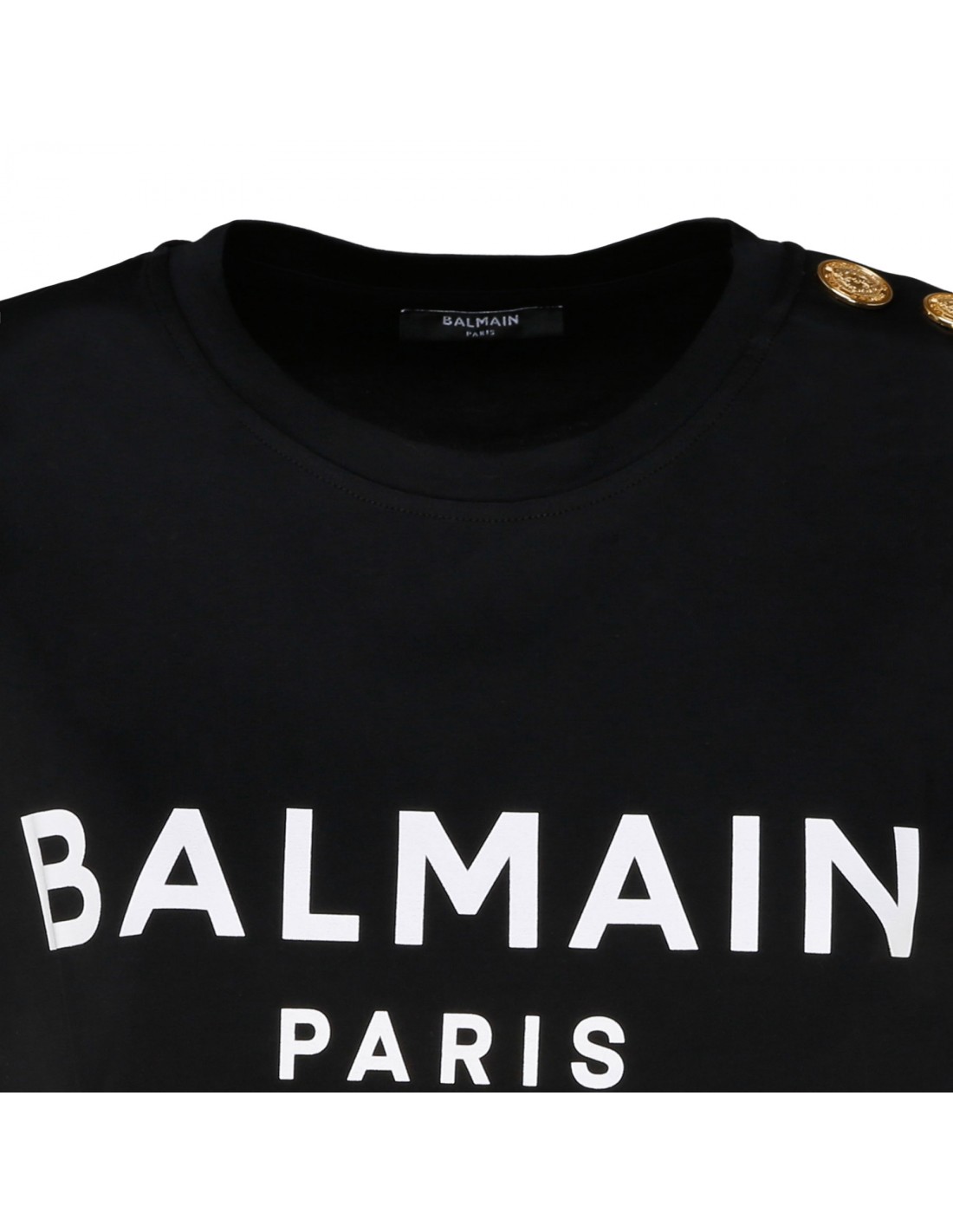 Black cotton T-shirt from Balmain featuring printed Balmain logo on chest, signature gold "crest" engraved buttons on shoulder, straight fit, ribbed crew neckline and short sleeves.