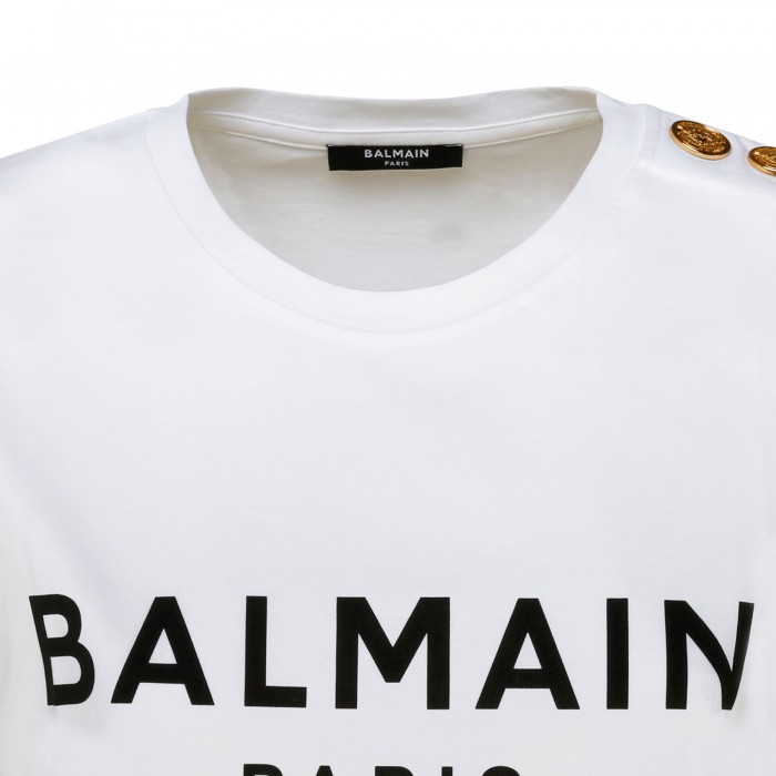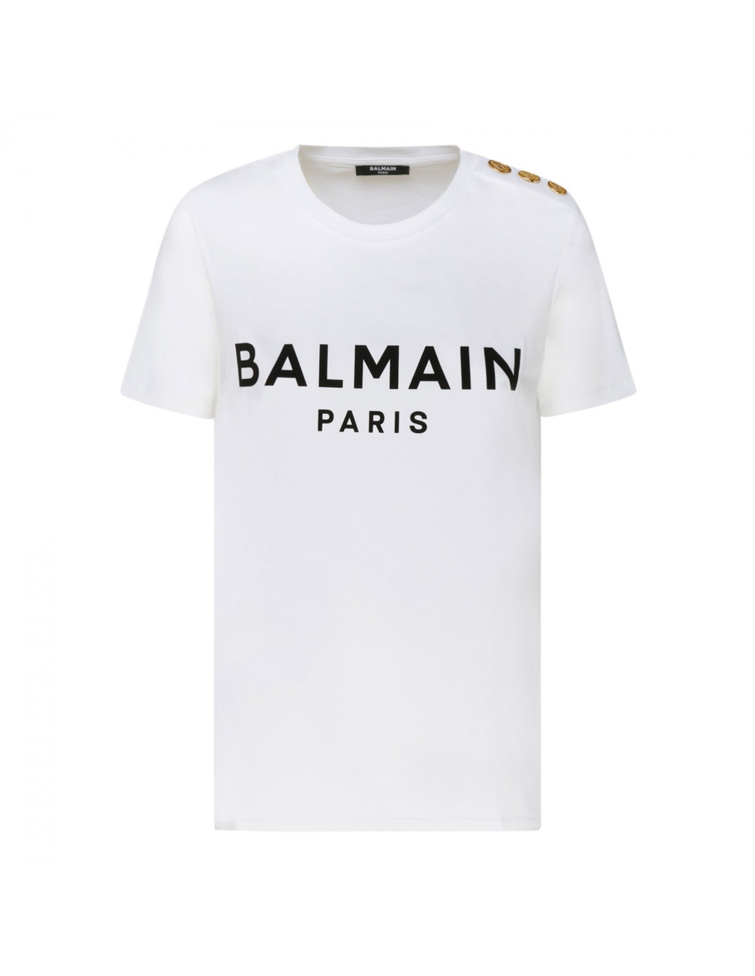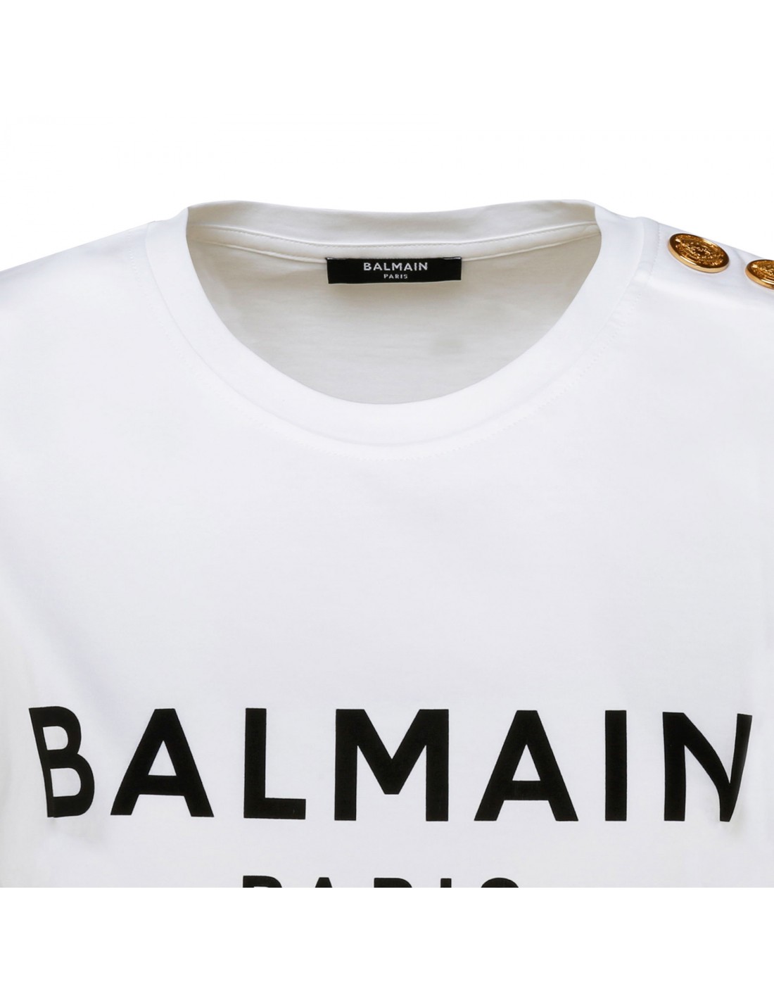 White cotton T-shirt from Balmain featuring printed Balmain logo on chest, signature gold "crest" engraved buttons on shoulder, straight fit, ribbed crew neckline and short sleeves.