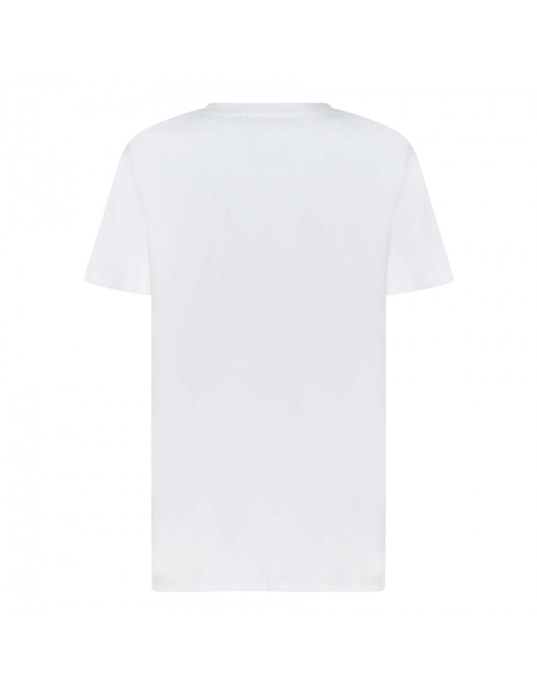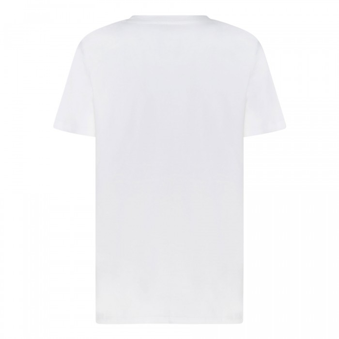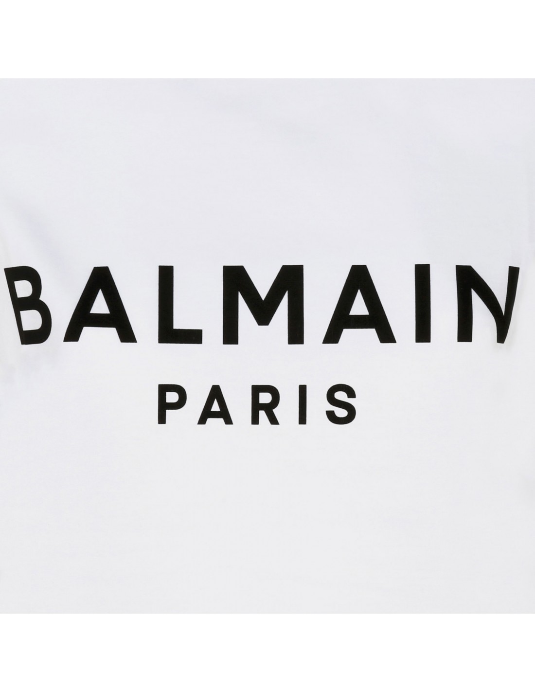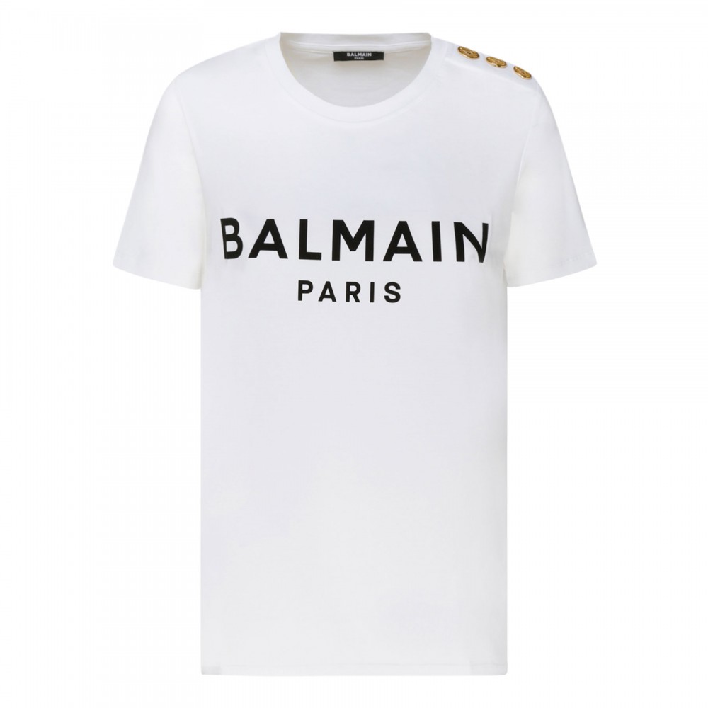 White cotton T-shirt from Balmain featuring printed Balmain logo on chest, signature gold "crest" engraved buttons on shoulder, straight fit, ribbed crew neckline and short sleeves.