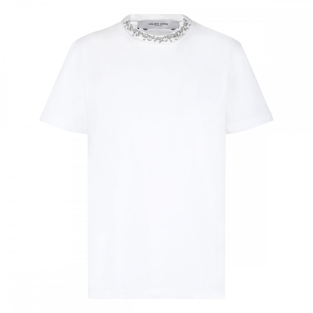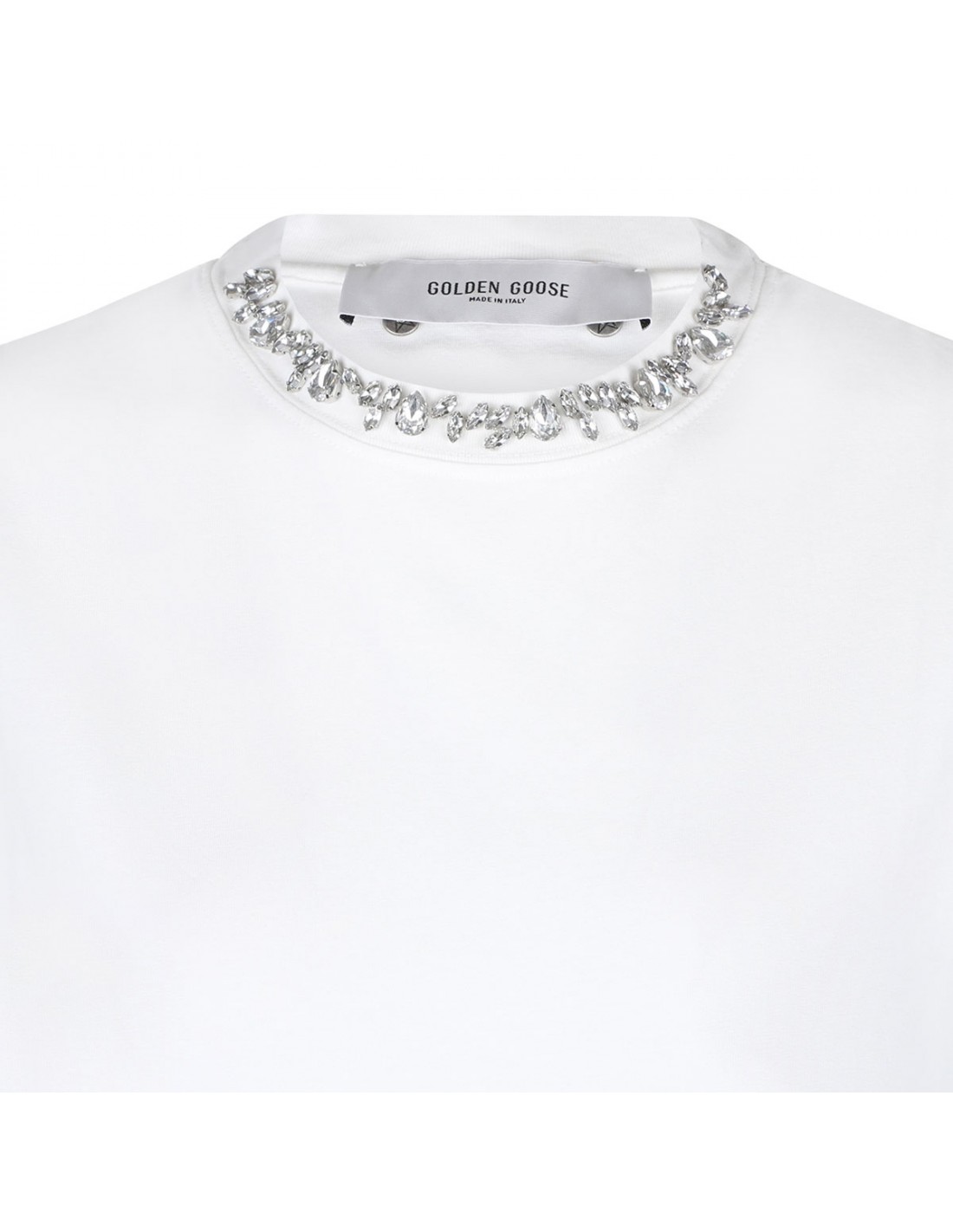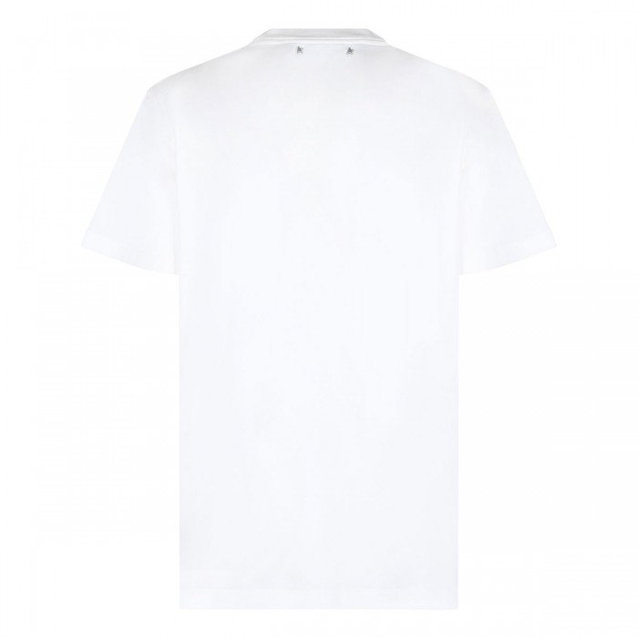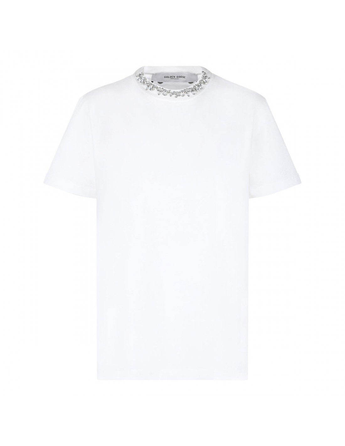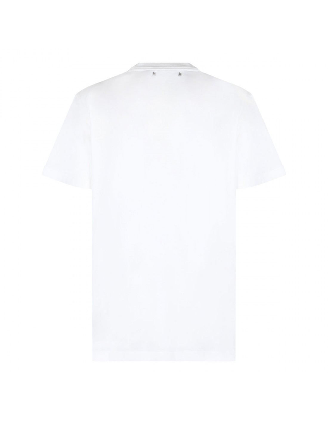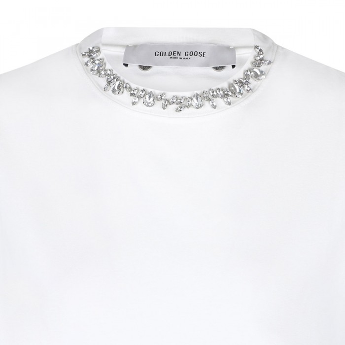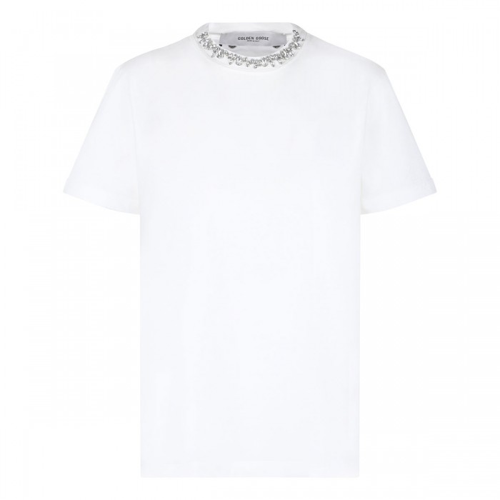 Vintage white cotton T-shirt from Golden Goose featuring cabochon crystals on collar, double gold star on back, short sleeves, crew collar, distressed finish and regular fit.