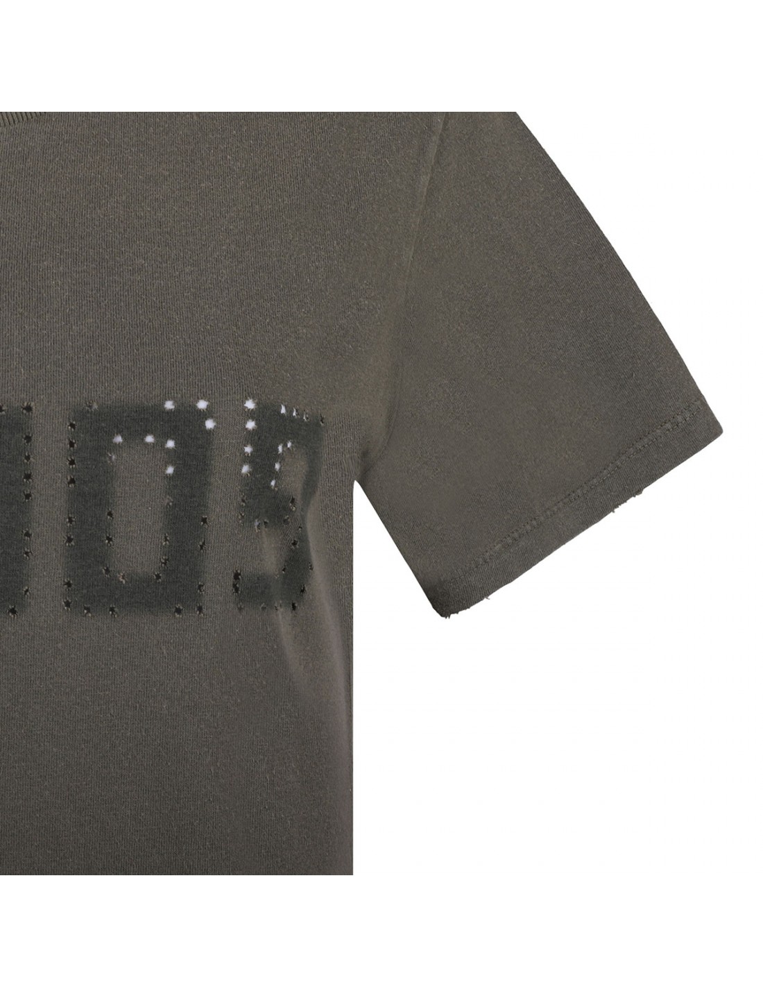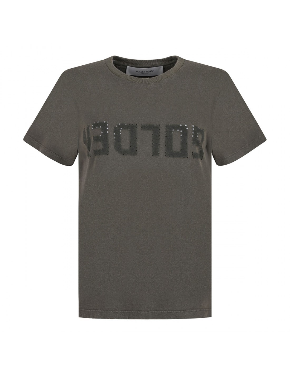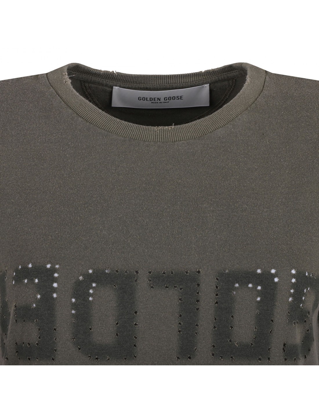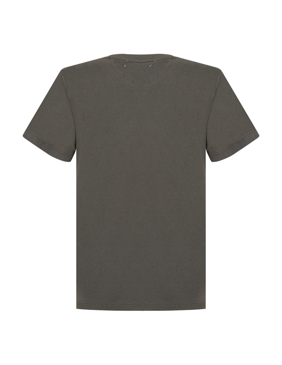 Dusty green cotton T-shirt from Golden Goose featuring Golden logo with distressed treatment printed on front, detachable white patch with an embroidered letter G in red, short sleeves, ribbed crewneck, slightly fitted silhouette.