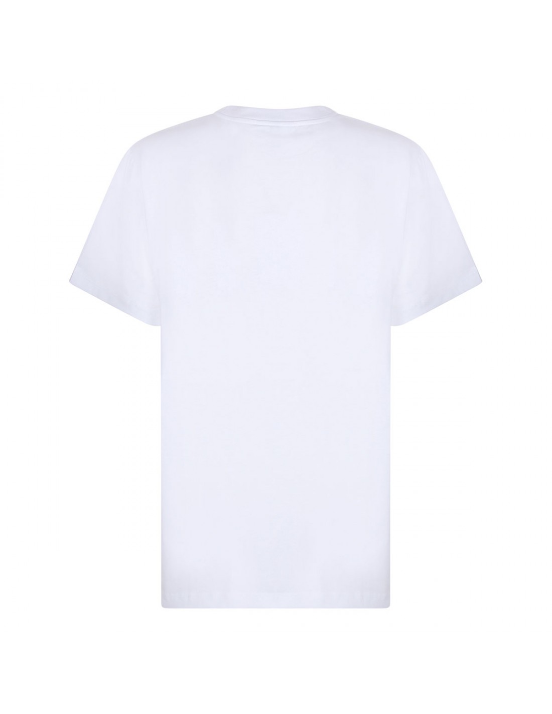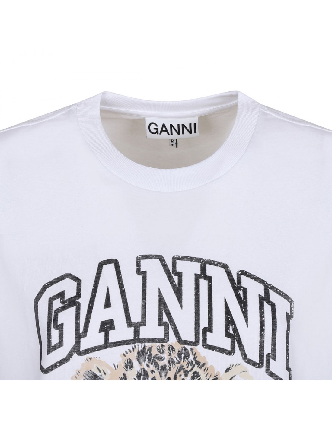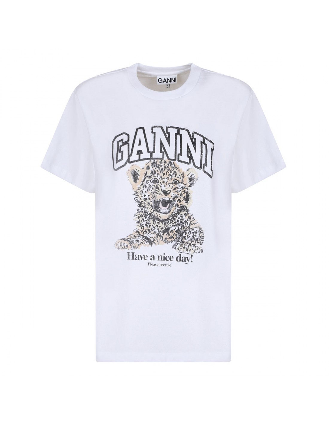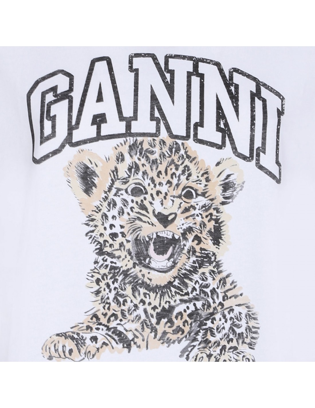 White organic cotton basic T-shirt from Ganni featuring logo, leopard and graphic printed on front, crew collar, short sleeves, ribbed-knit edges, relaxed silhouette.