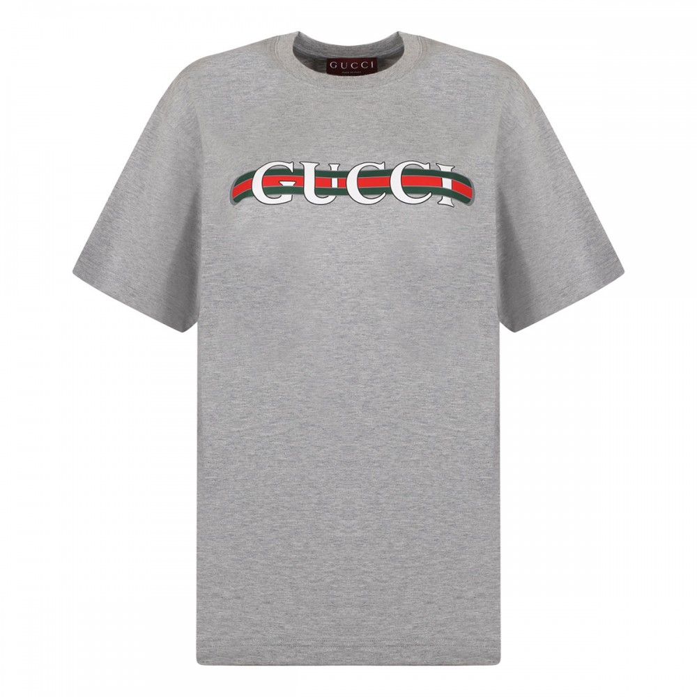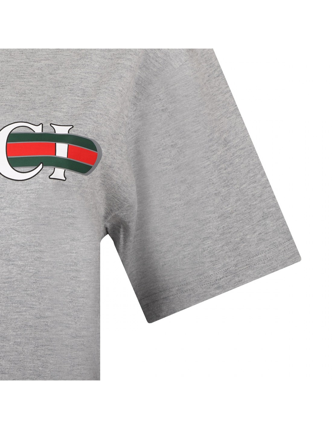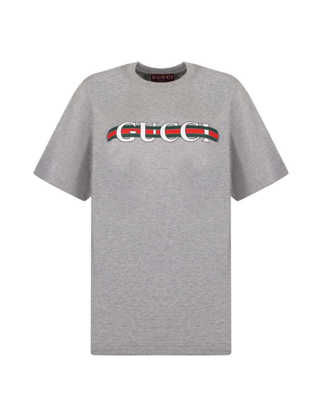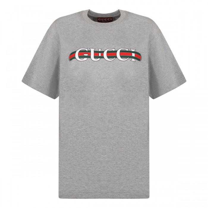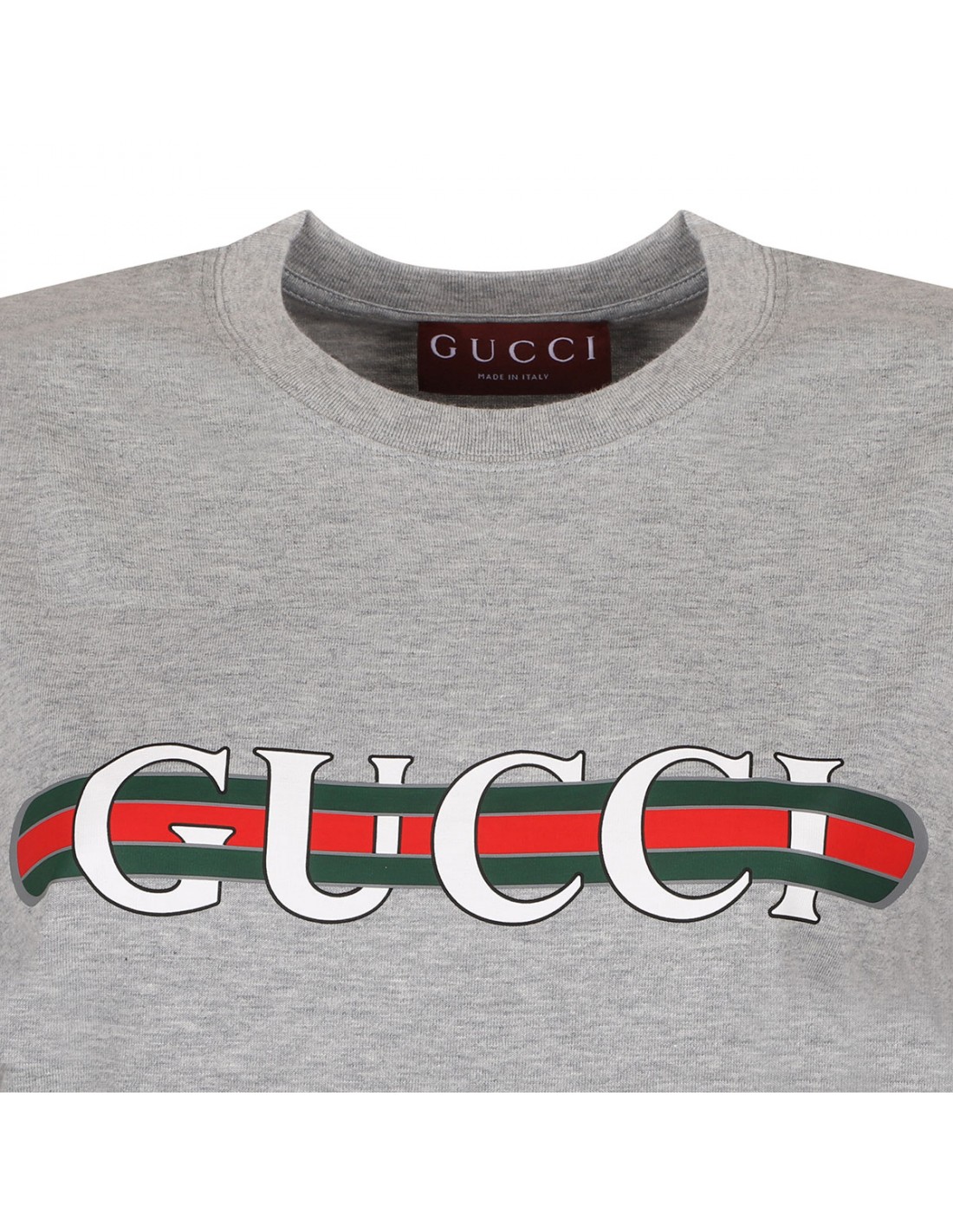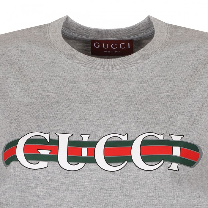 Gray cotton jersey T-shirt from Gucci featuring Web and logo print, crewneck, dropped shoulders, short sleeves, crew ribbed collar, regular fit.