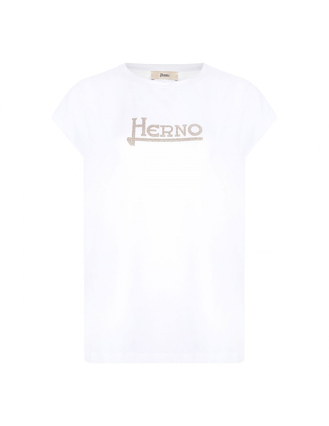 White compact stretch cotton interlock jersey T-shirt from Herno featuring chest printed logo with rhinestone embellishment, crew-neck, short cap sleeves, regular fit.