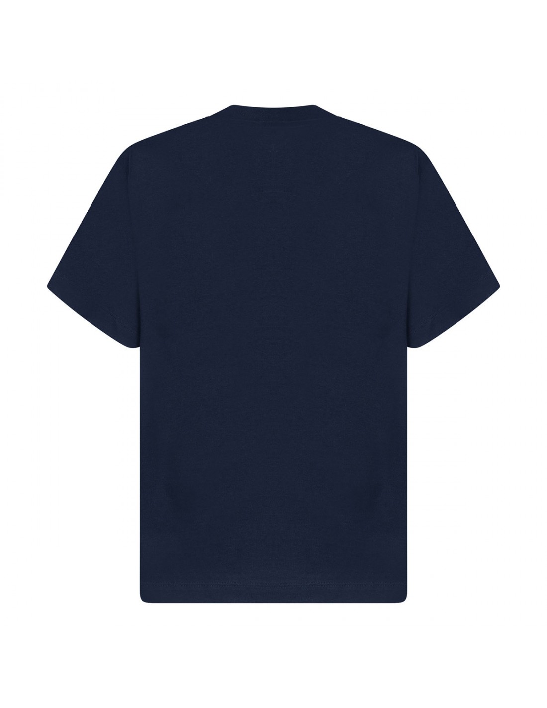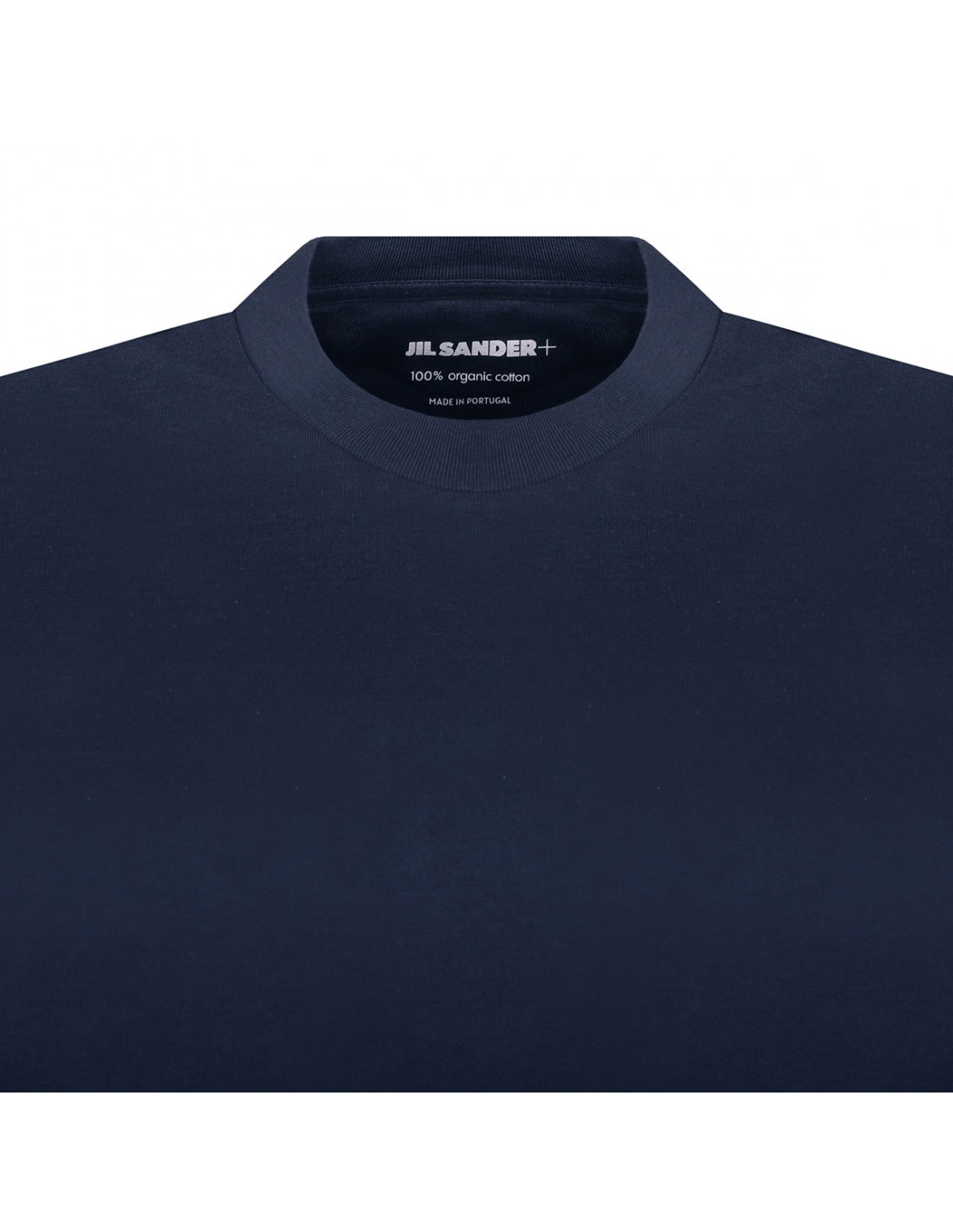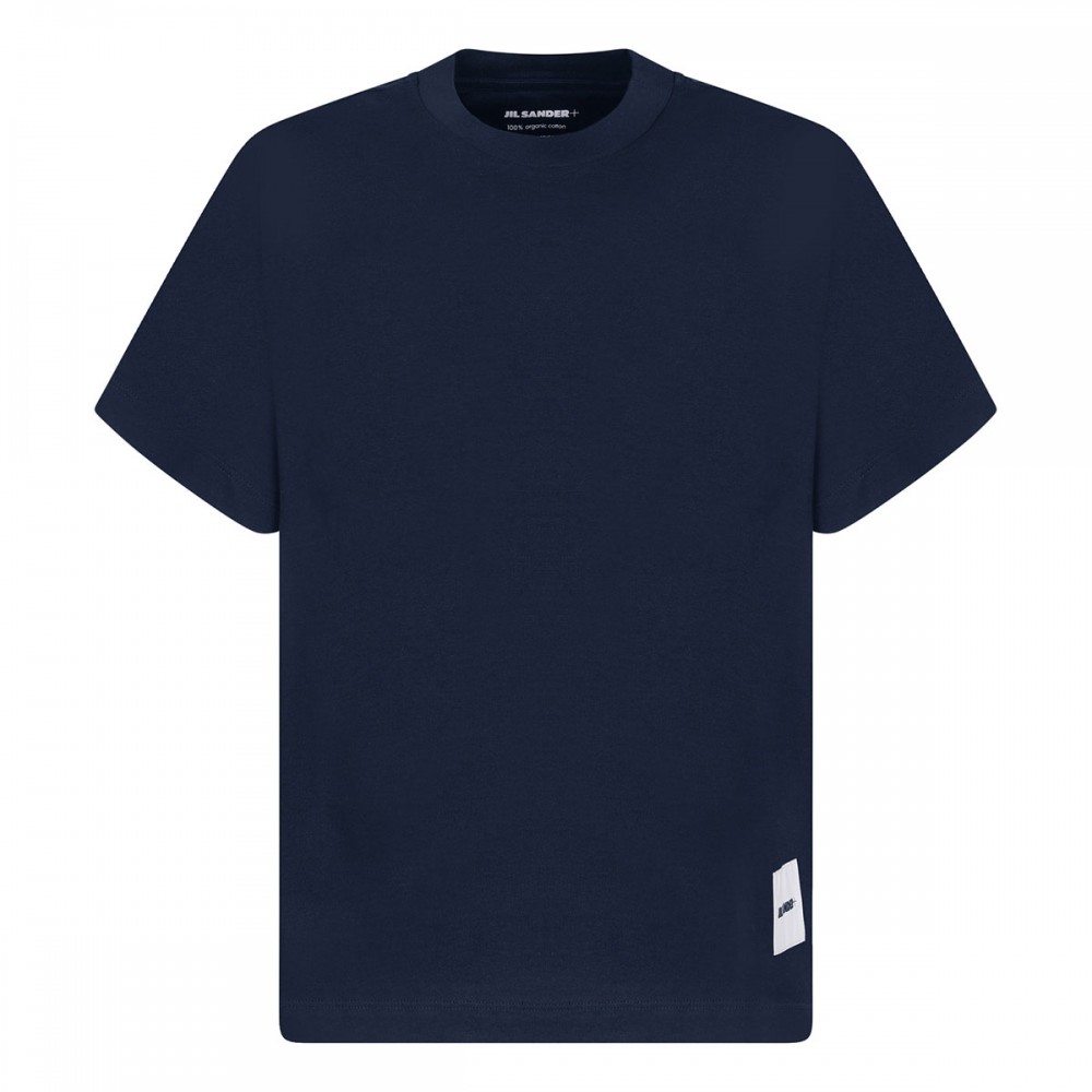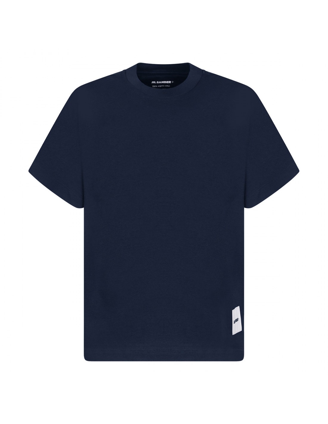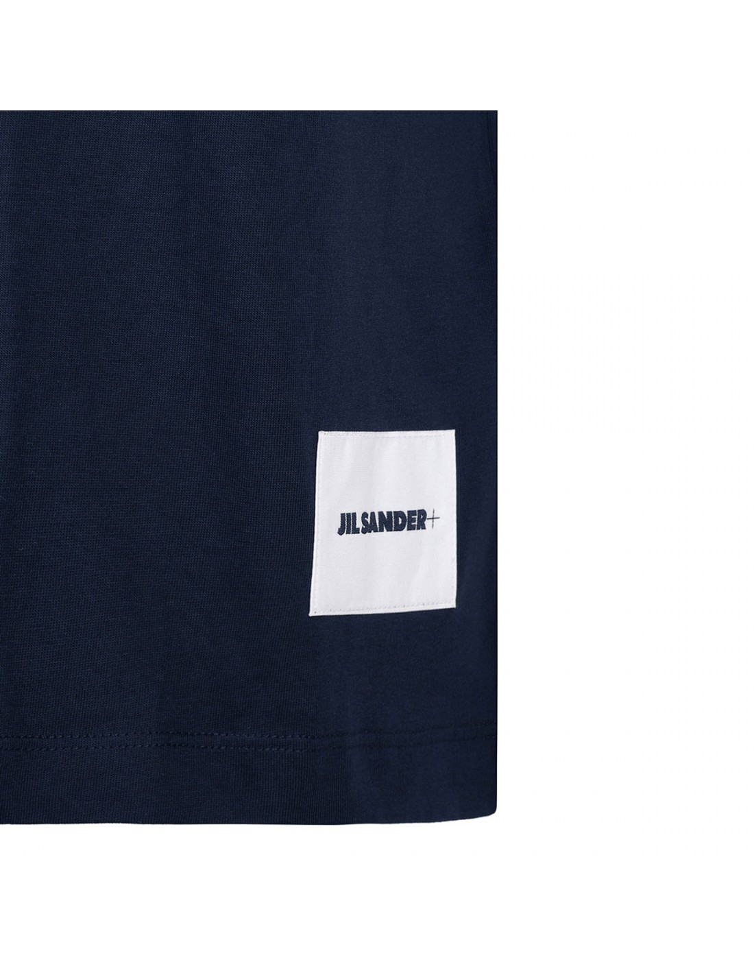 Set of three navy cotton jersey T-shirts from Jil Sander featuring crew-neck, short sleeves, logo patch on the front.