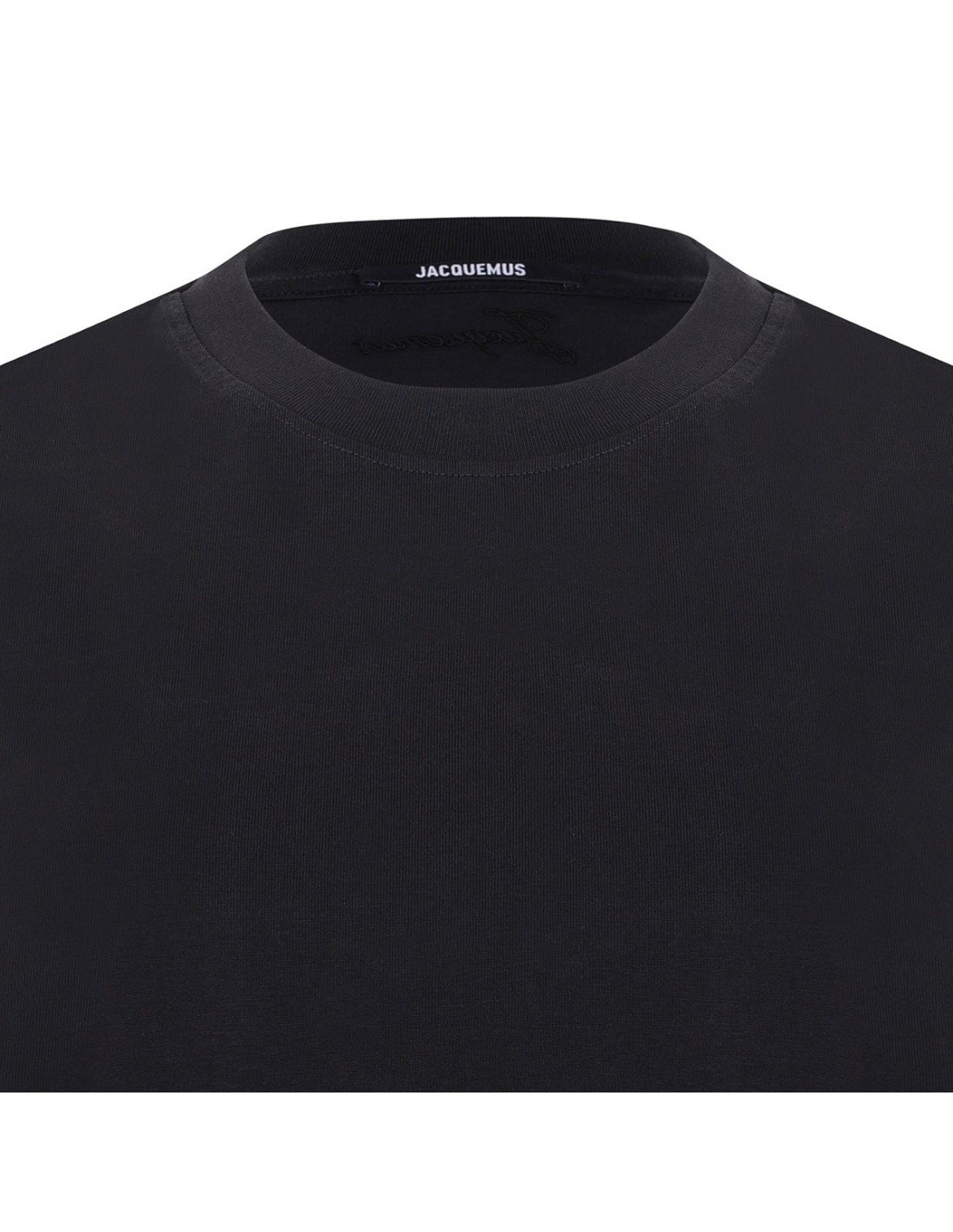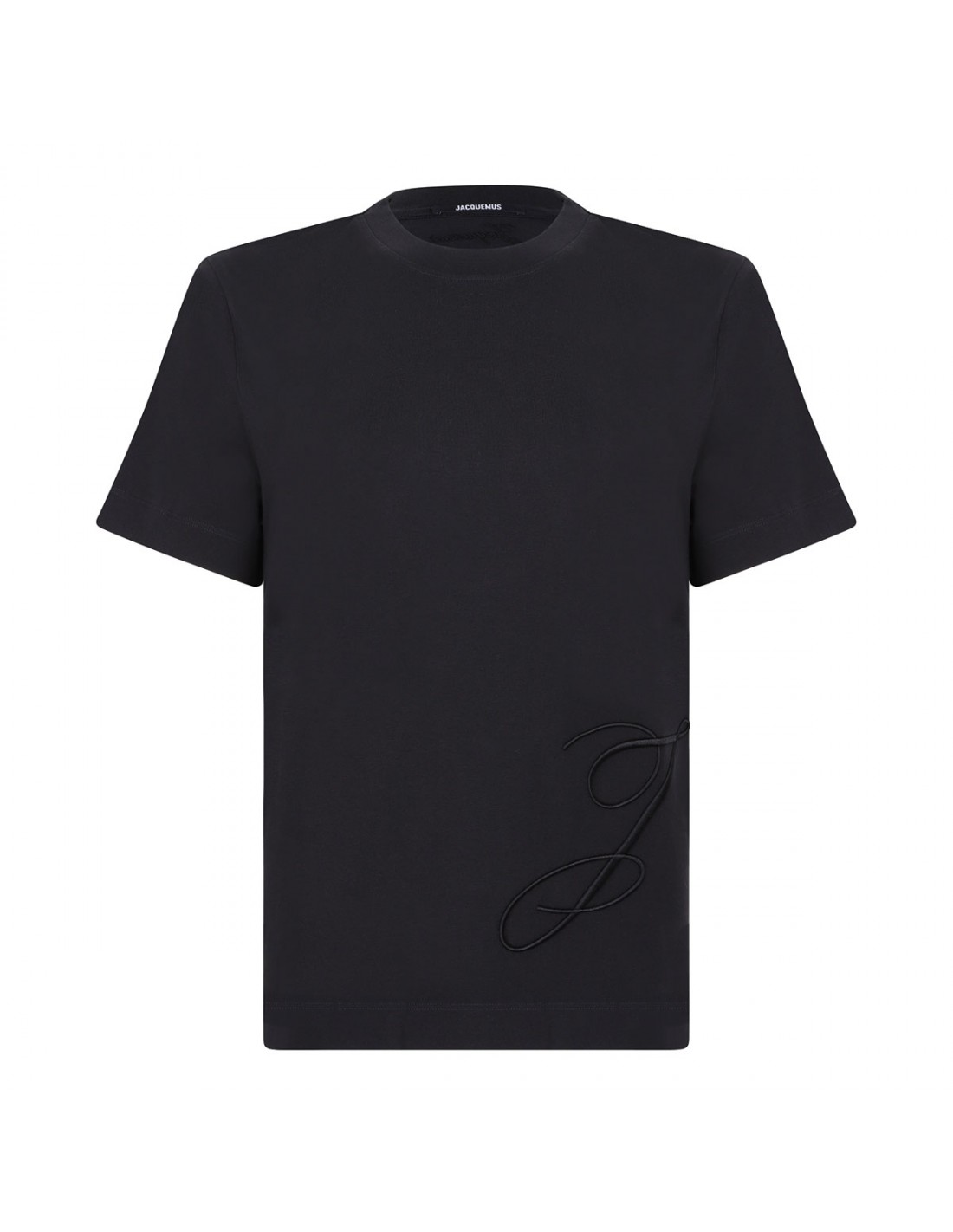 Dark navy cotton jersey The J T-shirt from Jacquemus featuring large embroidered J, ribbed crew neck, straight fit, short sleeves, above the hip length, embroidered logo on back.