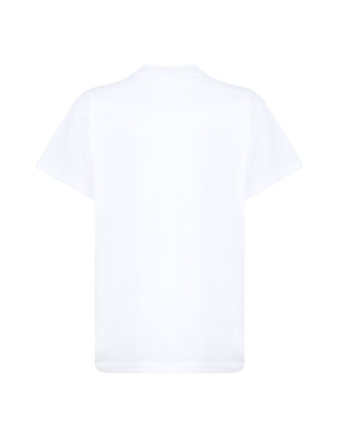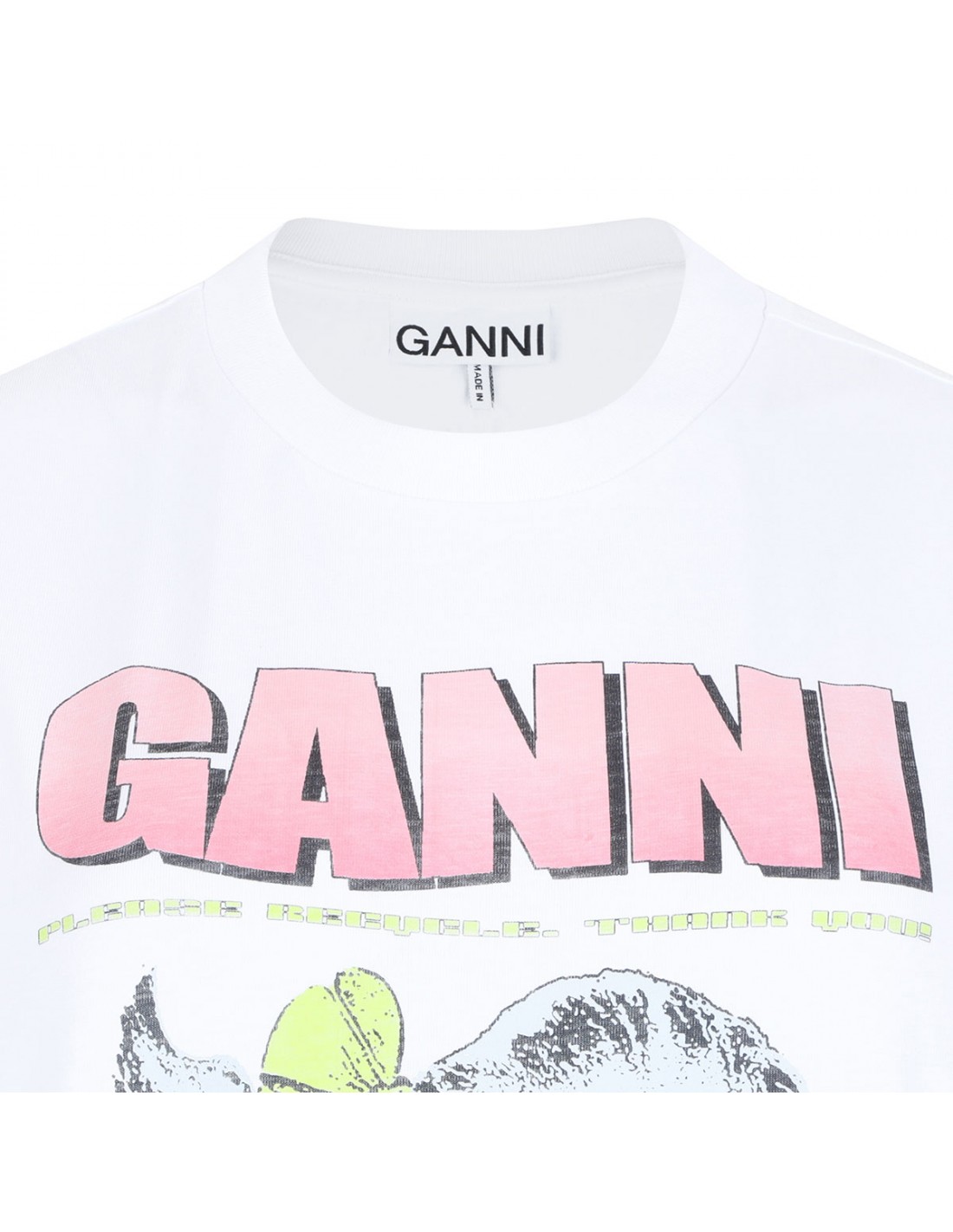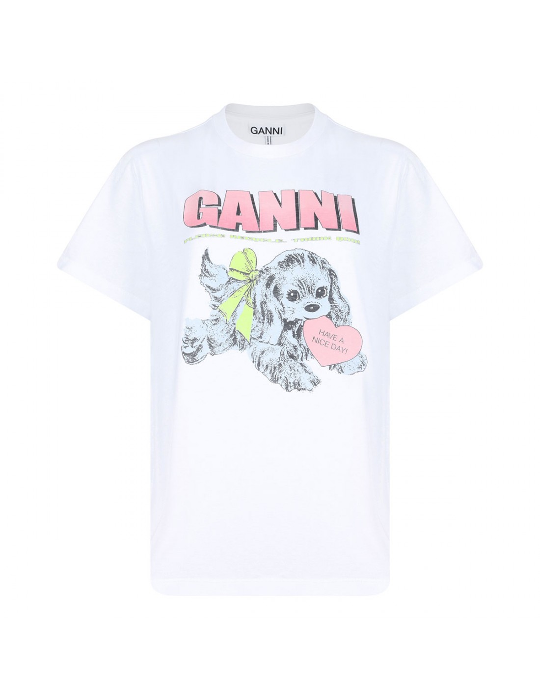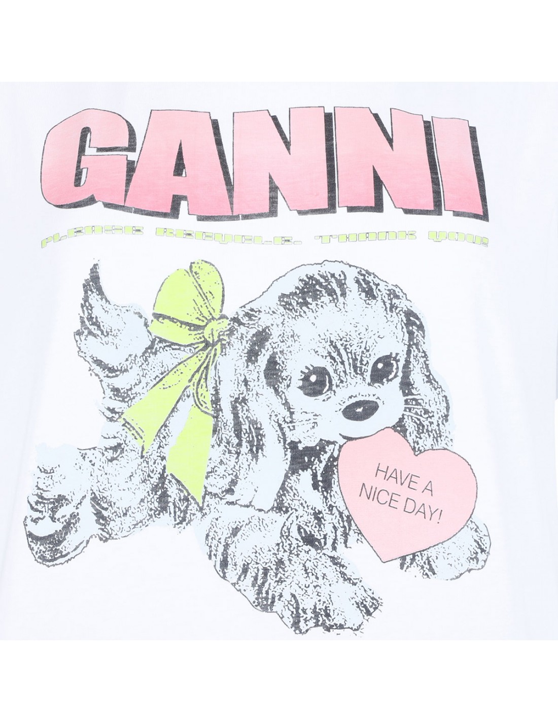 Bright white organic cotton T-shirt from Ganni featuring puppy graphic, logo and 'Have a nice day! Please recycle' message print on front, ribbed crewneck, short sleeves.