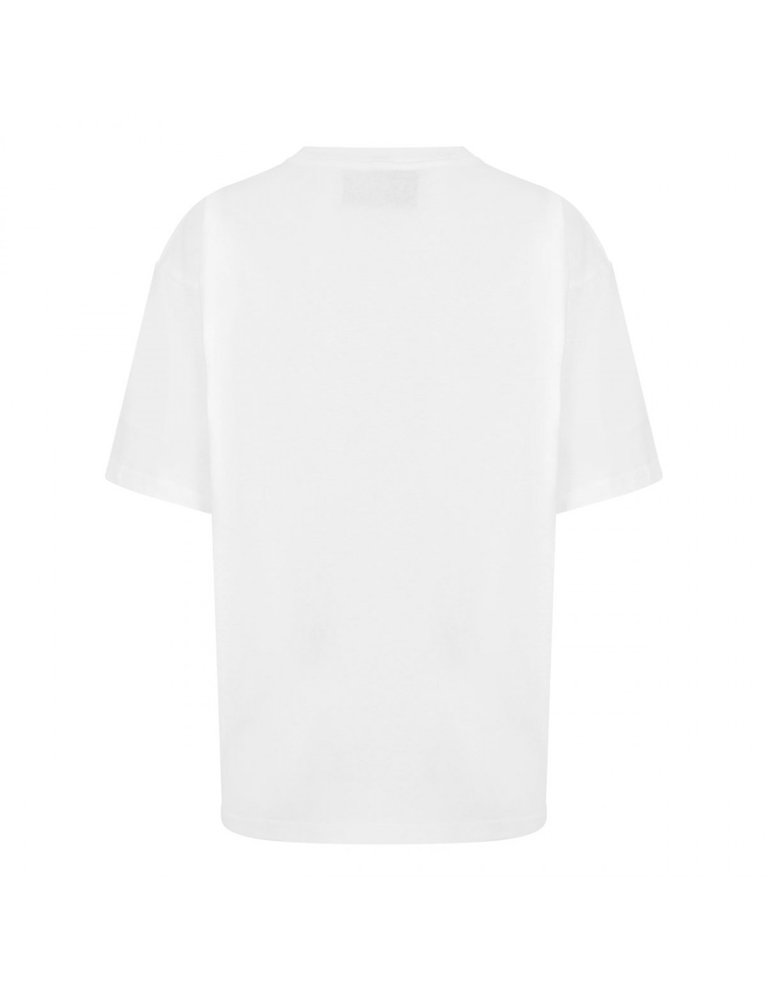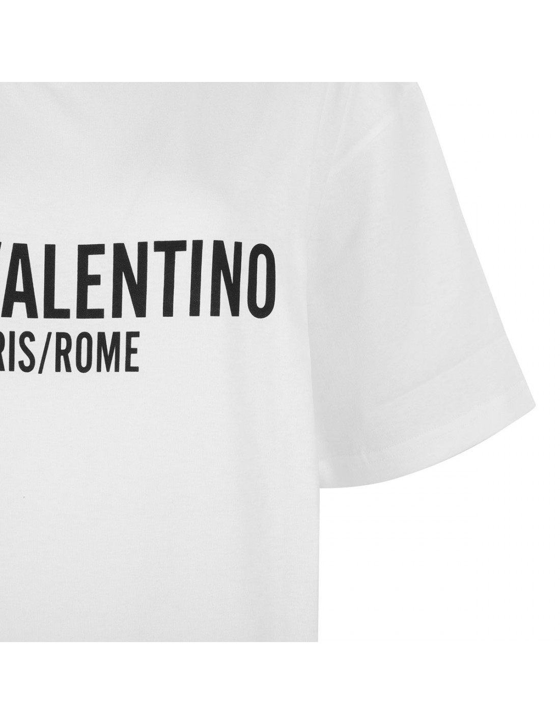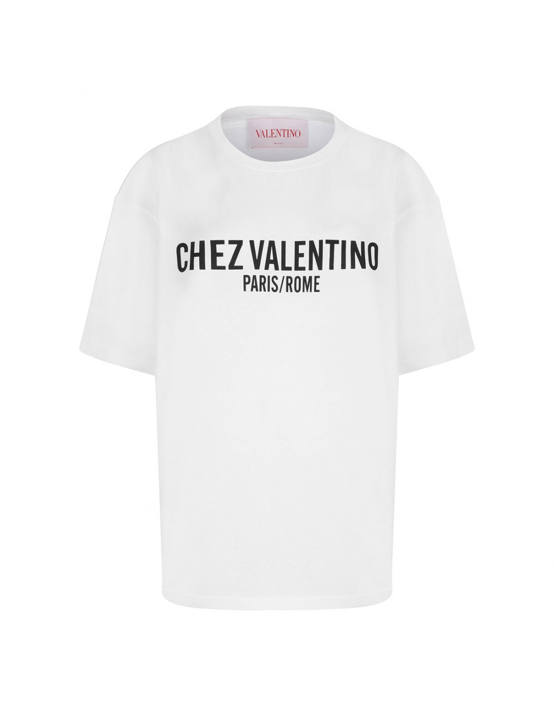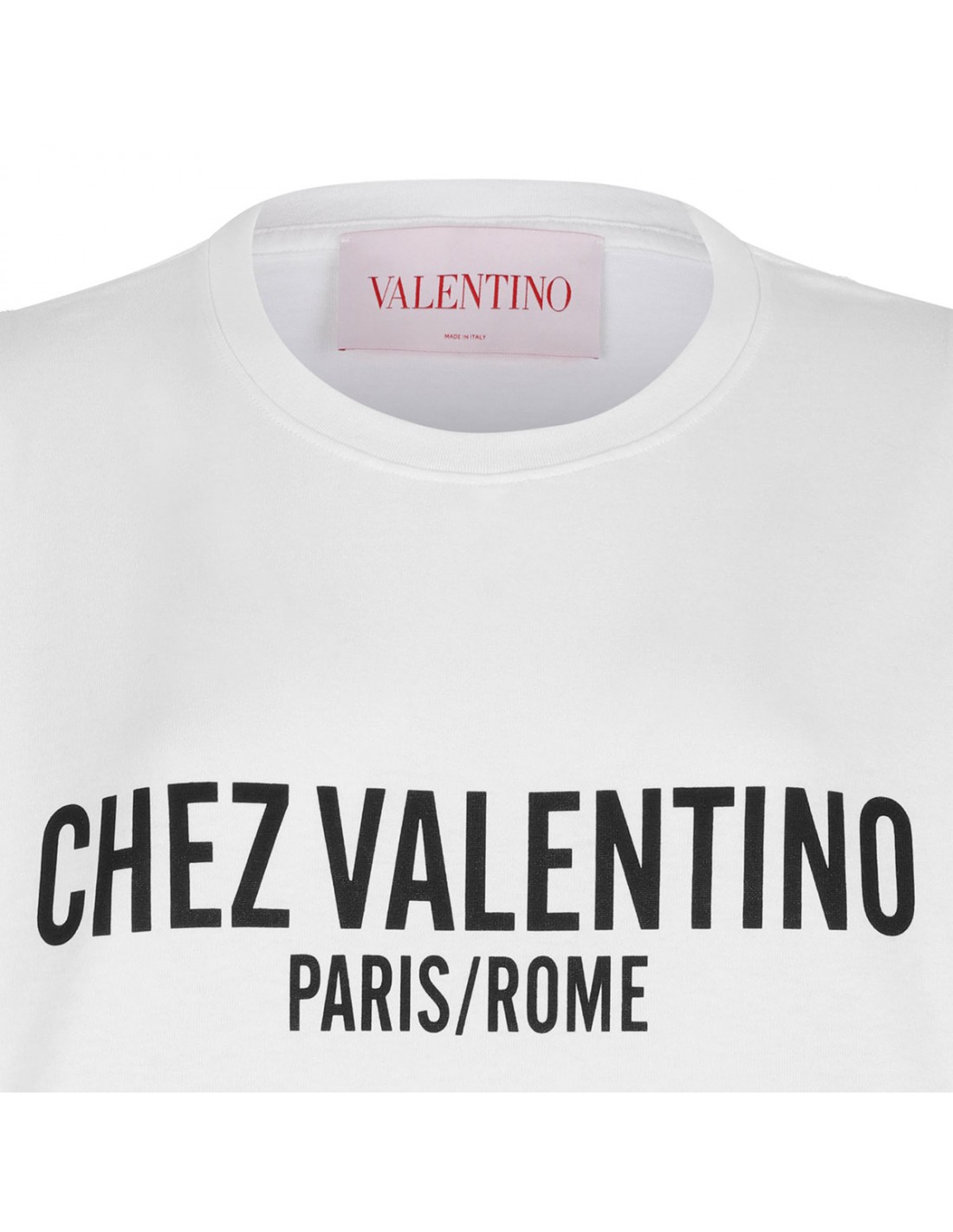 White jersey T-shirt from Valentino featuring contrasting Chez Valentino print on chest, ribbed crew neck, short sleeves.