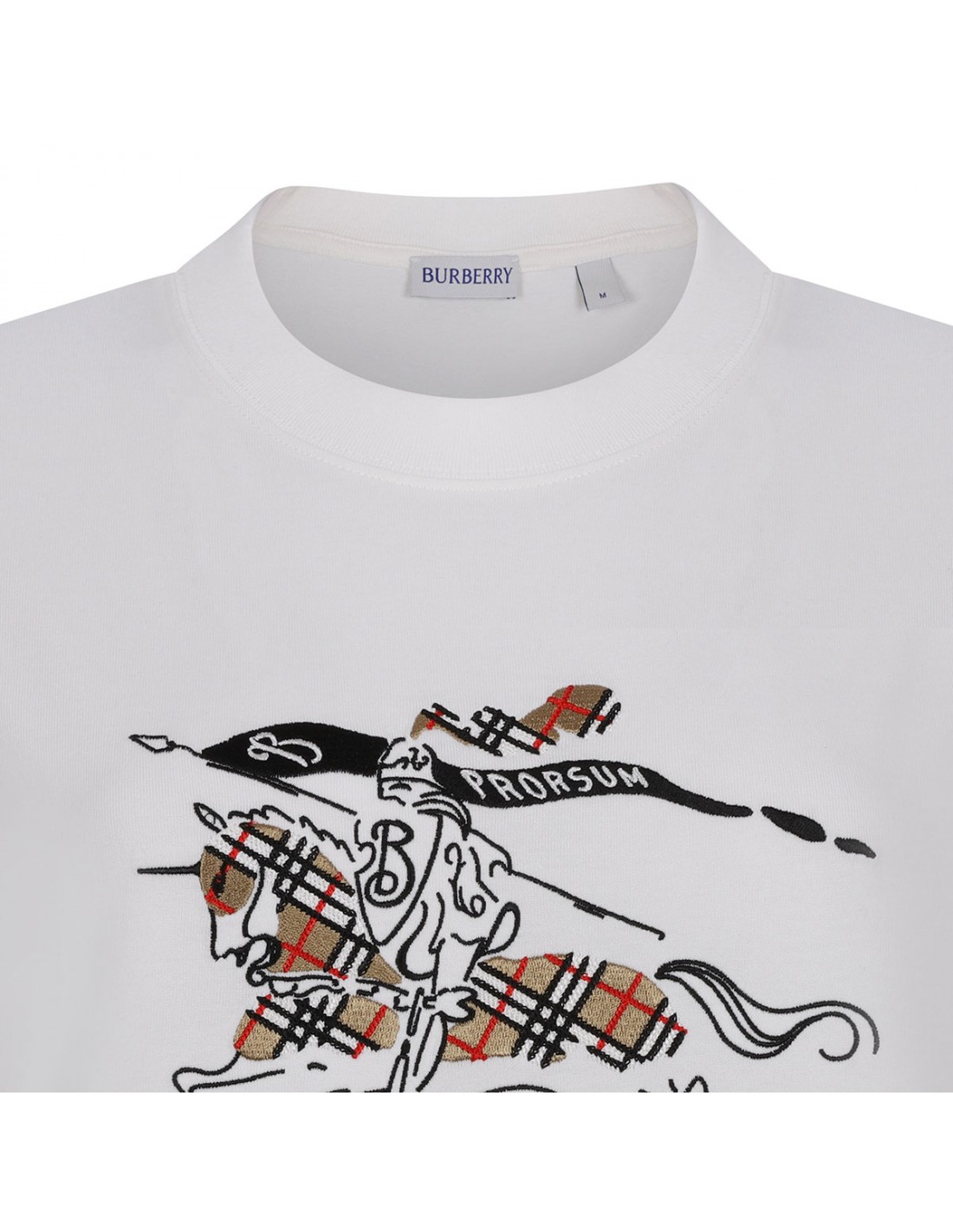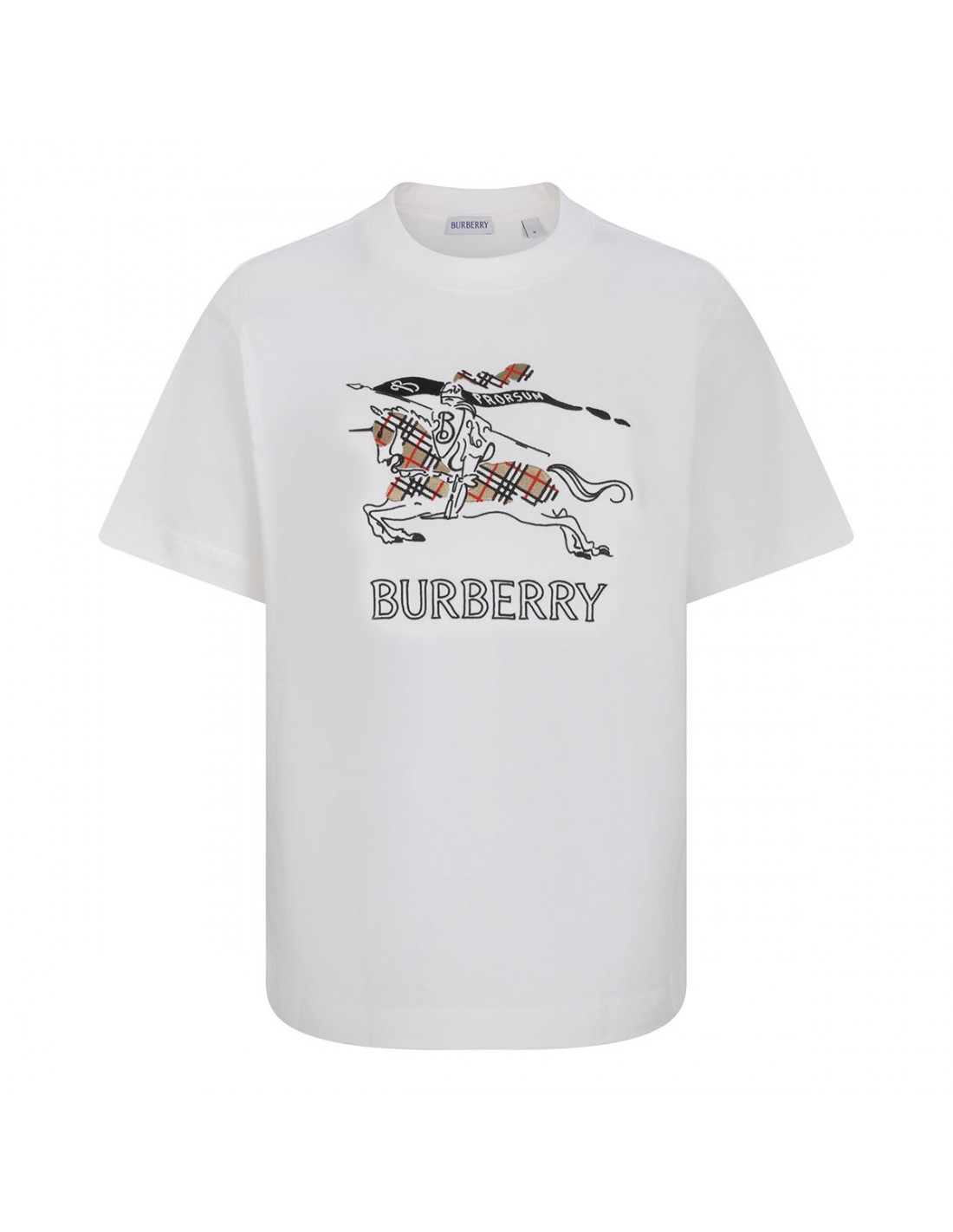 Chalk white cotton jersey T-shirt from Burberry featuring Equestrian Knight Design, and Burberry Check in chain-stitch embroidery, crew-neck, regular fit, short sleeves and rib-knit trims.