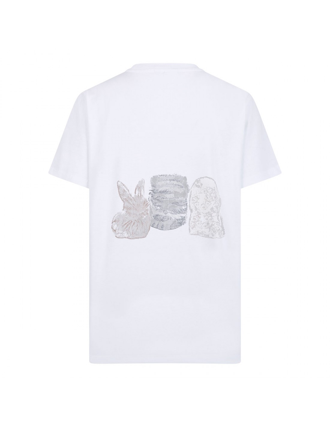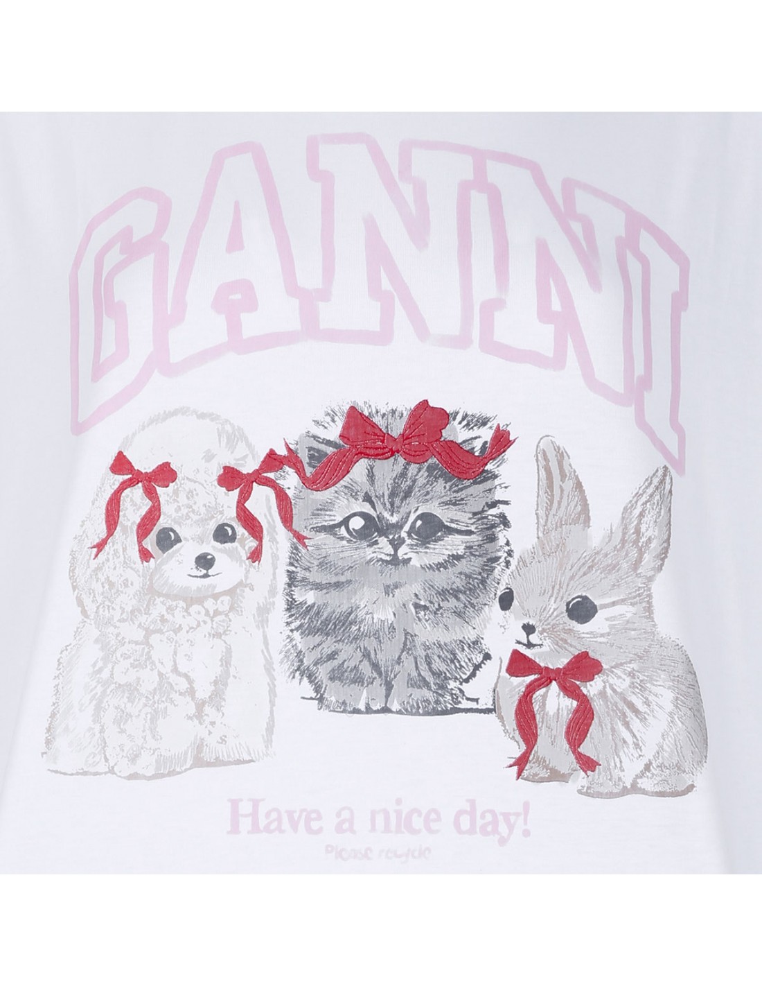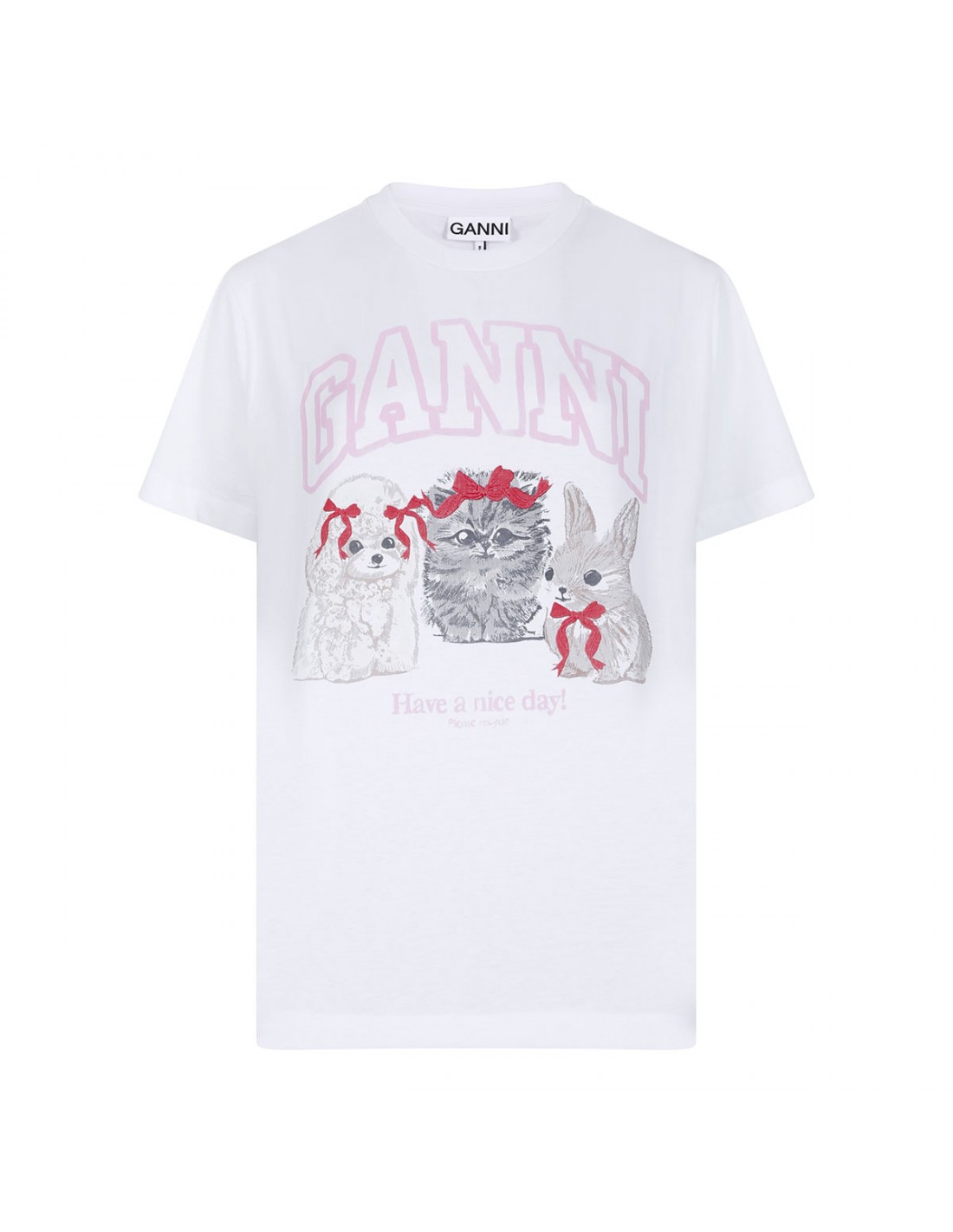 White cotton jersey T-shirt from Ganni featuring Have a nice day! Please recycle message, a round neckline, animal print and logo graphic, short sleeves, ribbed crew collar.