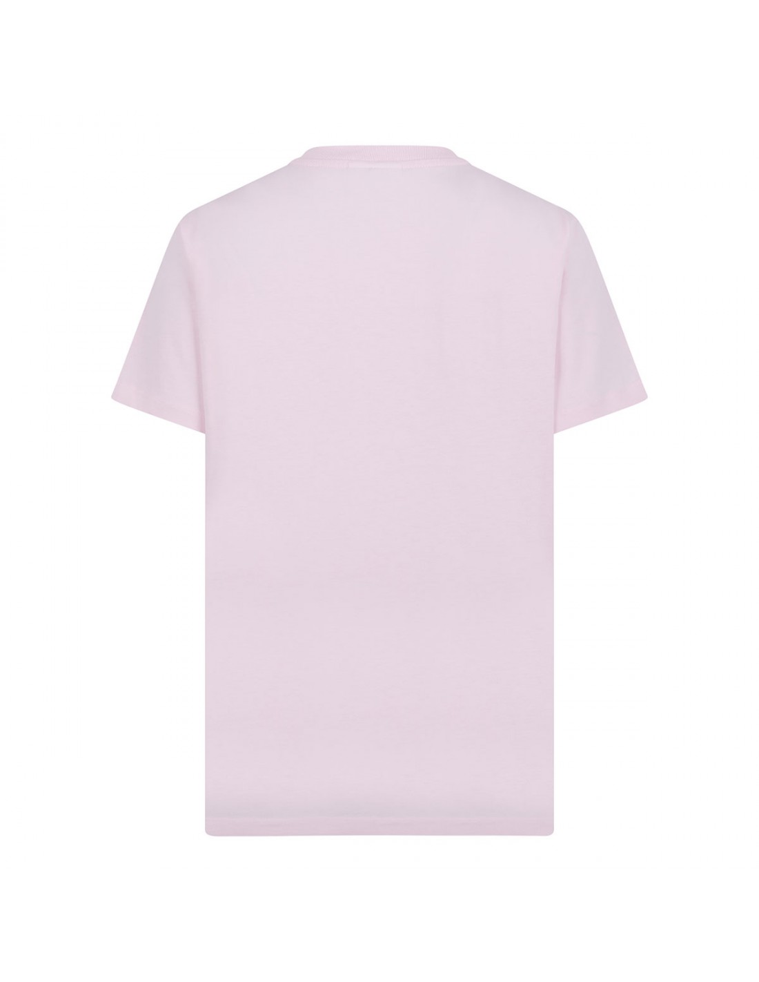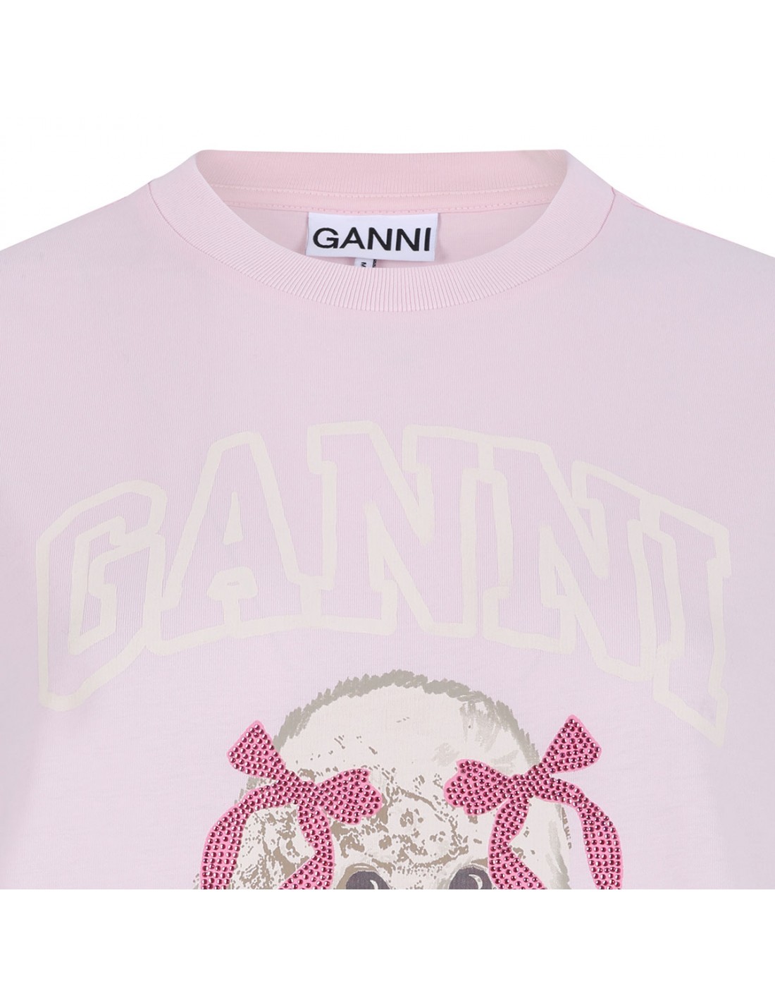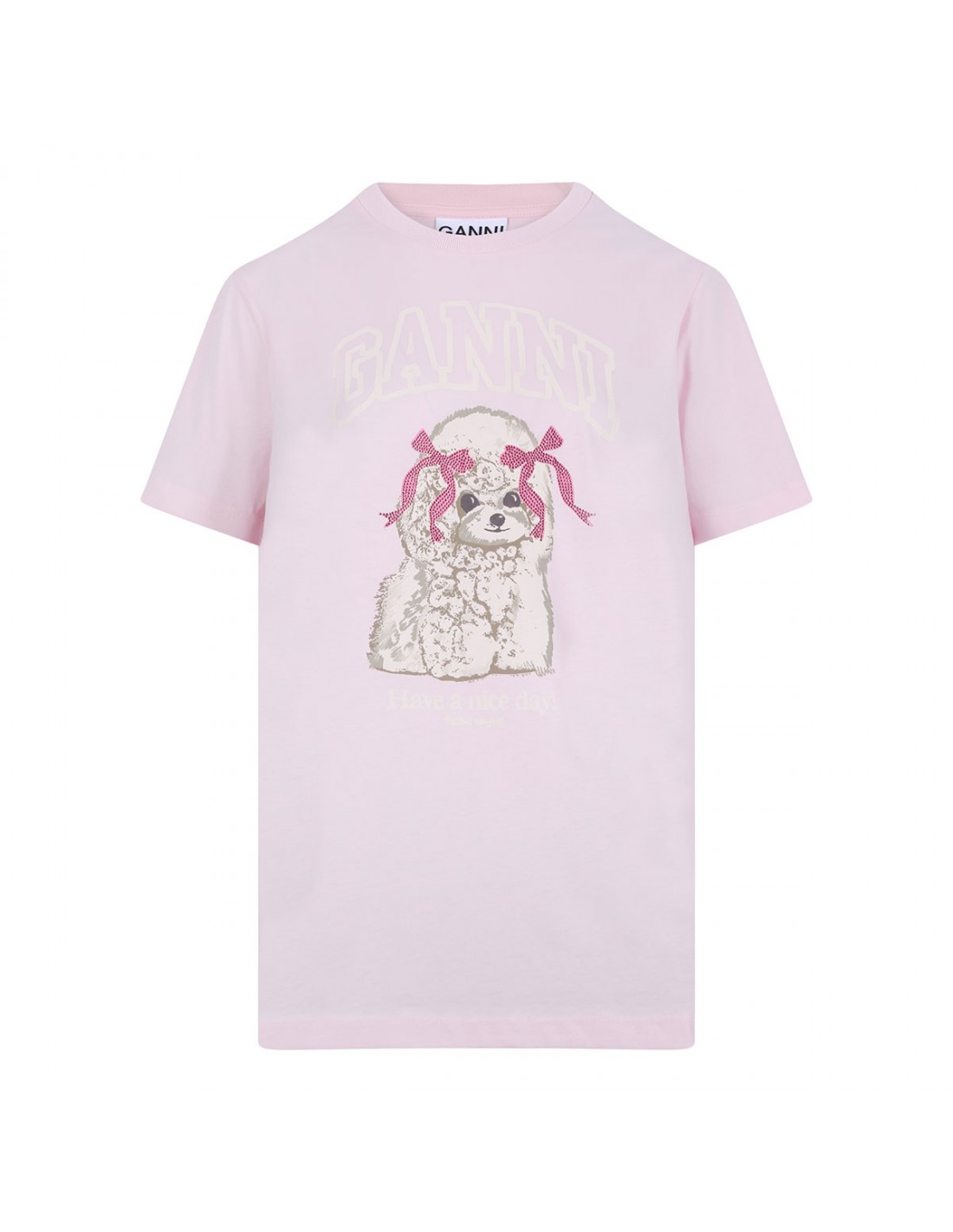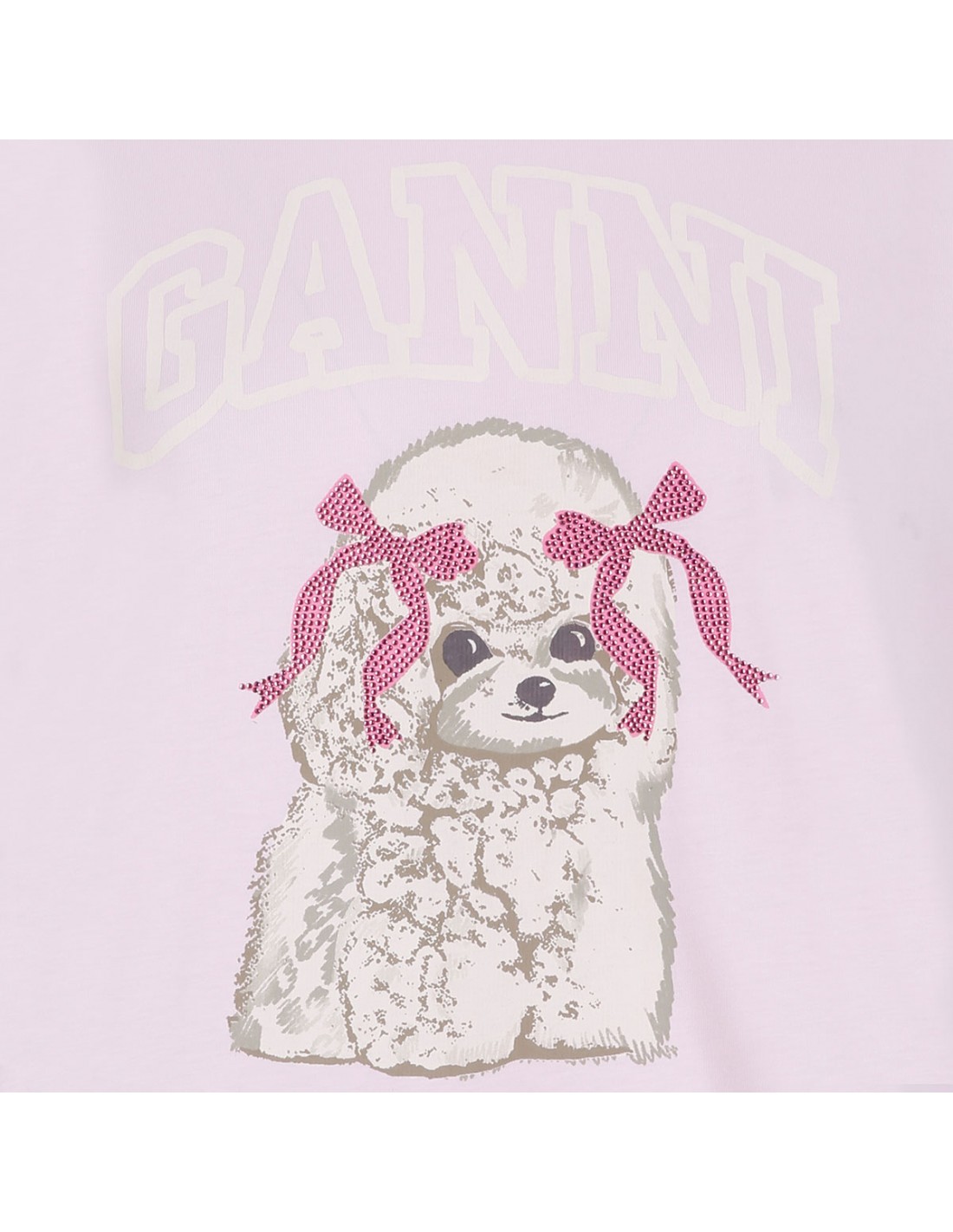 Chalk pink cotton jersey T-shirt from Ganni featuring Poodle print and logo graphic, short sleeves, ribbed round neckline.