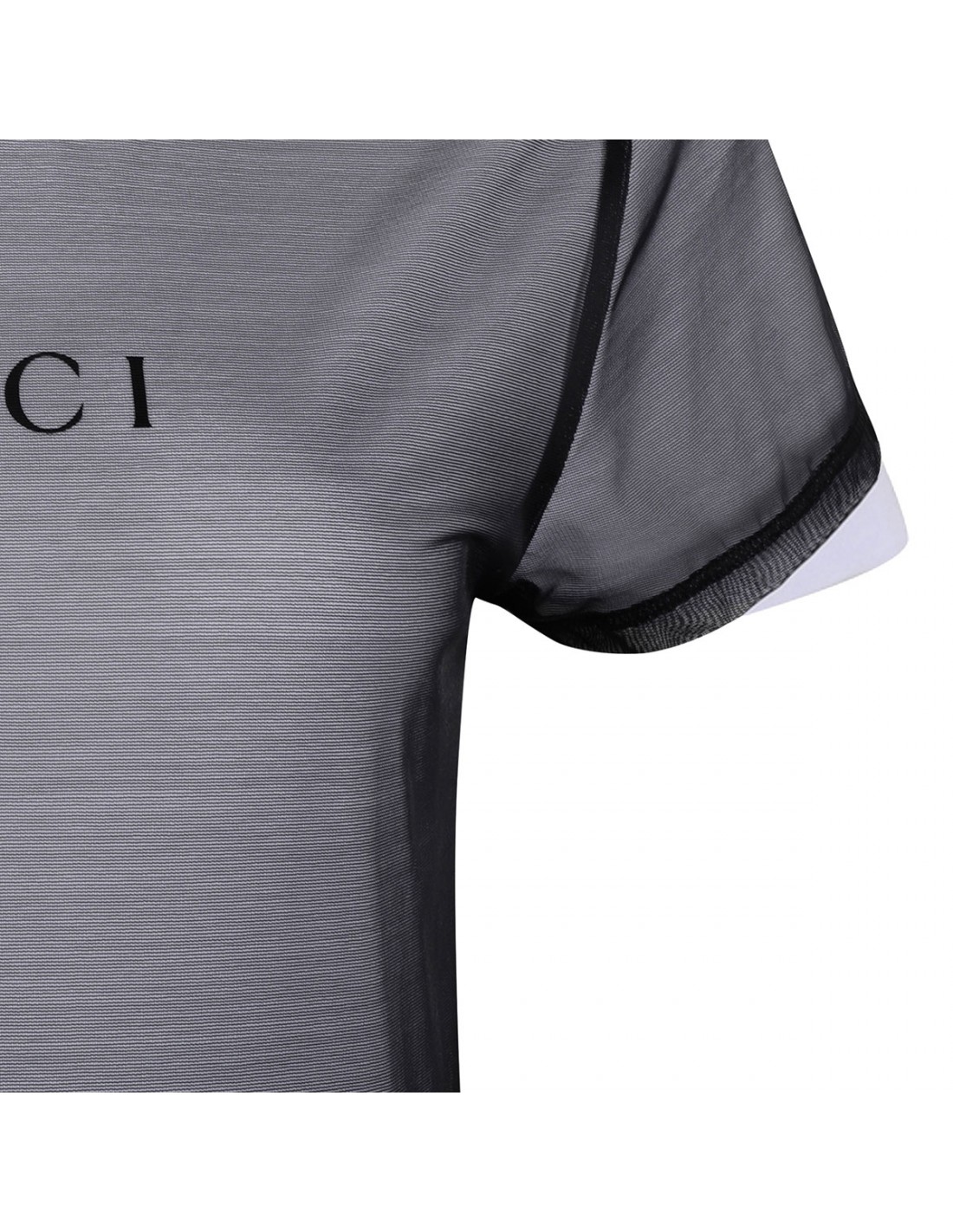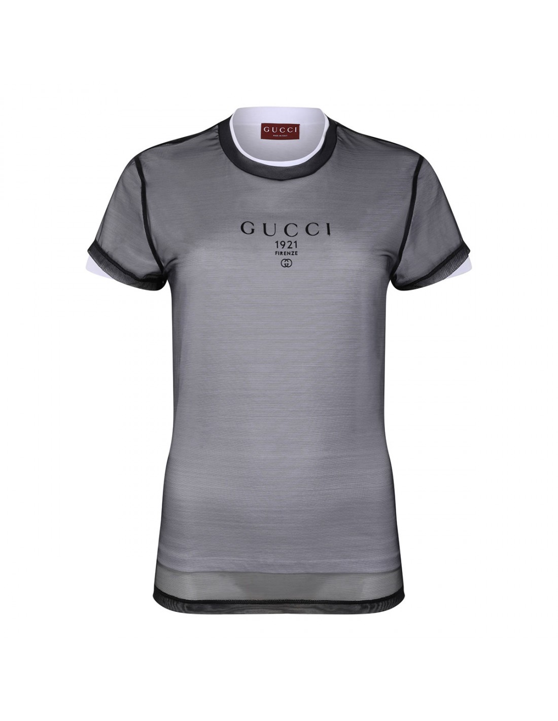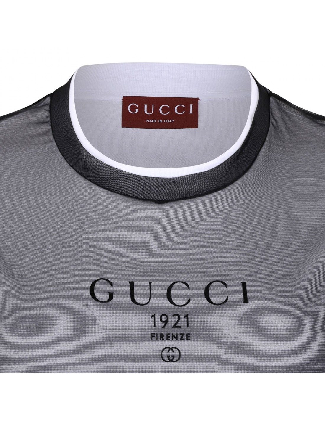 White and black double layered jersey T-shirt from Gucci featuring Gucci 1921 Firenze and interlocking G print on chest, crew neck and short sleeves.