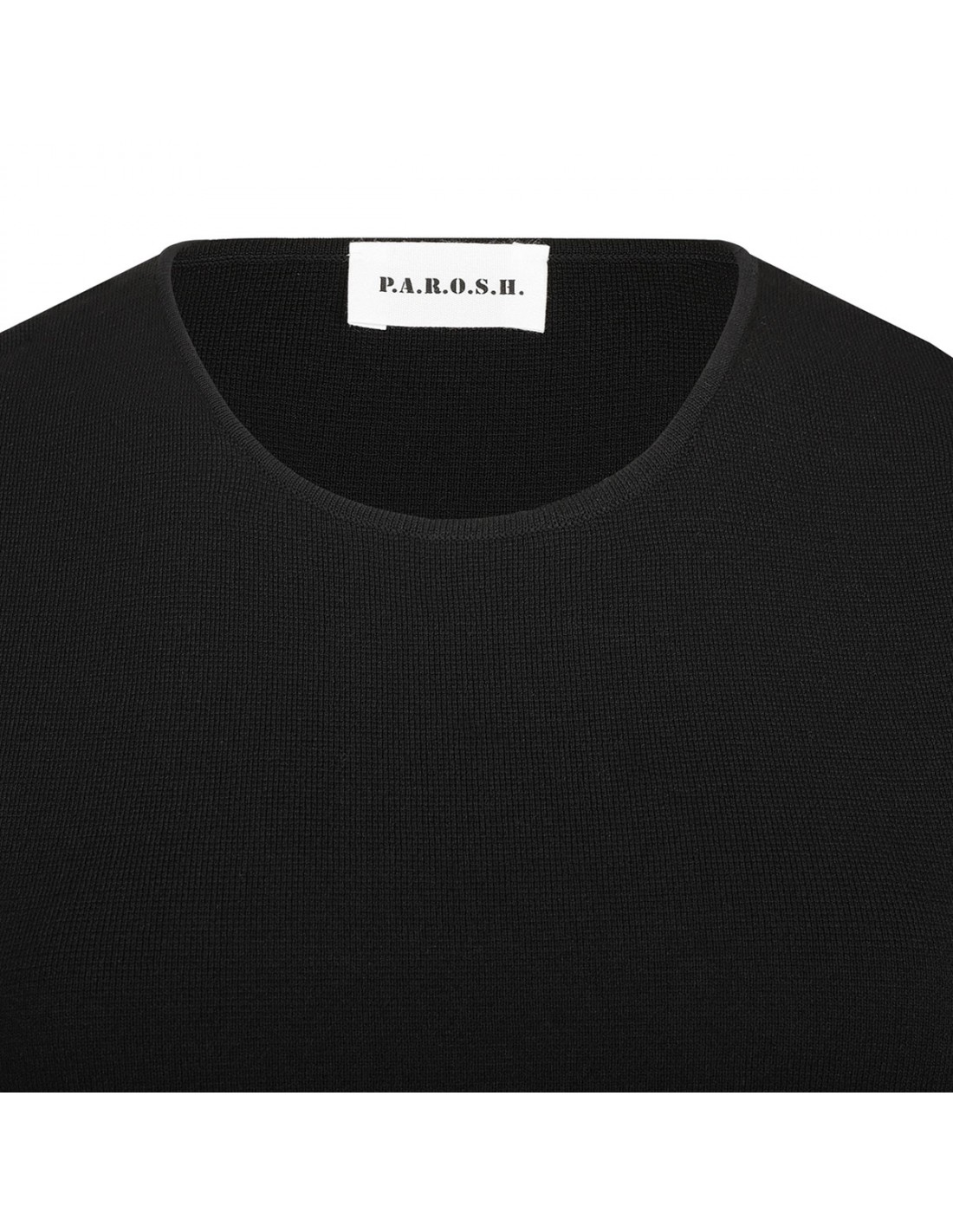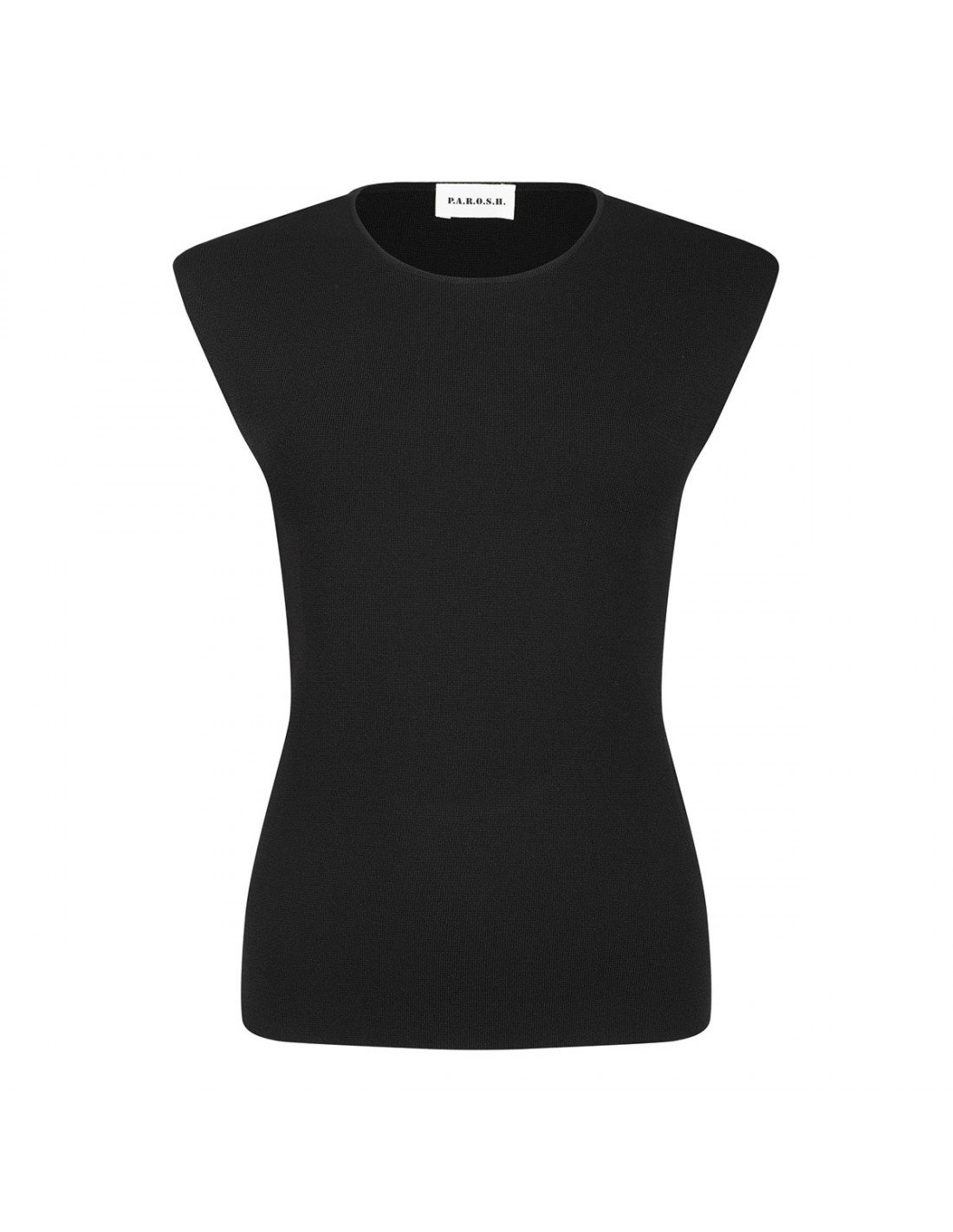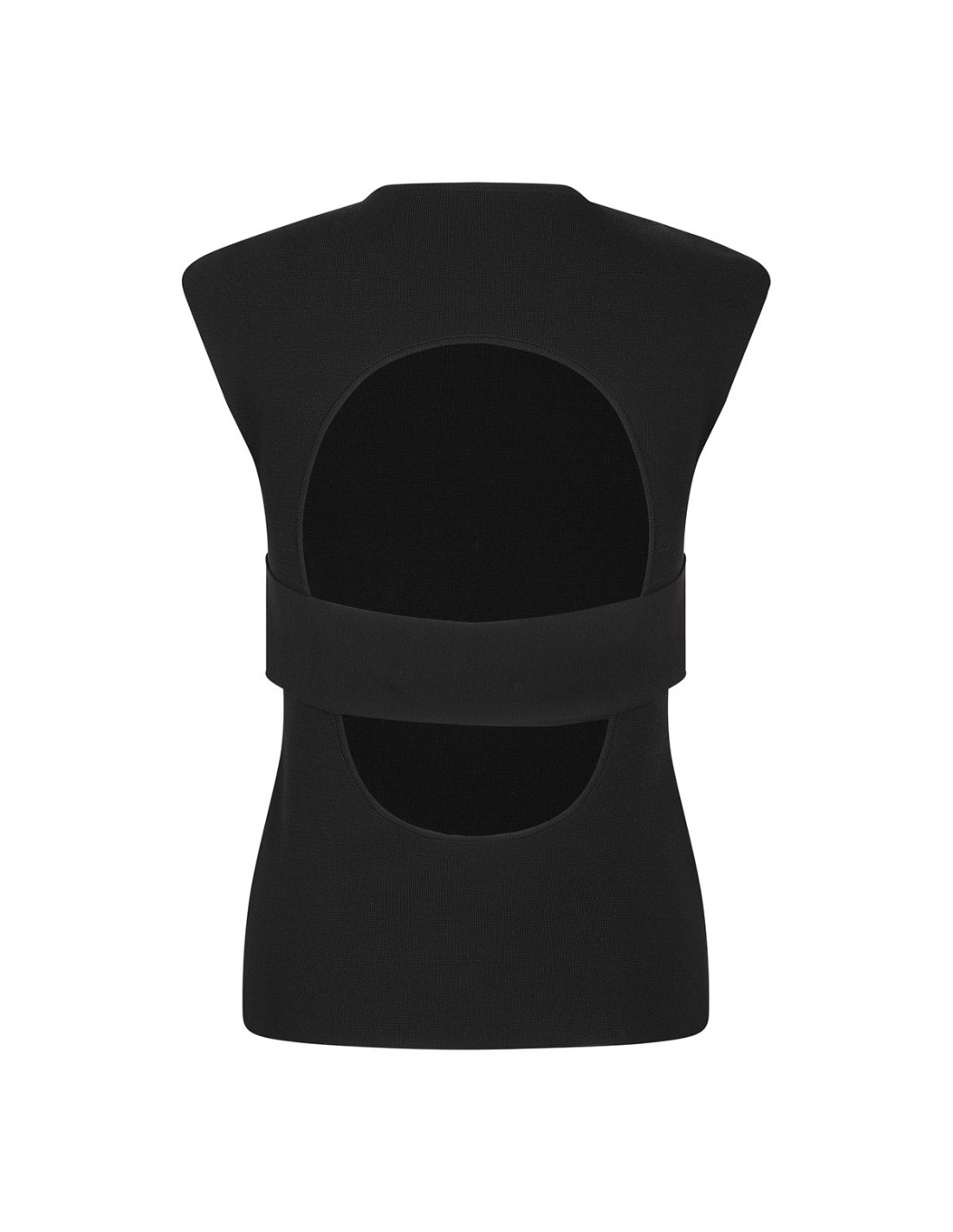 Black knit viscose blend top from PAROSH featuring open back with band detail, sleeveless silhouette, crew collar.
