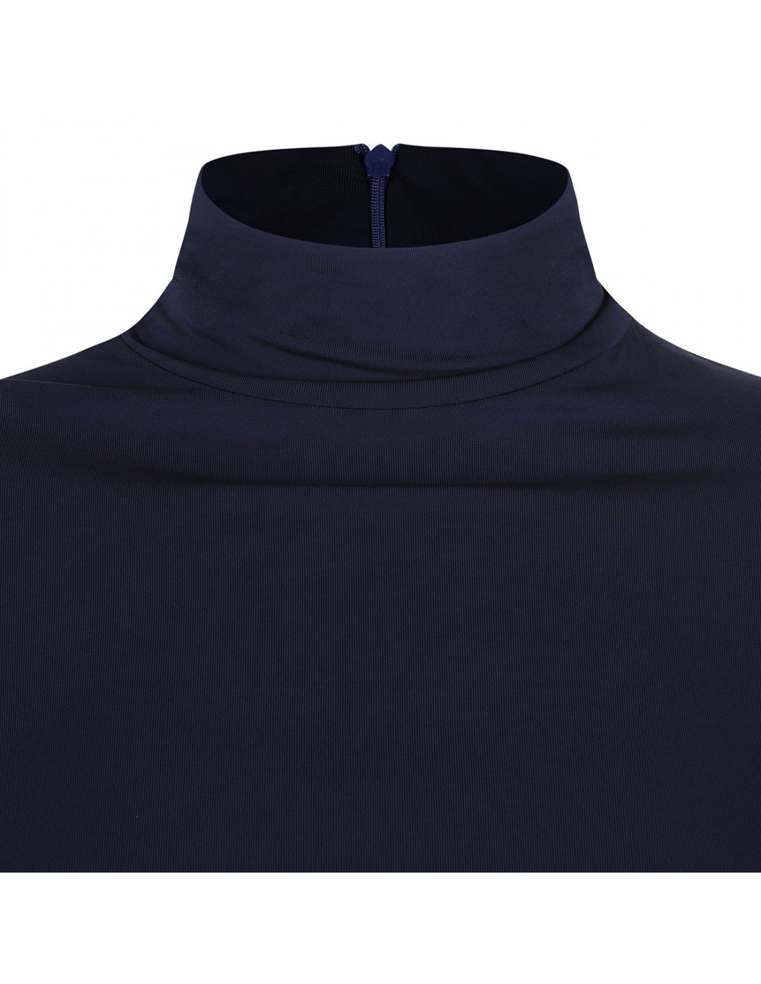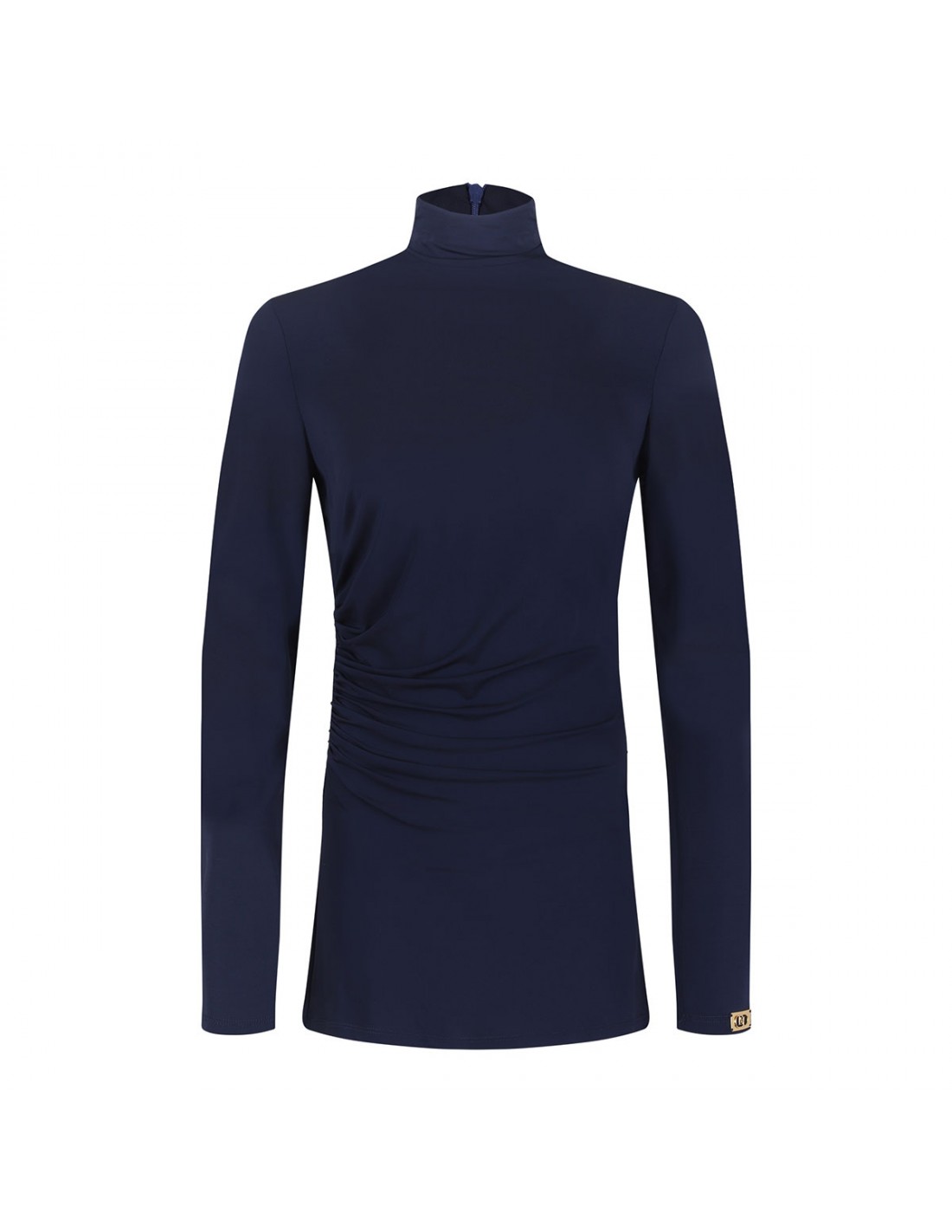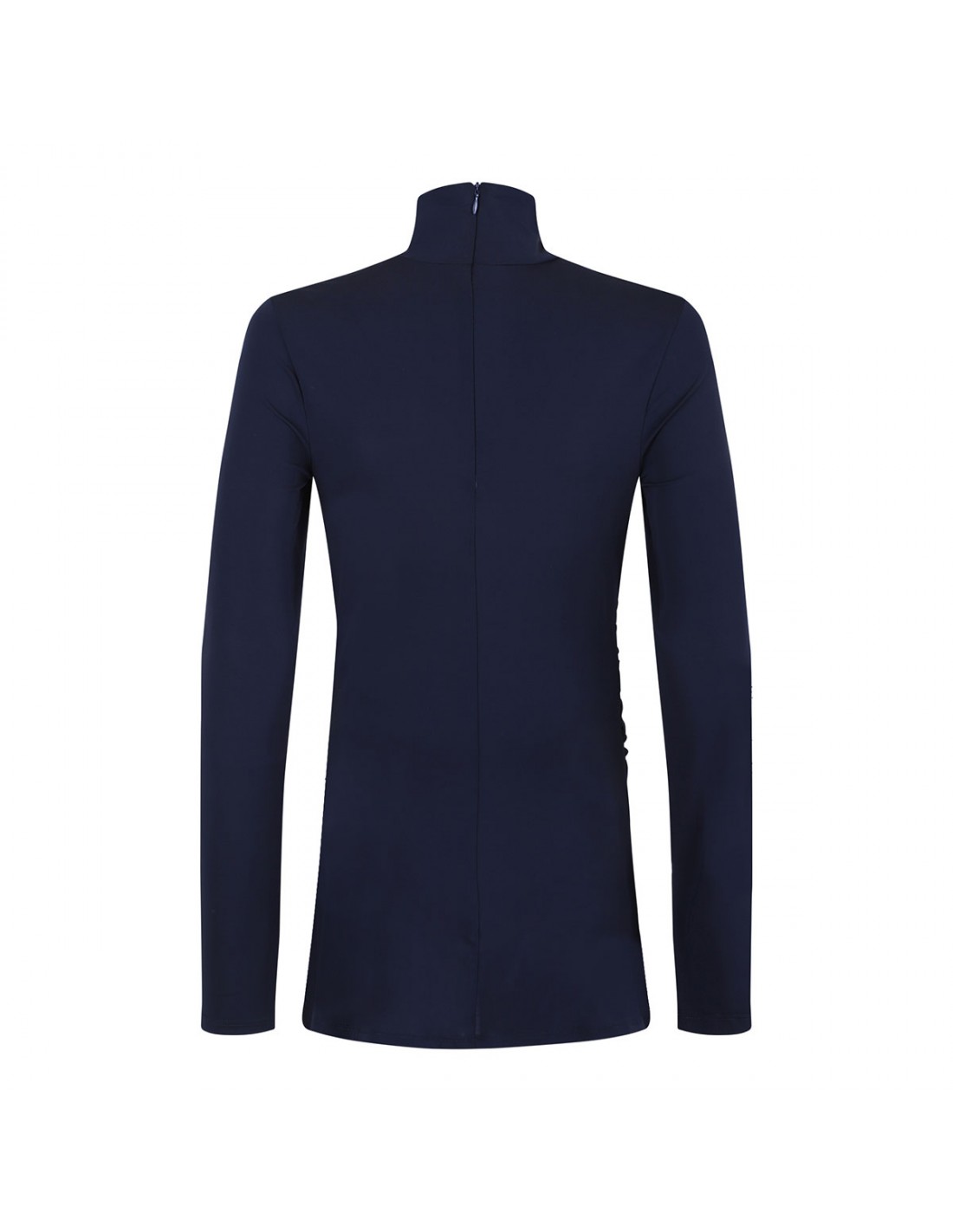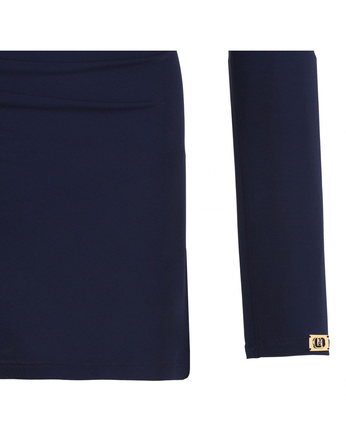 Oltremare blue lightweight jersey top from Elisabetta Franchi featuring draping on one side, turtleneck, long sleeves, small golden metal logo plaque, slim fit.