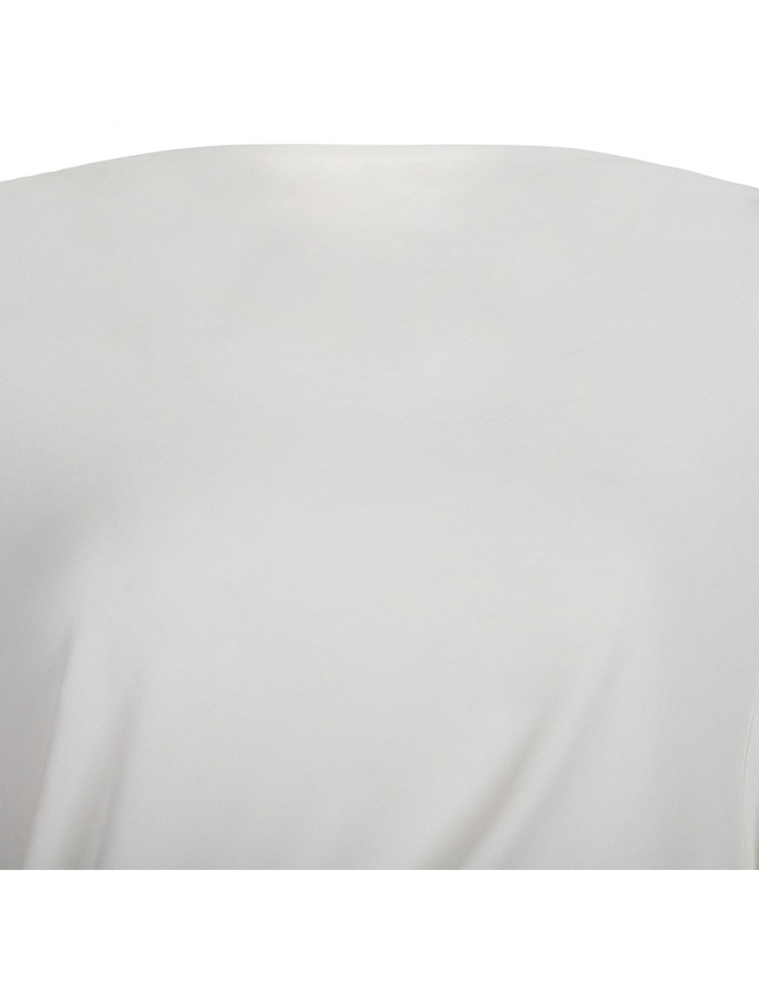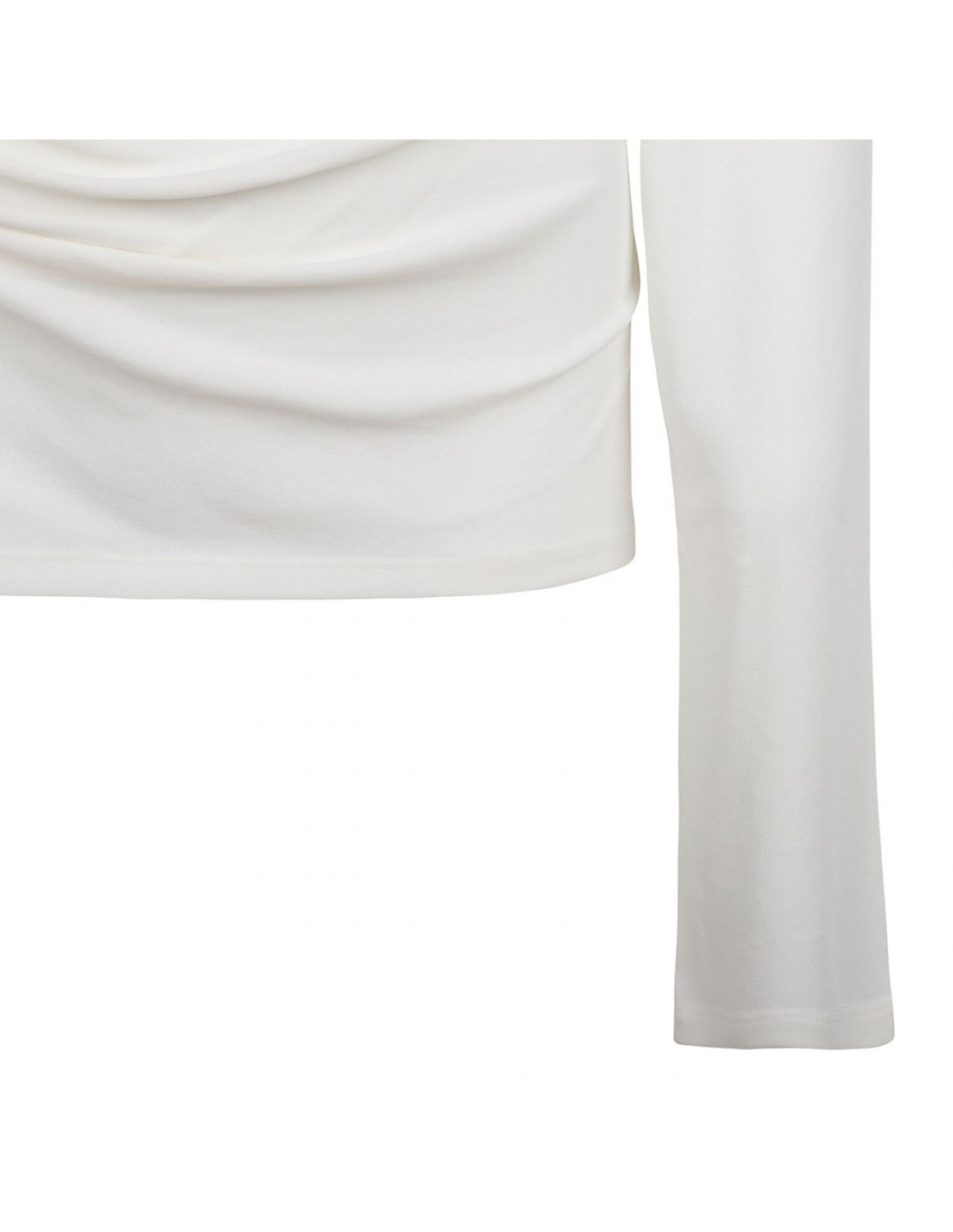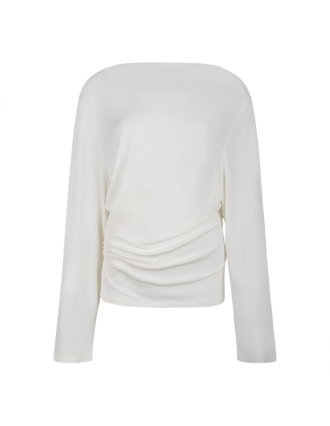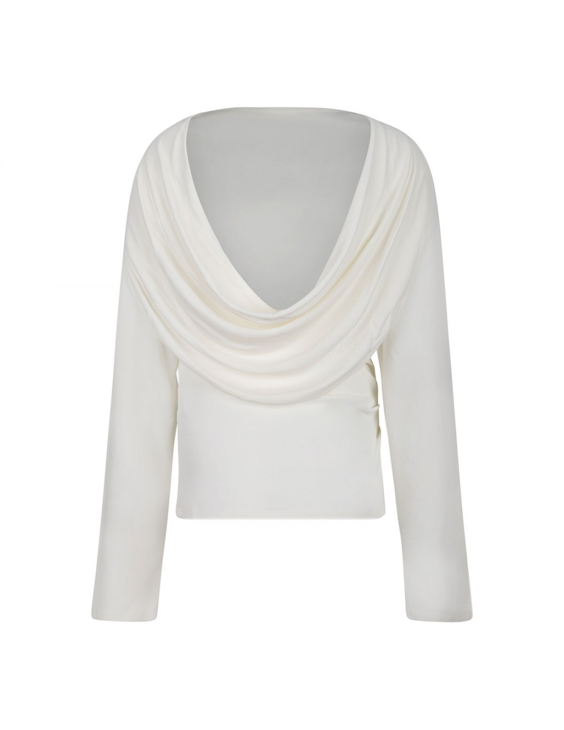 White fluid crepe jersey The Croisière top from Jacquemus featuring draped open back, long sleeves, draped waist, boat neckline, relaxed silhouette.
