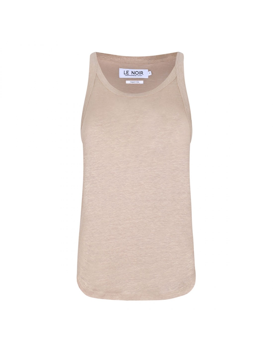 Ginger gold hue linen Mattea tank top from Le Noir featuring U-neck, sleeveeless silhouette and rounded hem.