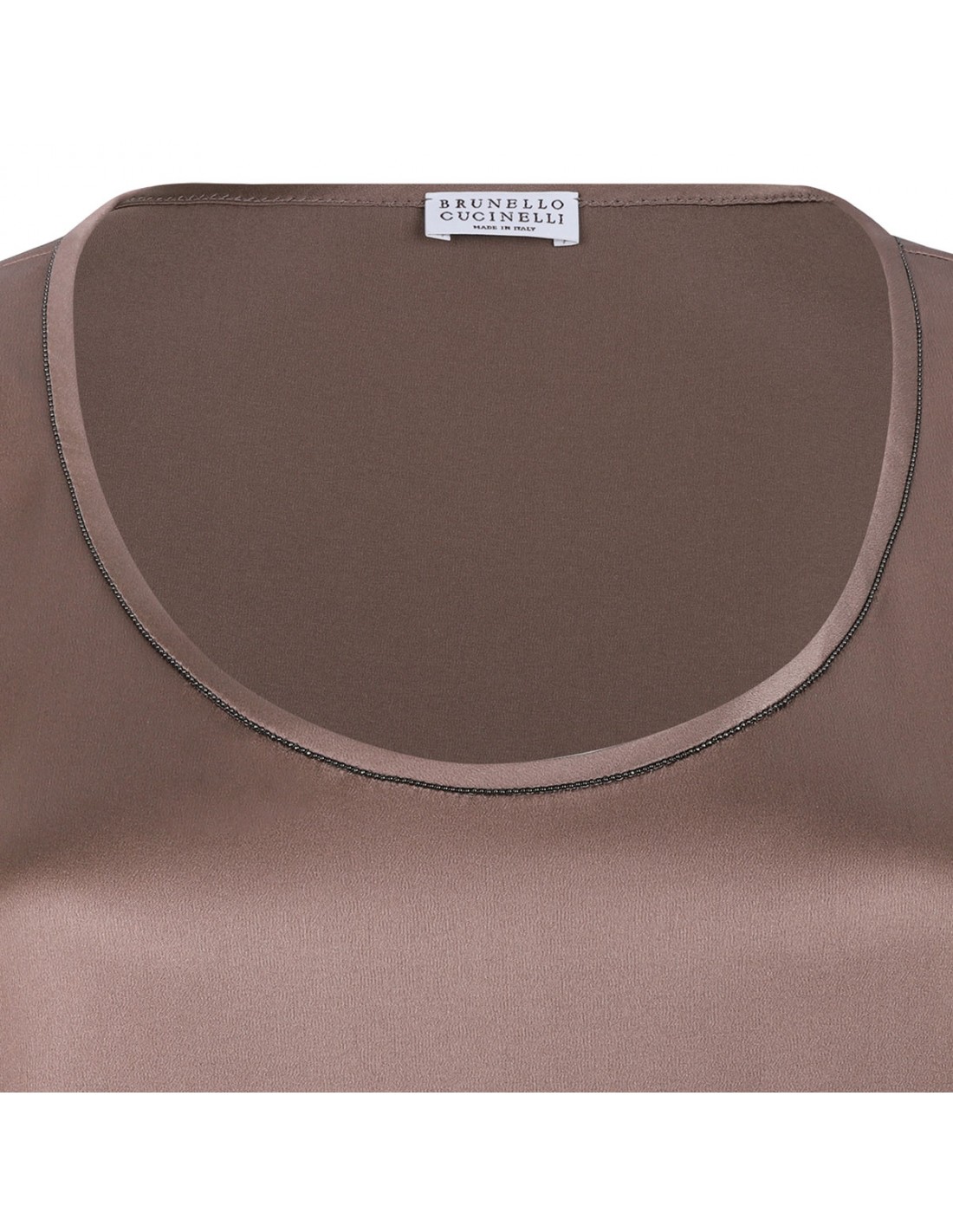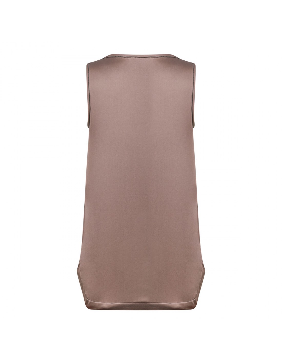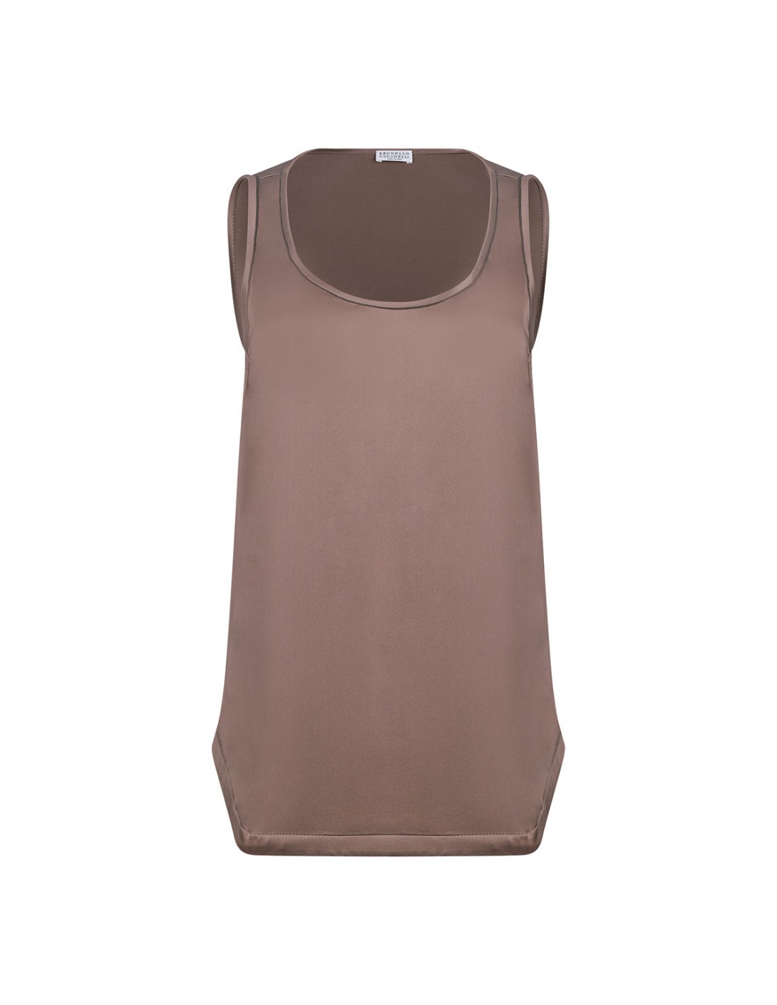 Cocoa silk satin tank top from Brunello Cucinelli featuring trims embellished with signature monili detail, U-neck, sleeveless silhouette.