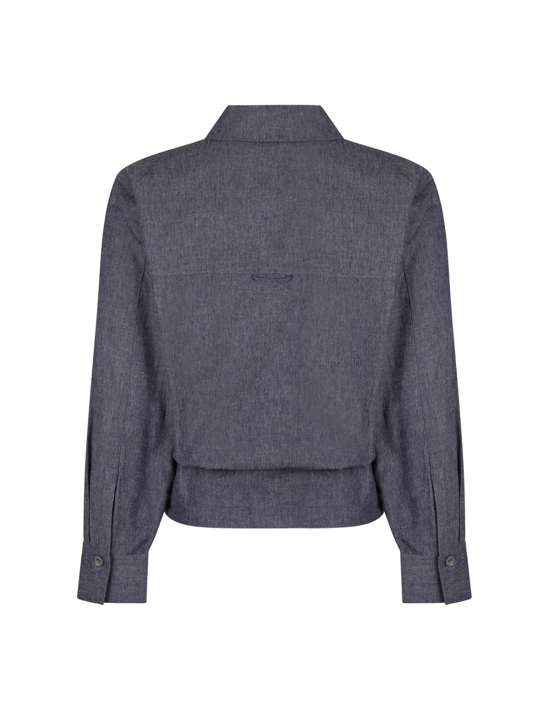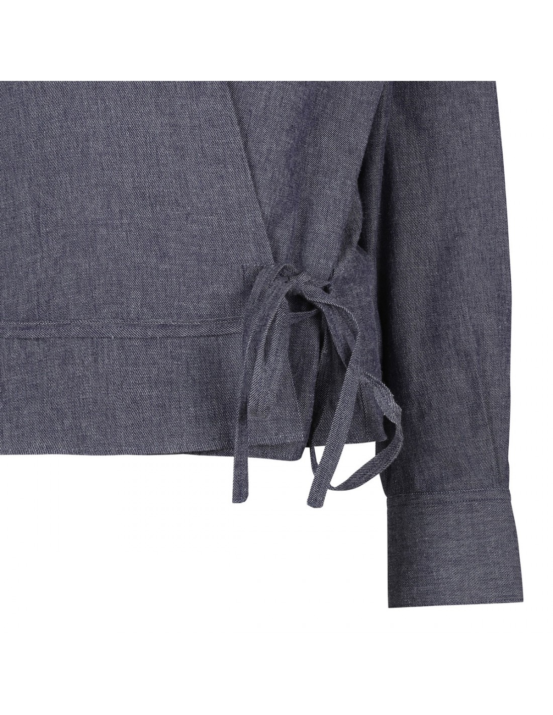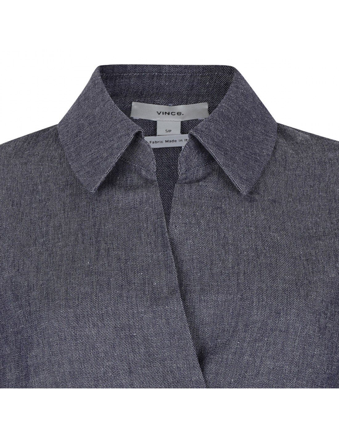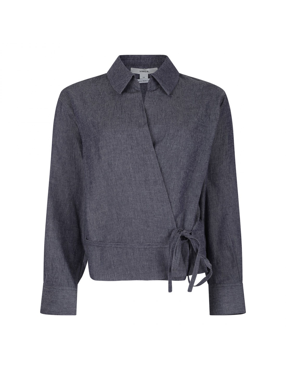 Mid indigo blue viscose-blend twill wrap top from Vince featuring pointed collar, V neck, self-tie at side, long sleeves with buttoned cuffs, shoulder yoke and locker loop at back.